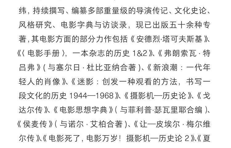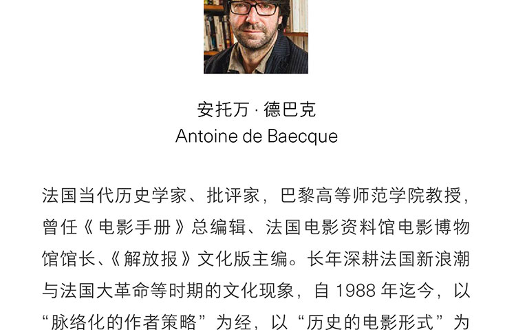 安托万·德巴克(Antoine de Baecque),法国当代历史学家、批评家,巴黎高等师范学院教授,曾任《电影手册》总编辑、法国电影资料馆电影博物馆馆长、《解放报》文化版主编。长年深耕法国新浪潮与法国大革命等时期的文化现象,自1988年迄今,以“脉络化的作者策略”为经,以“历史的电影形式”为纬,持续撰写、编纂多部重量级的导演传记、文化史论、风格研究、电影字典与访谈录,现已出版五十余种专著,其电影方面的部分力作包括《安德烈·塔可夫斯基》、《〈电影手册〉,一本杂志的历史1&2》、《弗朗索瓦·特吕弗》(与塞尔日·杜比亚纳合著)、《新浪潮:一代年轻人的肖像》、《迷影:创发一种观看的方法,书写一段文化的历史 1944—1968》、《摄影机—历史论》、《戈达尔传》、《电影思想字典》(与菲利普·瑟瓦里耶合编)、《侯麦传》(与诺尔·艾柏合著)、《让—皮埃尔·梅尔维尔传》、《电影死了,电影万岁!摄影机—历史论2》、《夏布洛尔传》等。