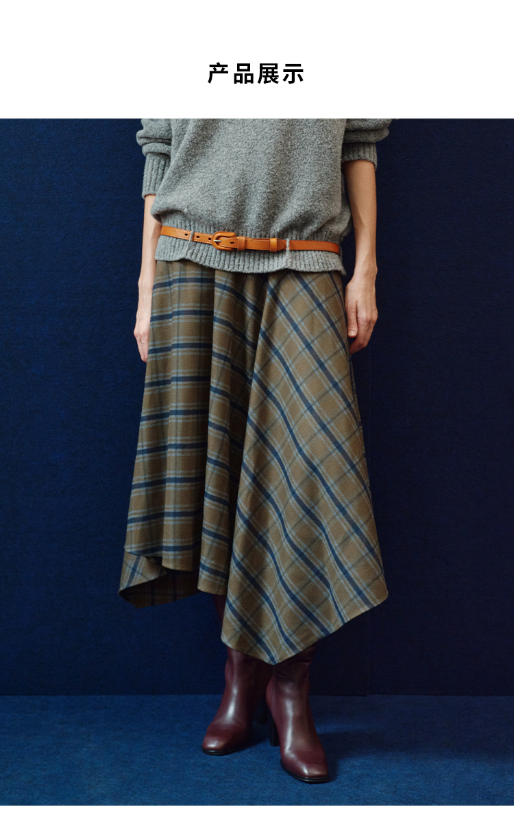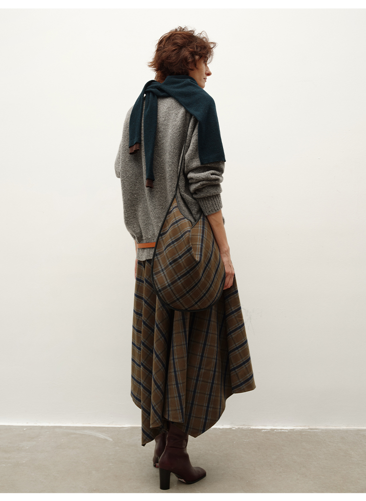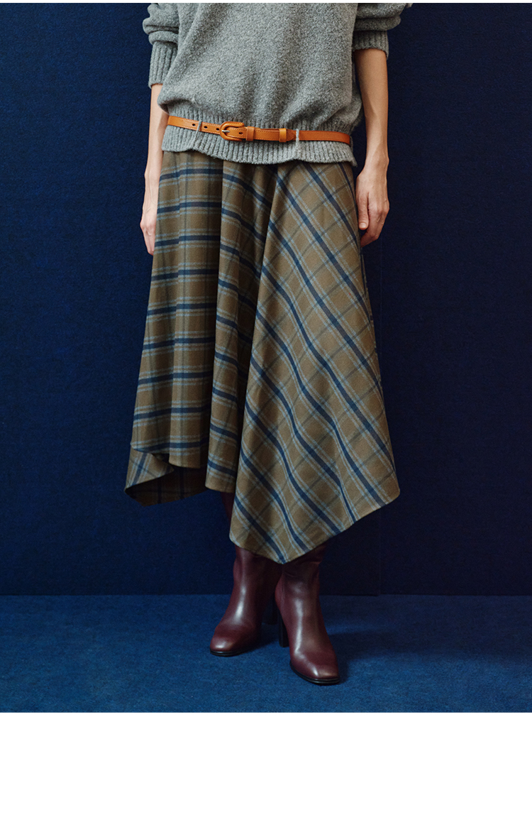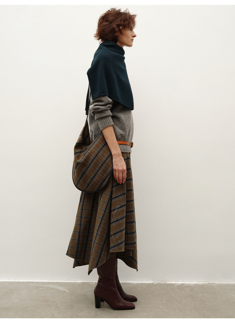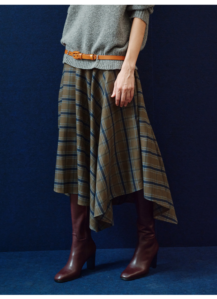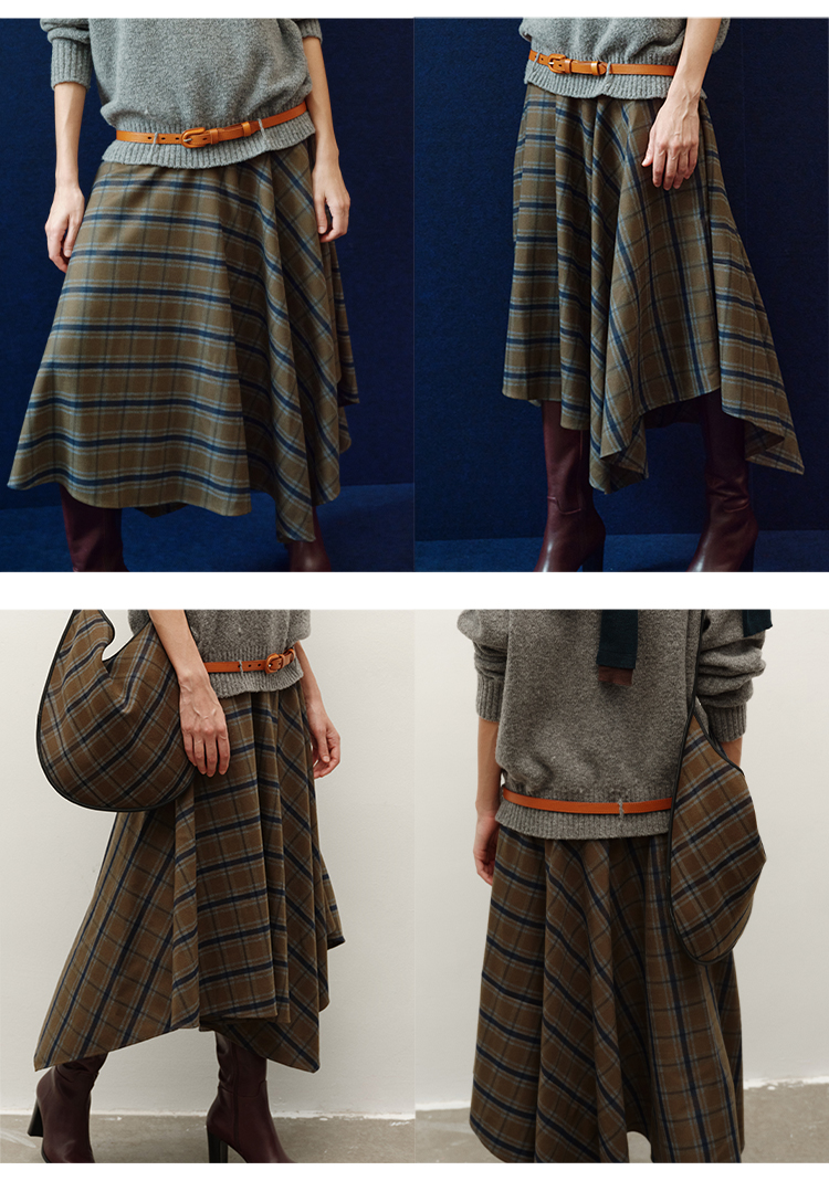 HIDEMI 极简色织格纹拉绒不对称伞状半身裙