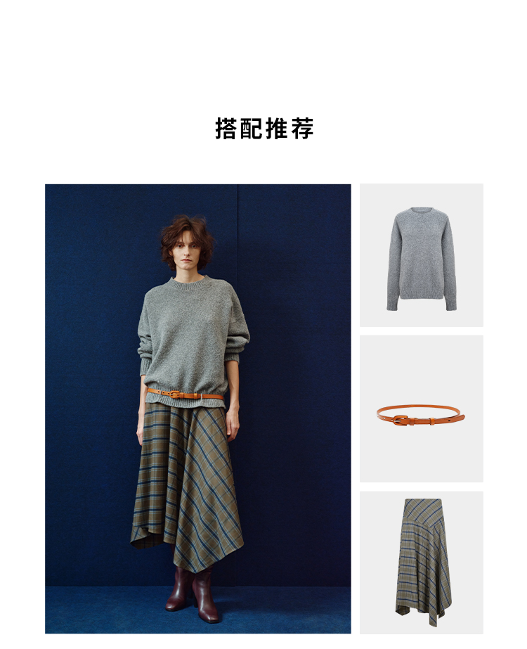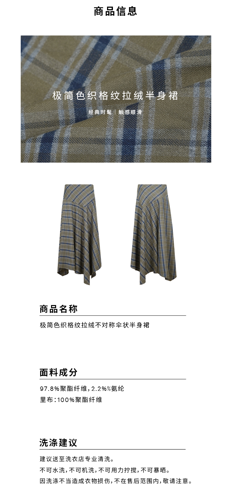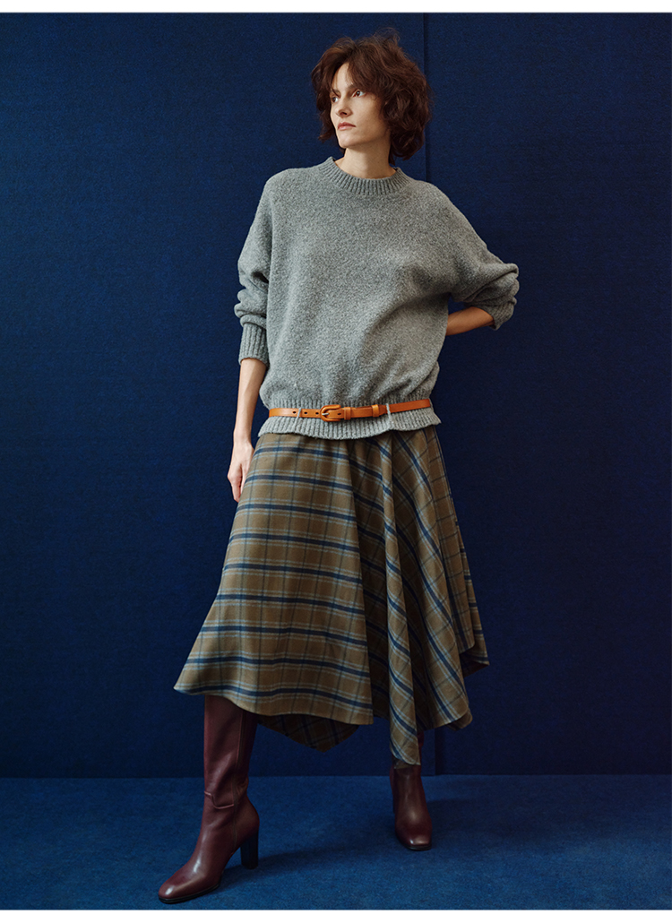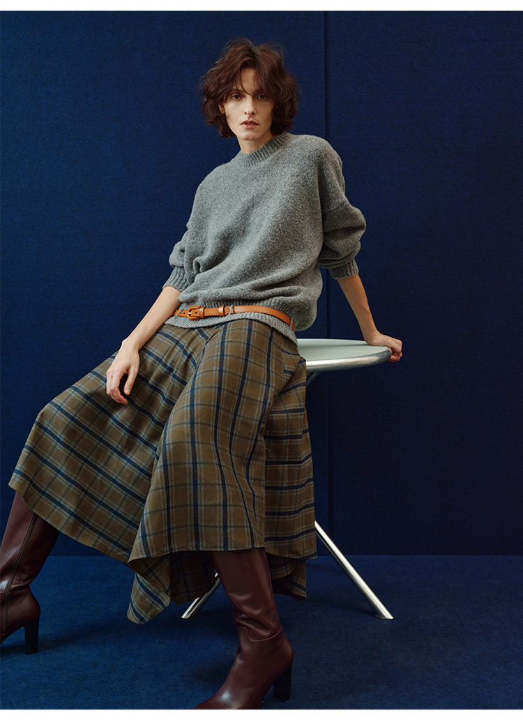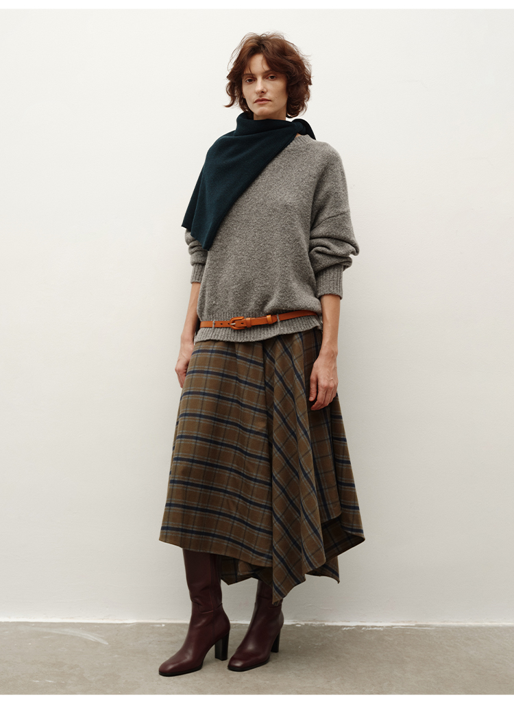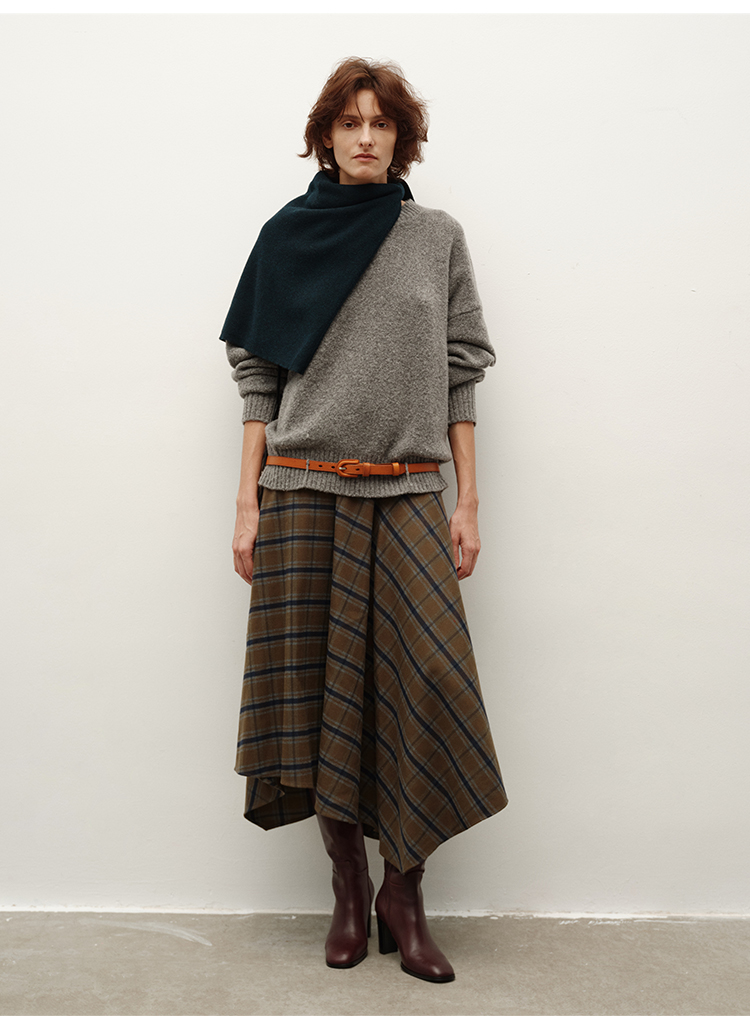 HIDEMI 极简色织格纹拉绒不对称伞状半身裙