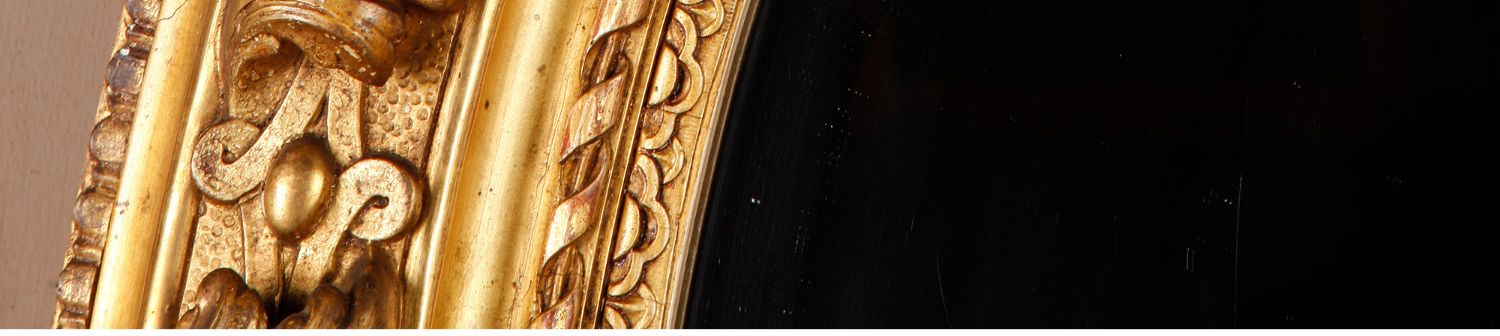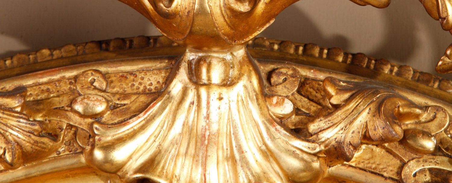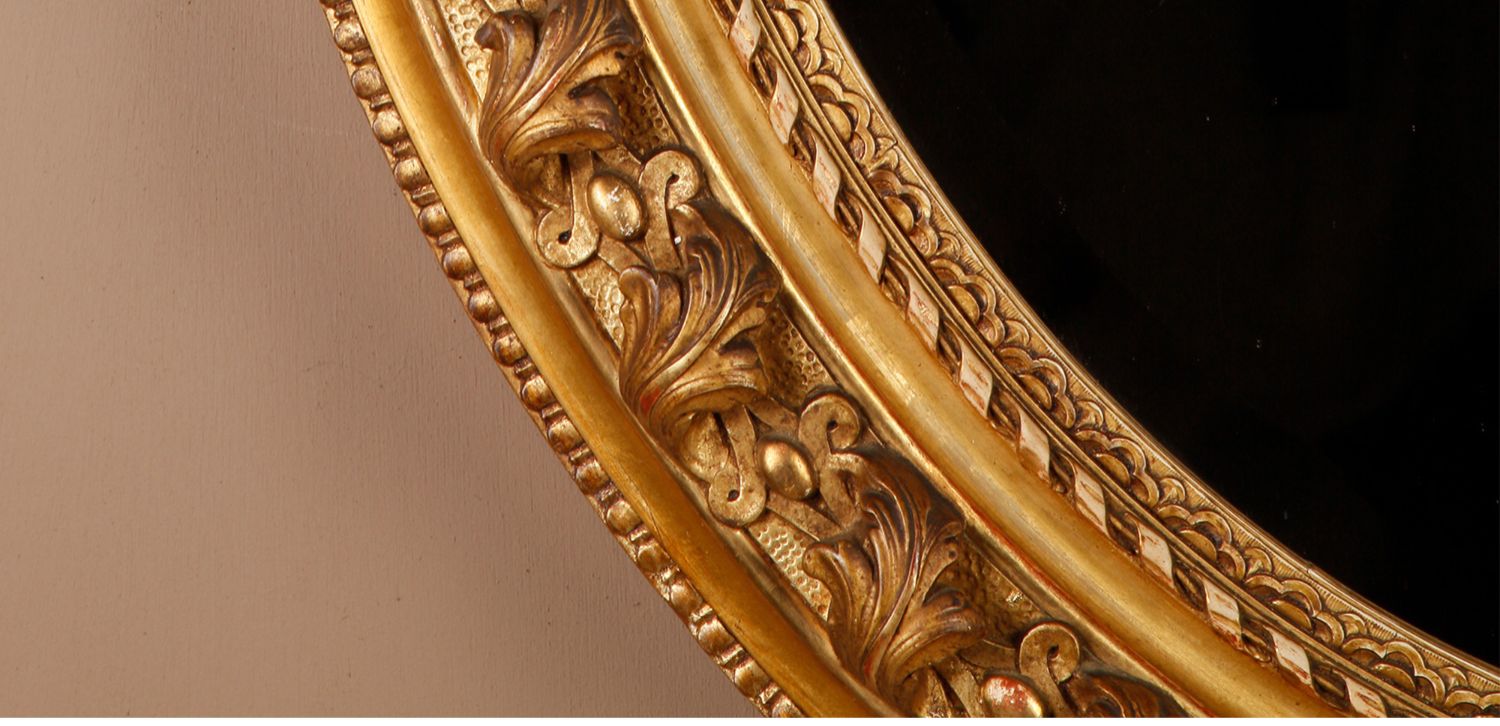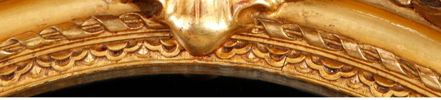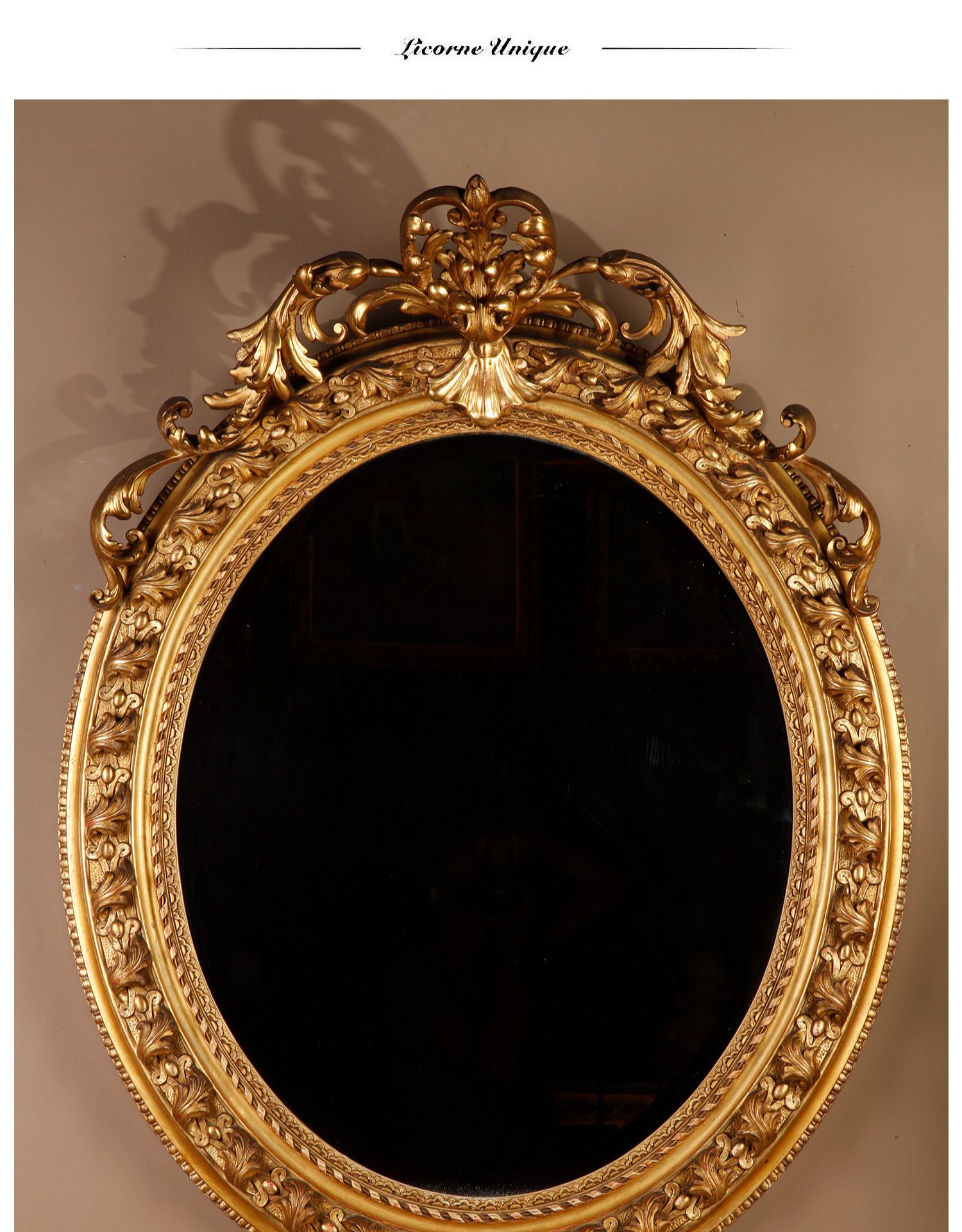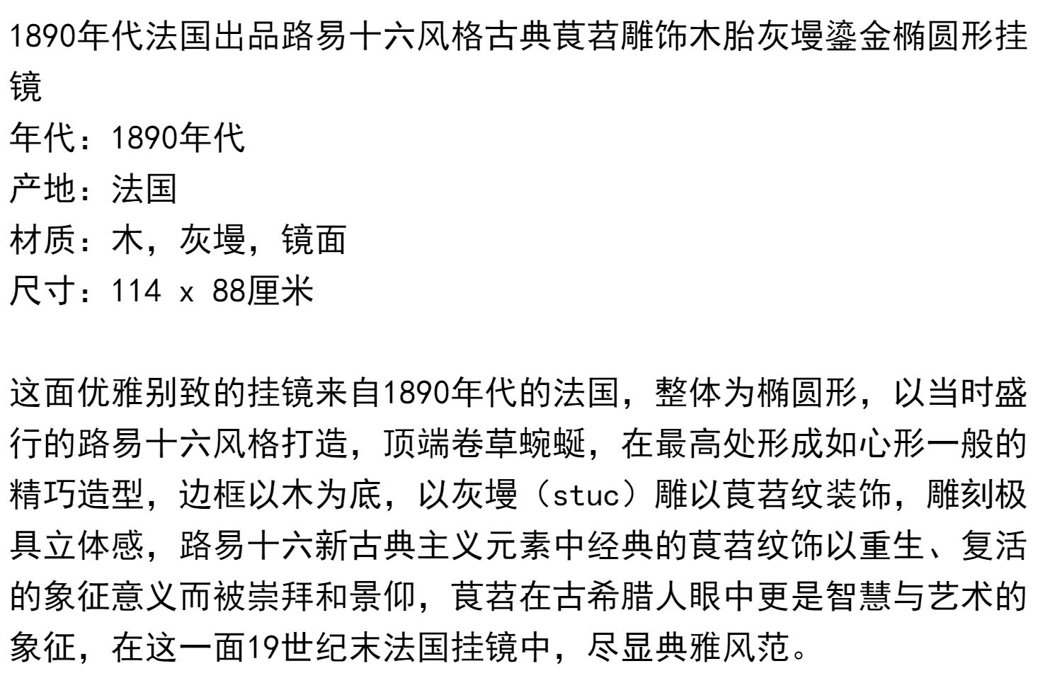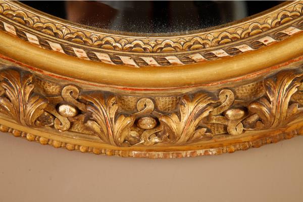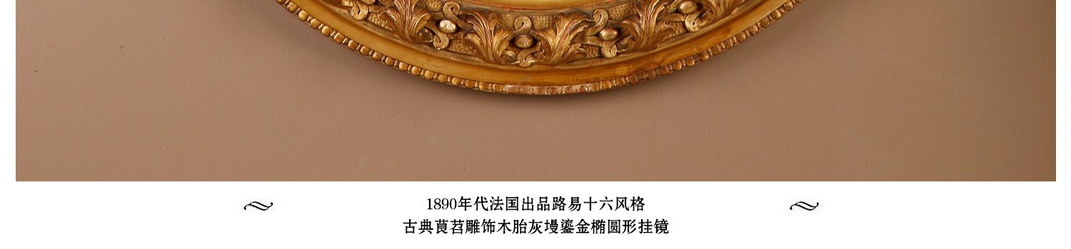 独角鹿西洋古董法国路易十六古典茛苕雕饰木胎灰墁鎏金椭圆形挂镜