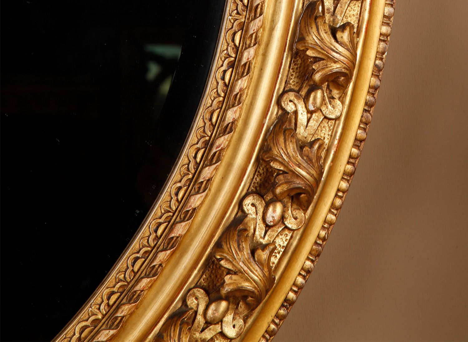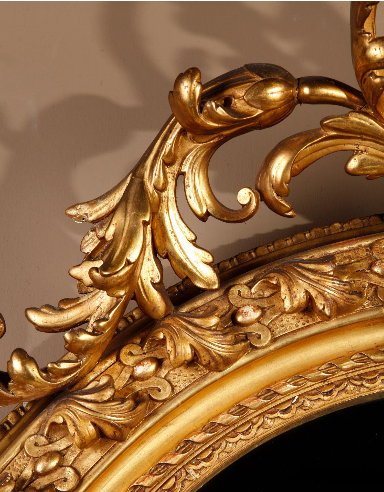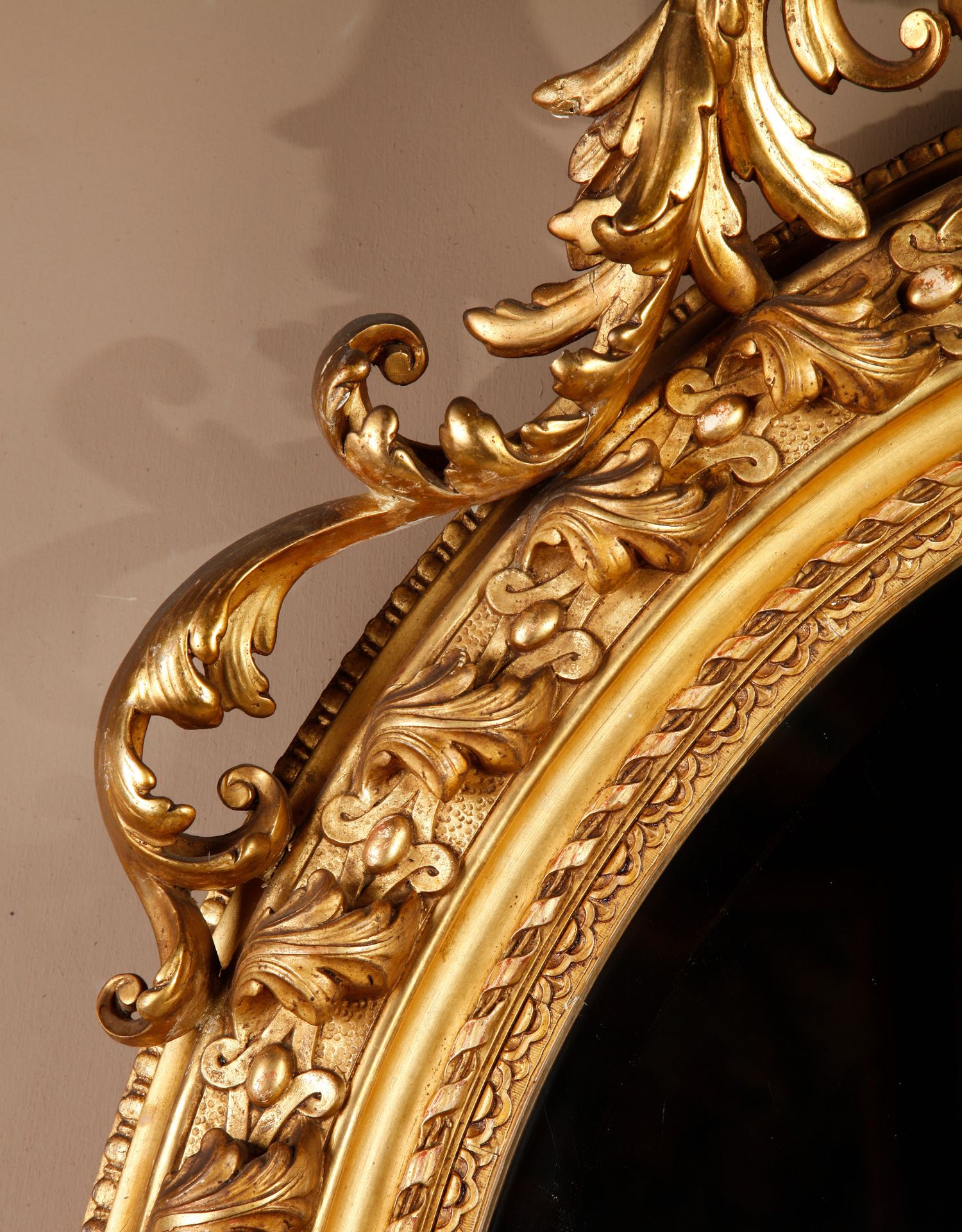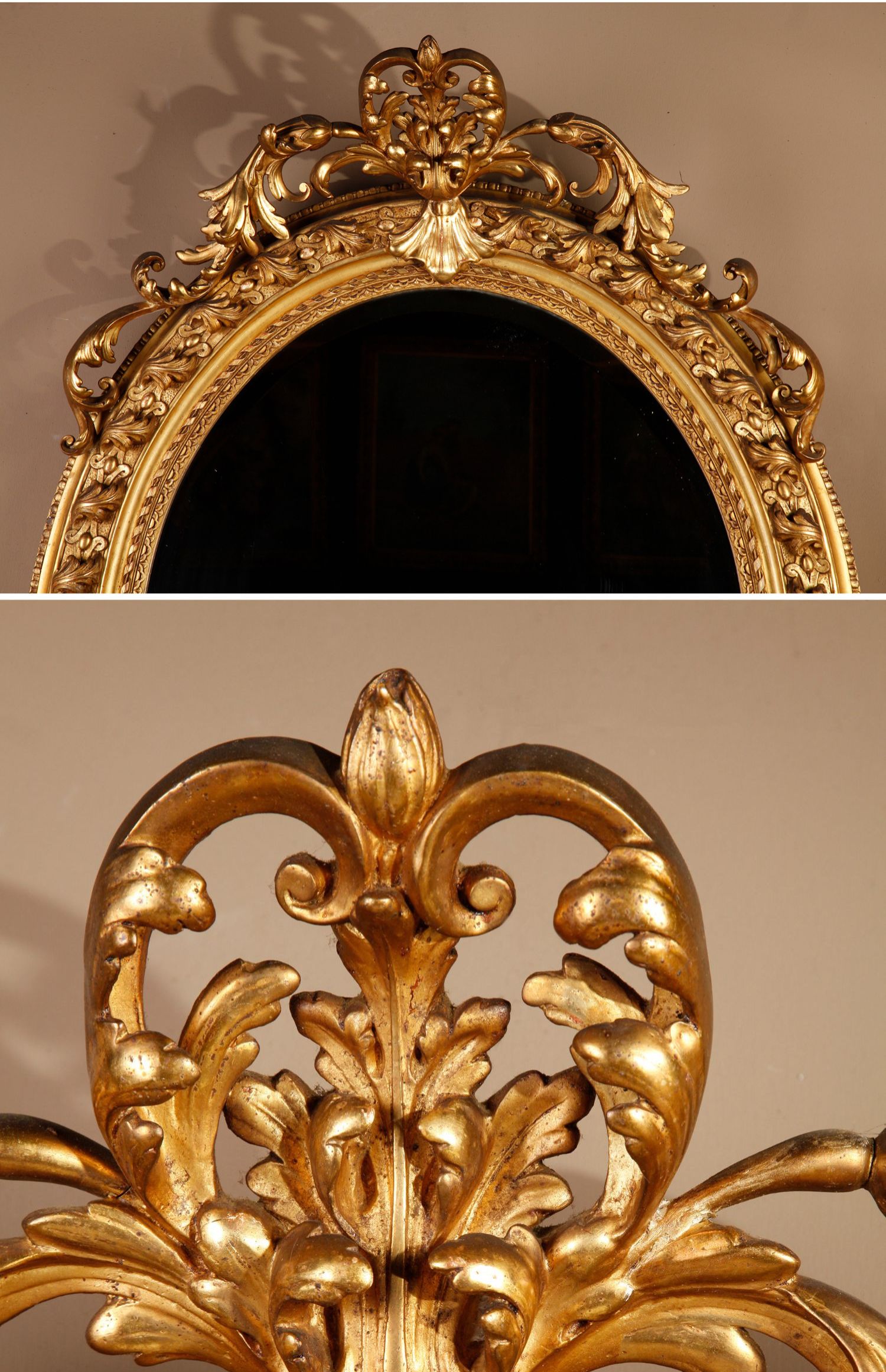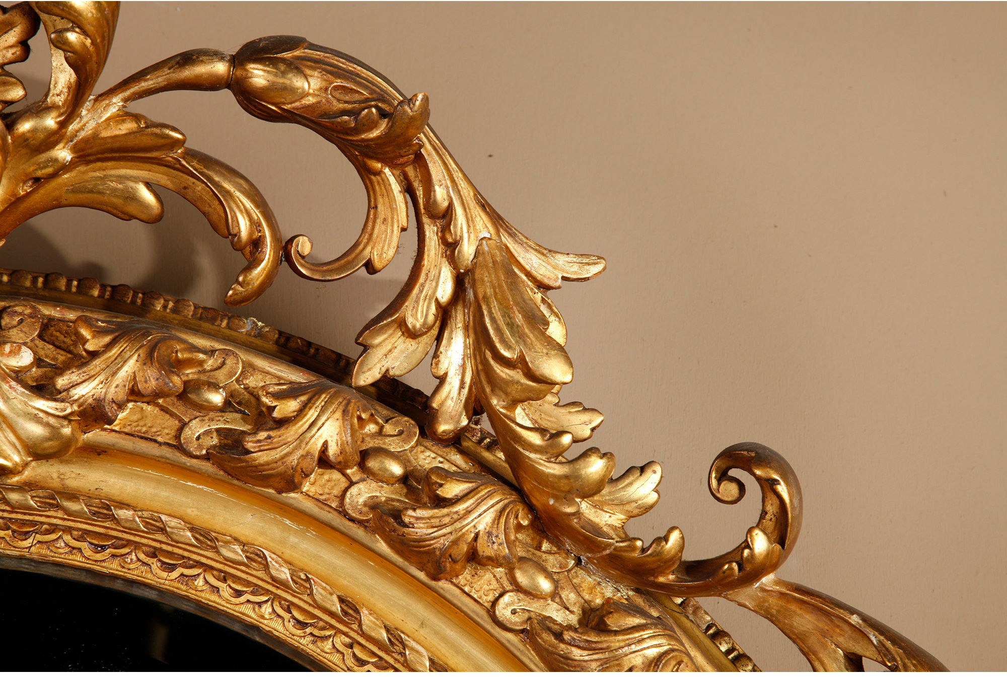 独角鹿西洋古董法国路易十六古典茛苕雕饰木胎灰墁鎏金椭圆形挂镜