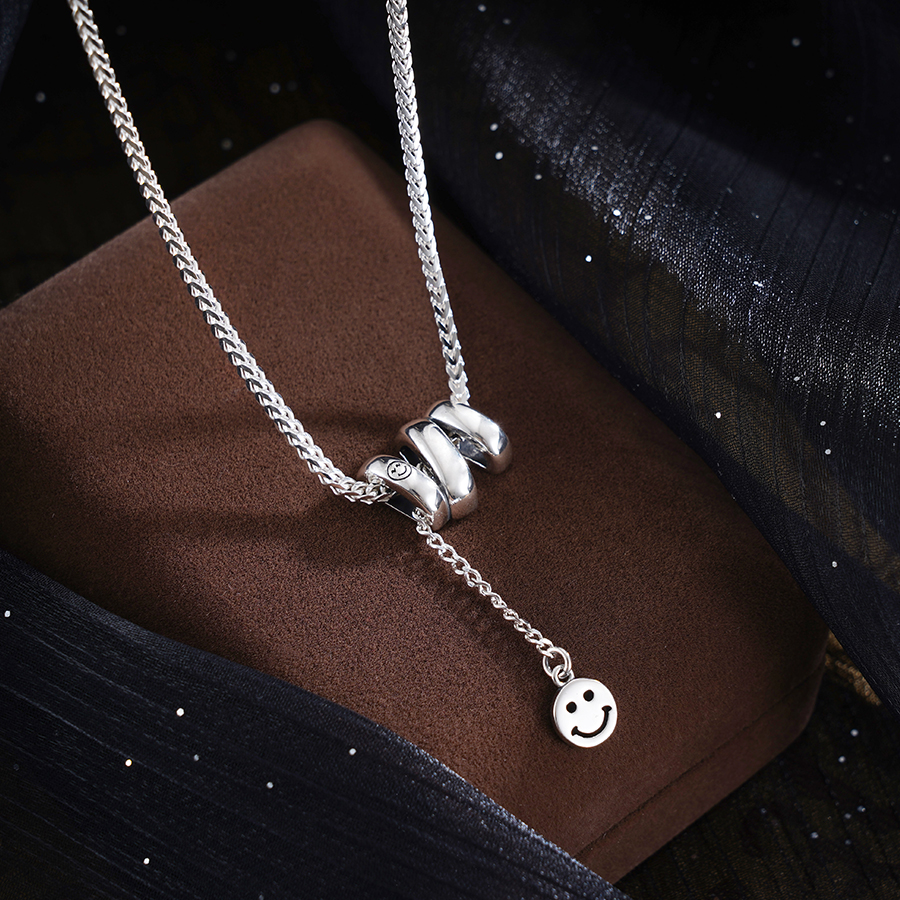 【寓意】:独特的笑脸项链,通体纯银材质,抛光处理。流苏设计,增添洒脱自在的氛围,寓意喜悦常伴。