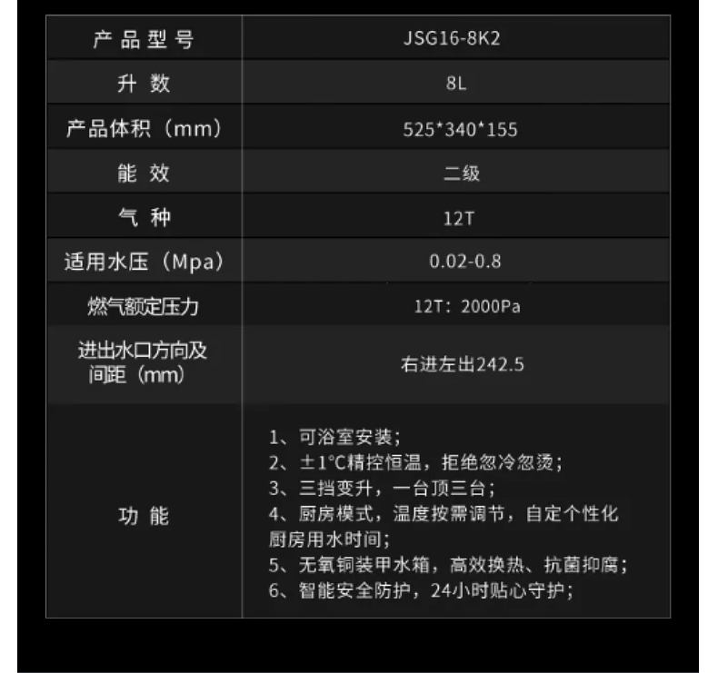 万家乐(Macro)8升 平衡式天然气燃气热水器 精控恒温无氧铜水箱 装浴室 JSG16-8K2 白色 天然气 8K2