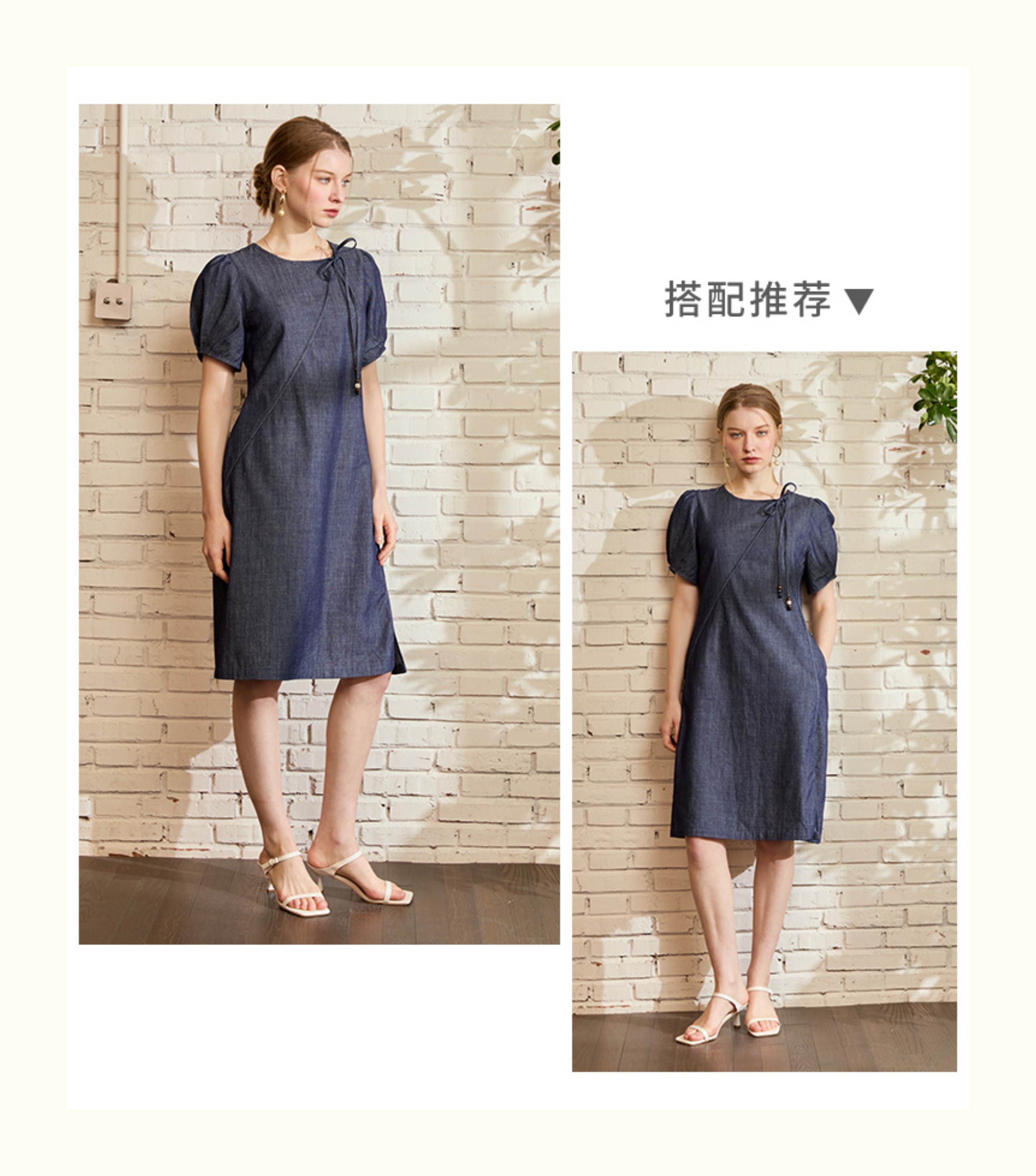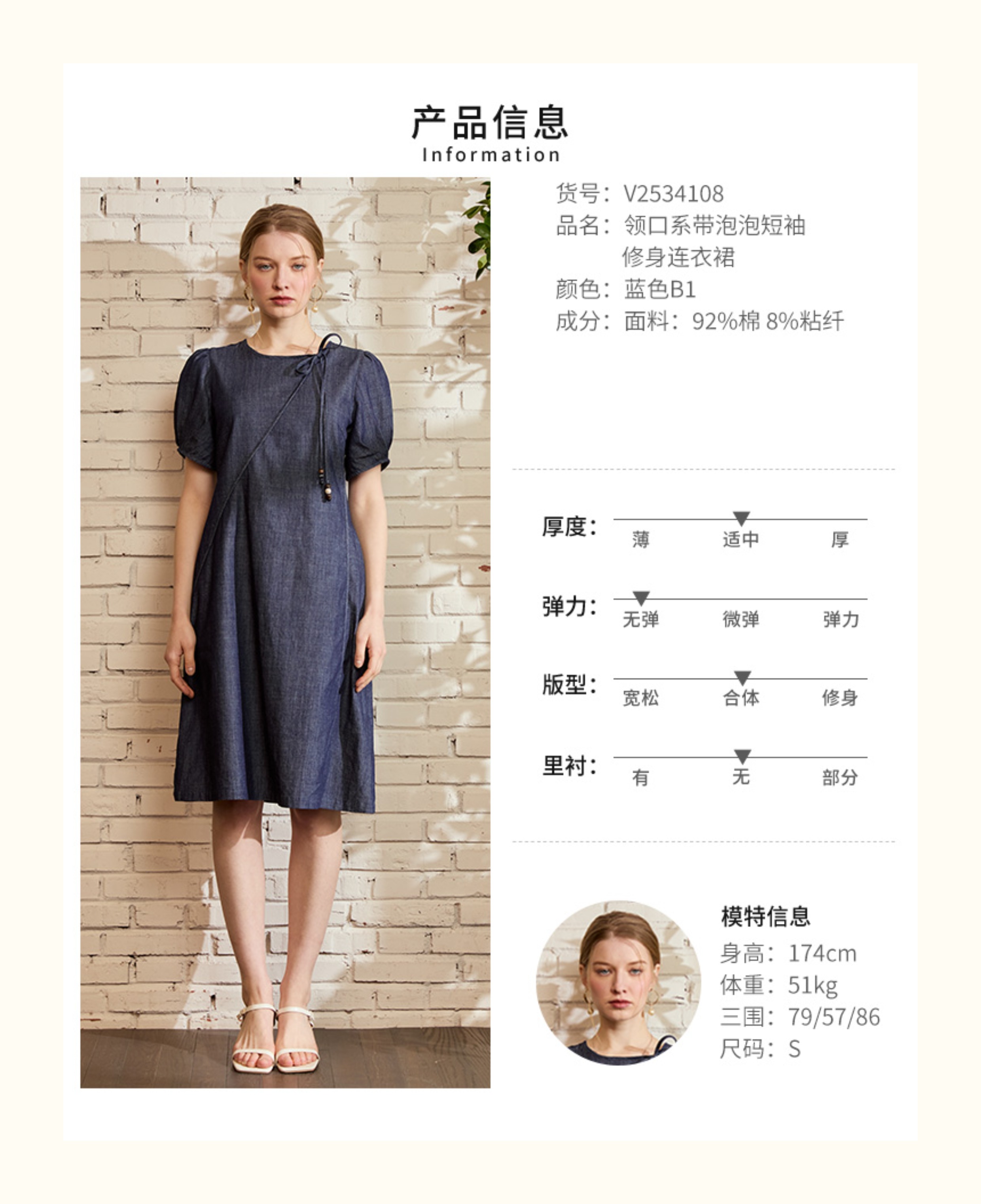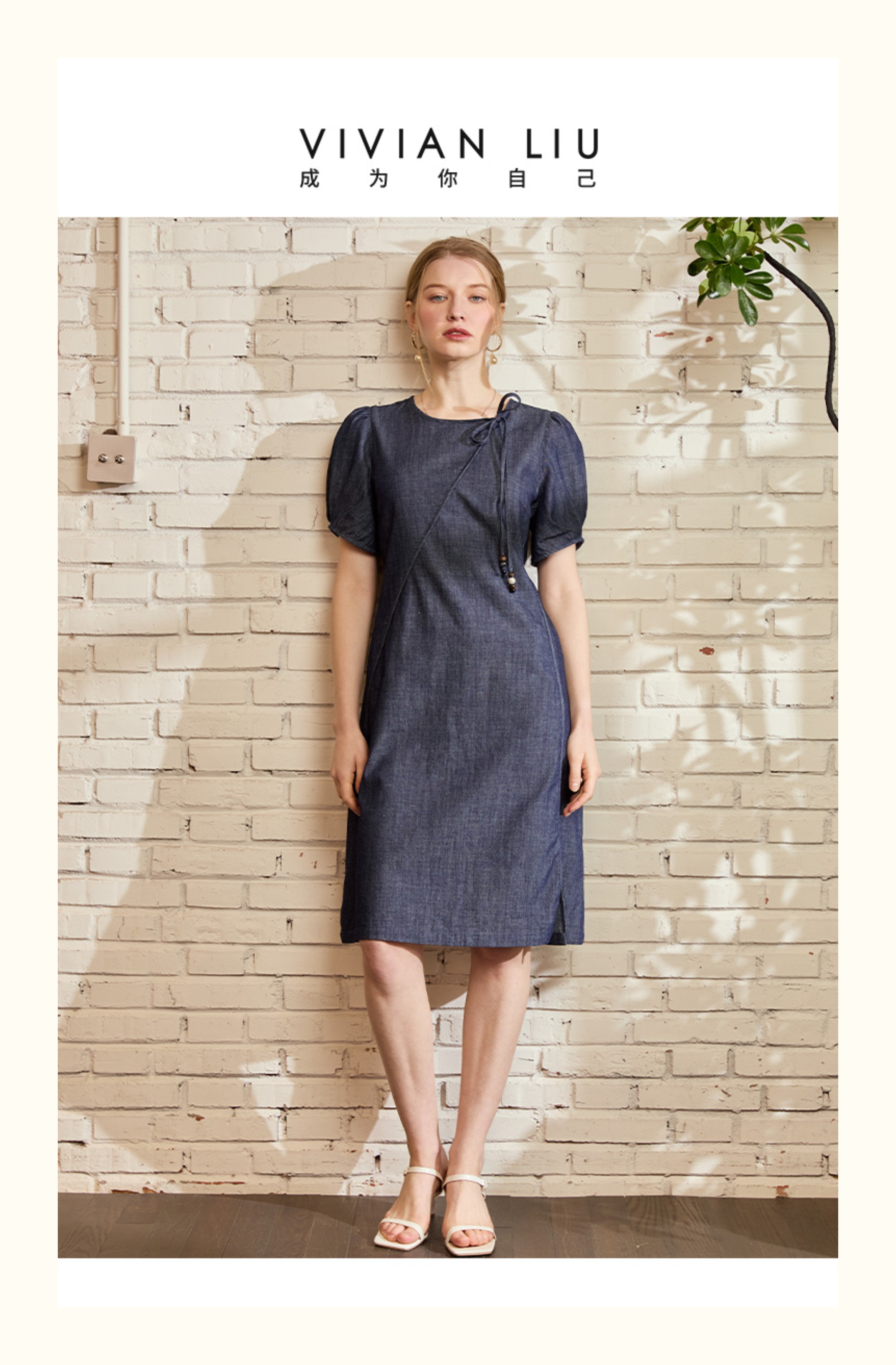 VIVIAN LIU V2534108 夏季新款时尚圆领系带泡泡短袖修身连衣裙