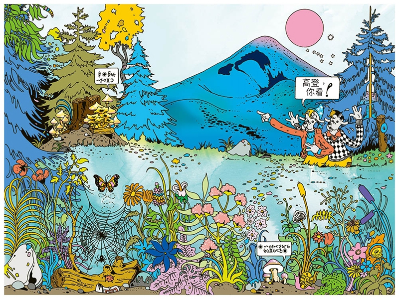 以图像+漫画的手法来展现华森夫妇跨文化、跨学科的心灵旅程,让读者得以透过视觉、直观感受华森夫妇耗费数十年人生探索蘑菇的经历与发现。布洛默斯以鲜艳多彩的繁复精细图像,惊人地生动重现了意识面的迷幻体验(药效带来的感官错觉与思维扩展),扩大了视觉叙事的强烈感染力,一举引爆读者的感官、神经与意识。