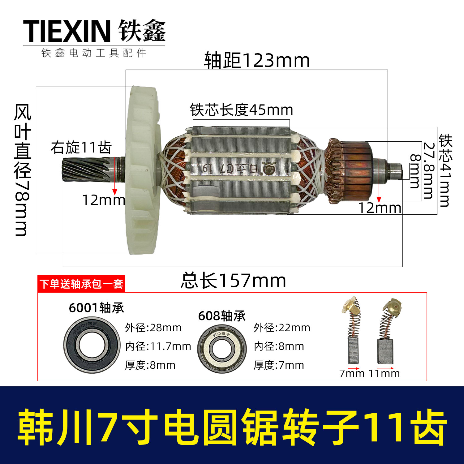 【货号02355】适配闽日7寸电圆锯转子11齿转子电圆锯电机电圆锯配件送上下轴承碳刷