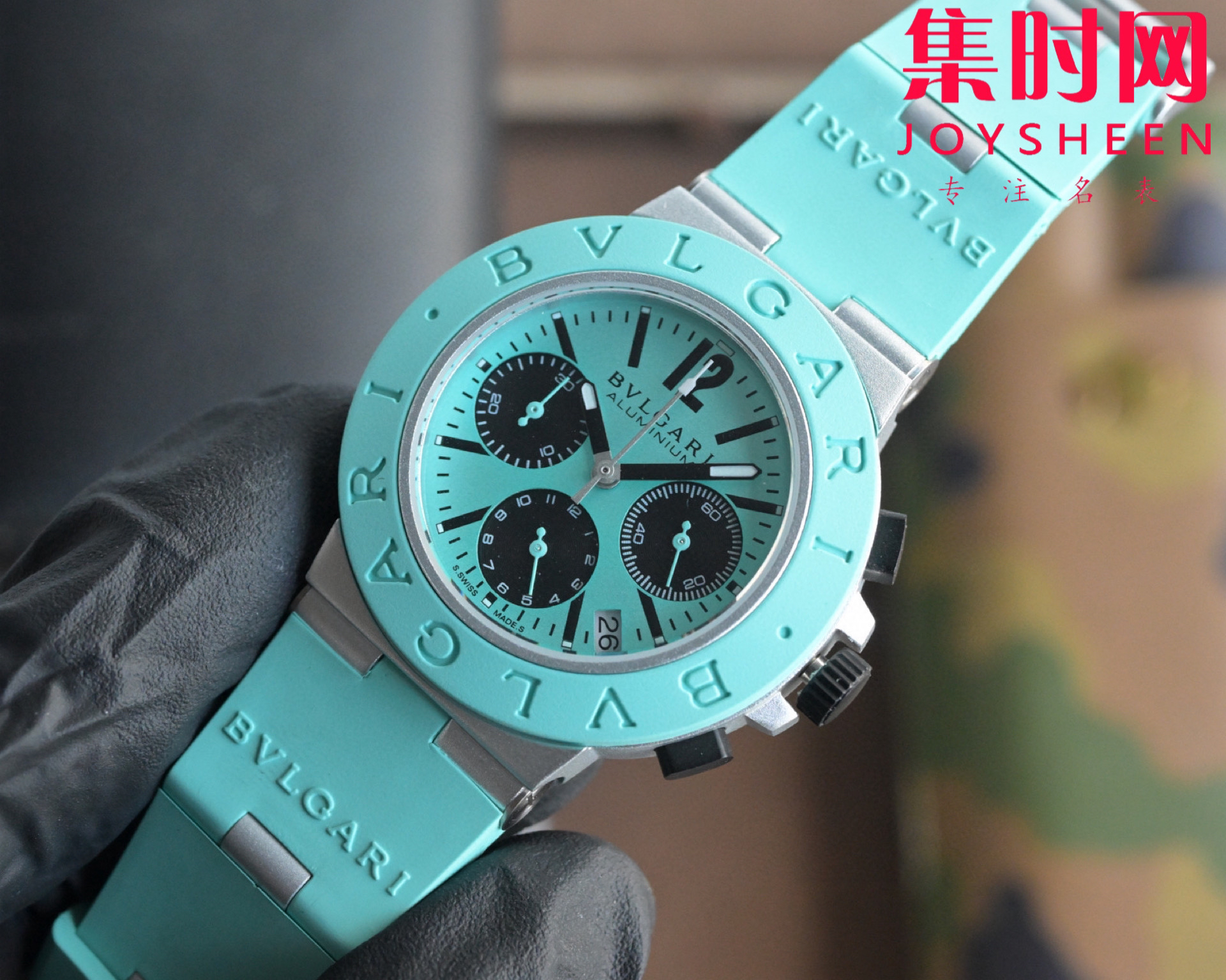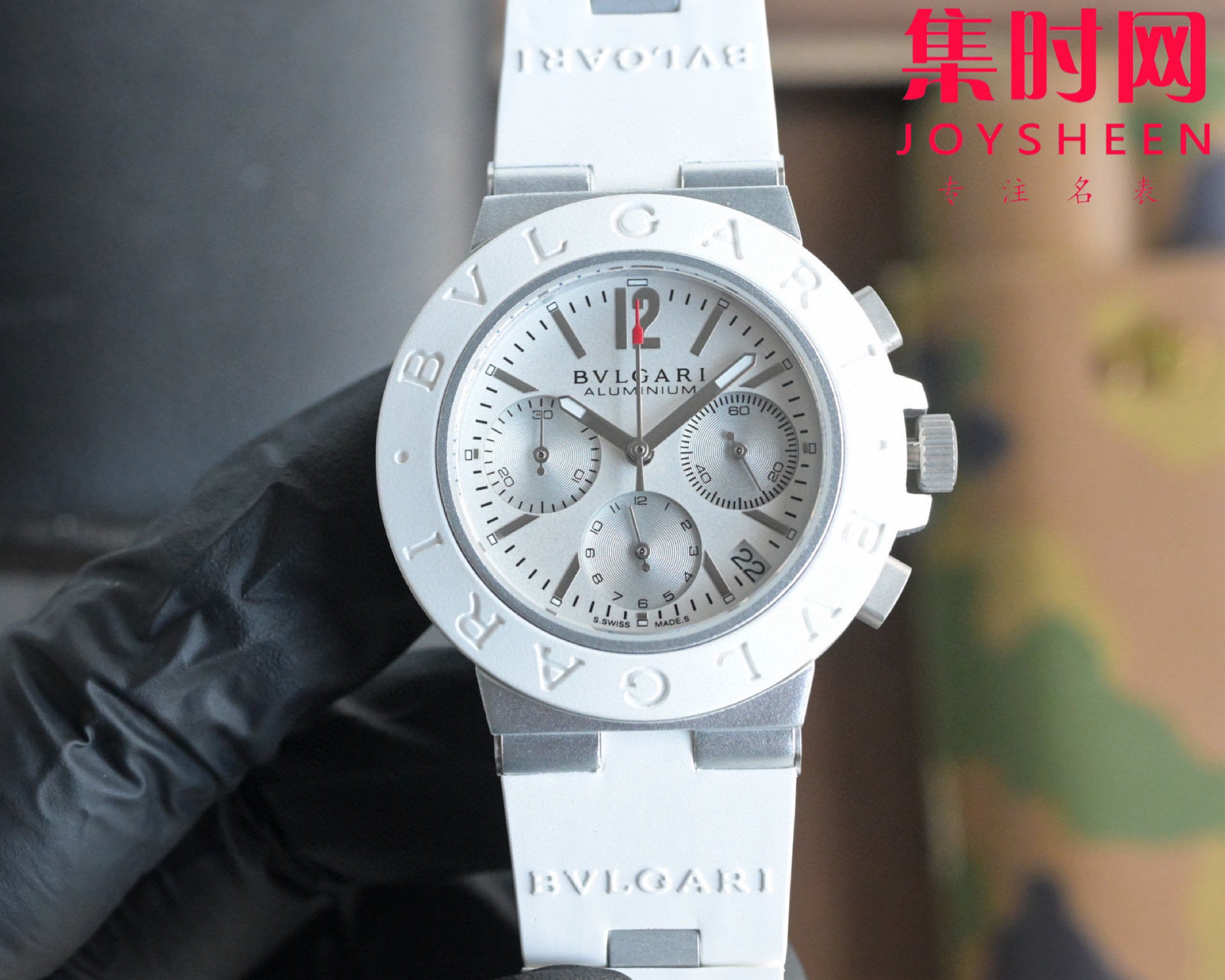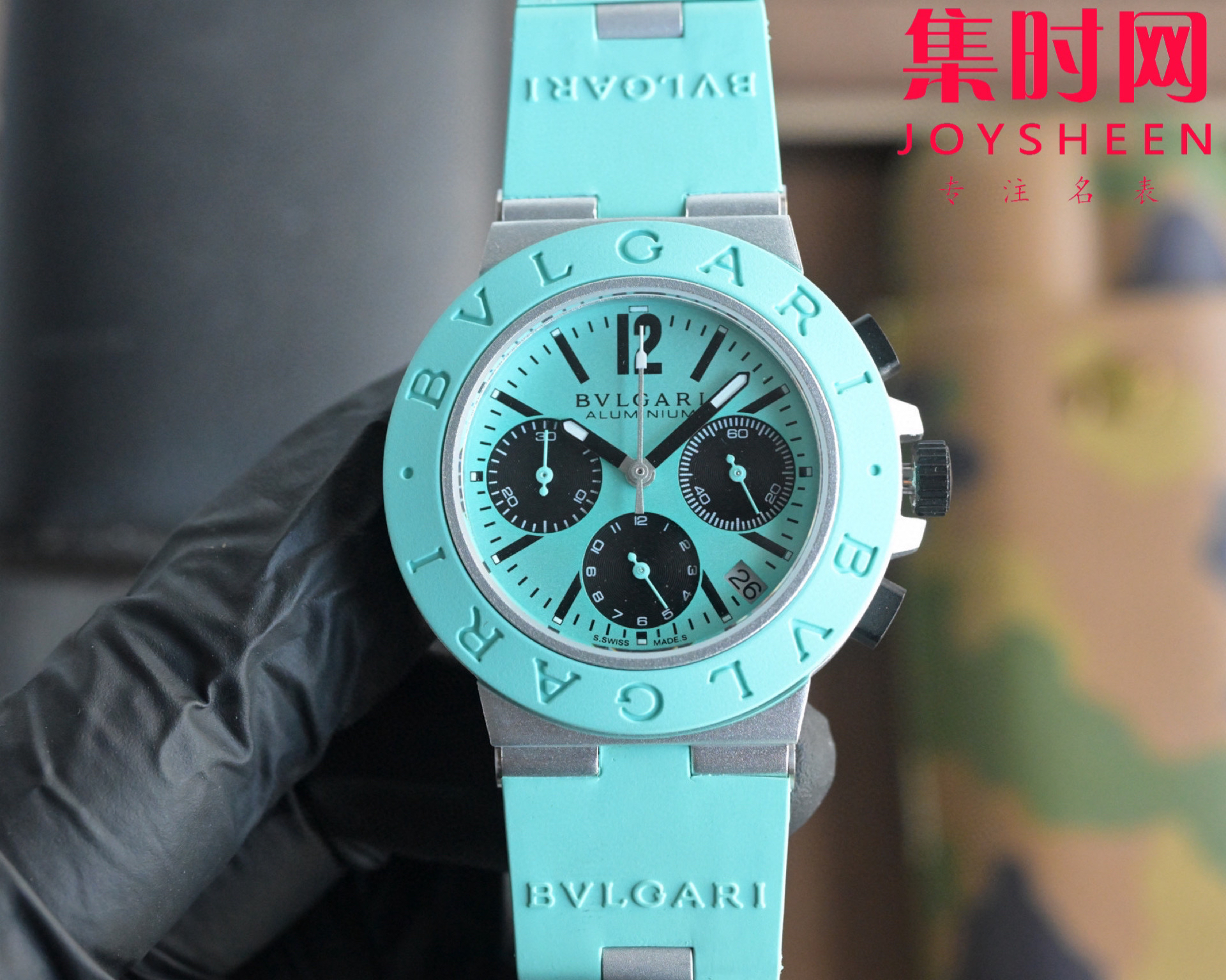 搭载进口VK计时石英机芯,表帶采用麾术貼,适配日常、休闲等多元场景。表壳为哑光喷砂铝合金(轻盈耐用),表圈与表带采用FKM橡胶(抗汗耐磨),表背为DLC涂层钛金属(提升抗划性)。3/6/9点位设蜗形纹计时副盘,指针与刻度覆有Super-LumiNova夜光涂层,中央计时秒针尖端饰红色细节,4点半位置设日期视窗,藍宝石玻璃鏡片,防水100米。延续系列标志性的"BVLGARI BVLGARI"表圈设计,兼具意式优雅与运动质感,是宝格丽创新材质与经典设计结合的代表作品之一,兼具佩戴实用性与收藏辨识度。