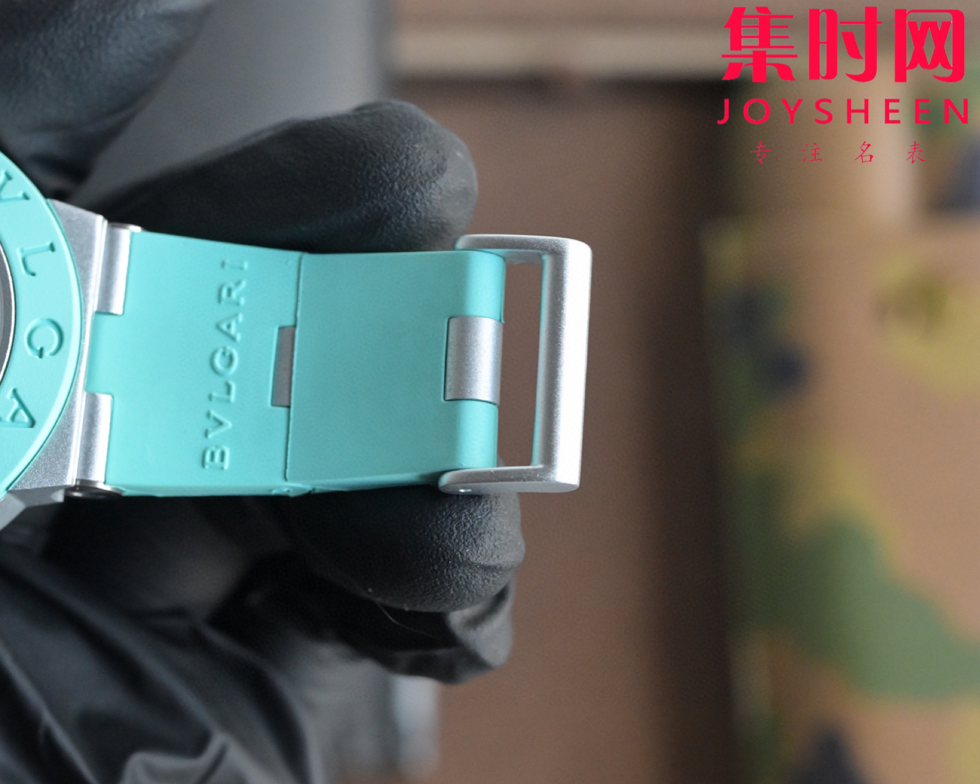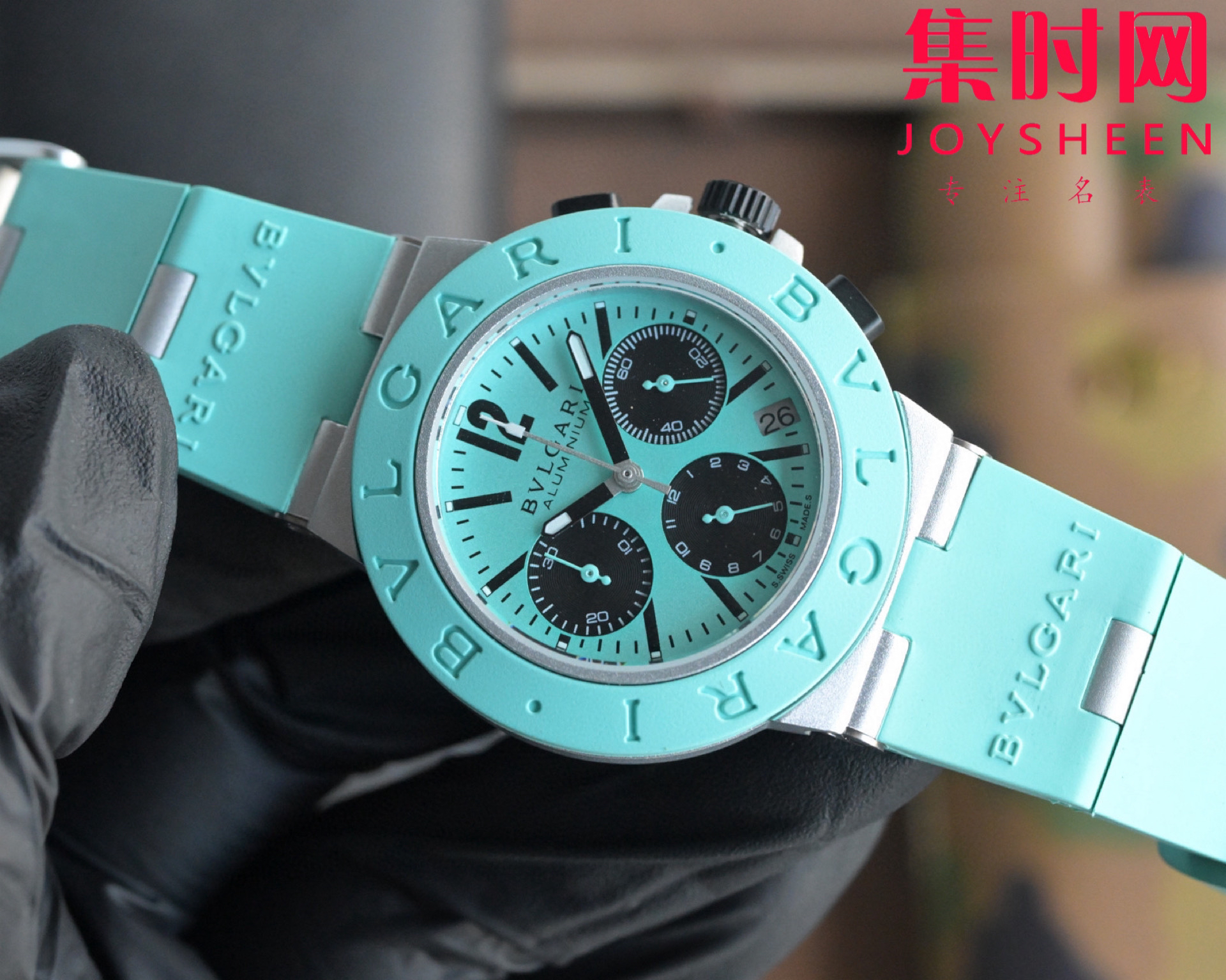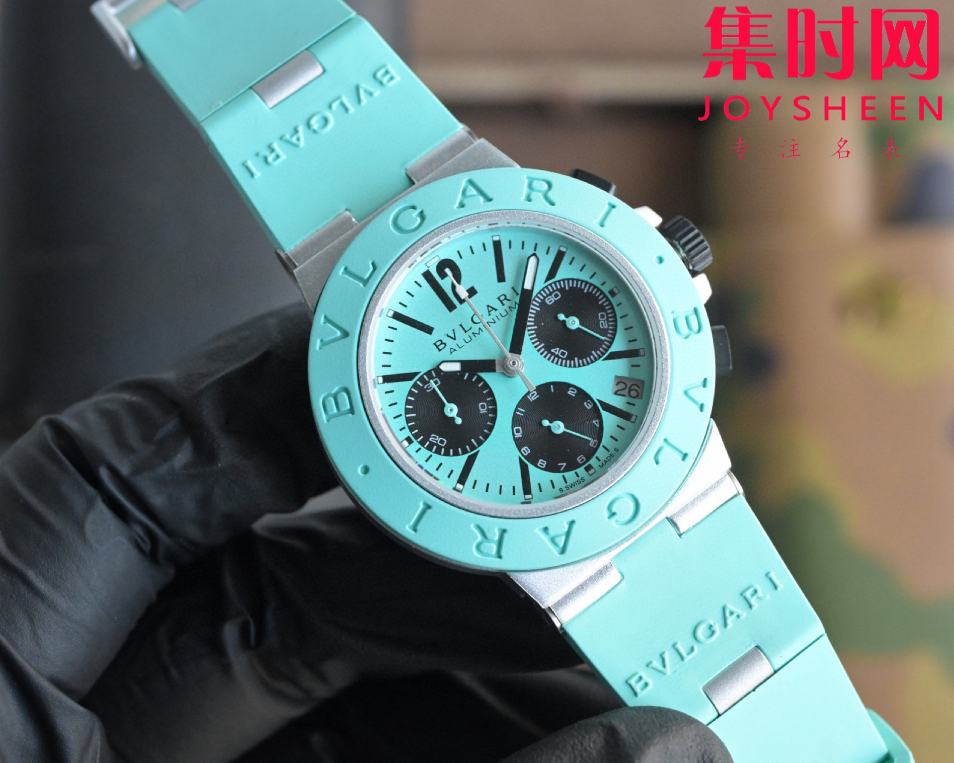 搭载进口VK计时石英机芯,表帶采用麾术貼,适配日常、休闲等多元场景。表壳为哑光喷砂铝合金(轻盈耐用),表圈与表带采用FKM橡胶(抗汗耐磨),表背为DLC涂层钛金属(提升抗划性)。3/6/9点位设蜗形纹计时副盘,指针与刻度覆有Super-LumiNova夜光涂层,中央计时秒针尖端饰红色细节,4点半位置设日期视窗,藍宝石玻璃鏡片,防水100米。延续系列标志性的"BVLGARI BVLGARI"表圈设计,兼具意式优雅与运动质感,是宝格丽创新材质与经典设计结合的代表作品之一,兼具佩戴实用性与收藏辨识度。