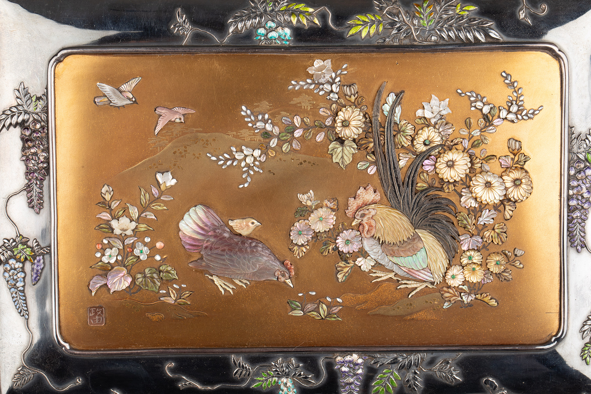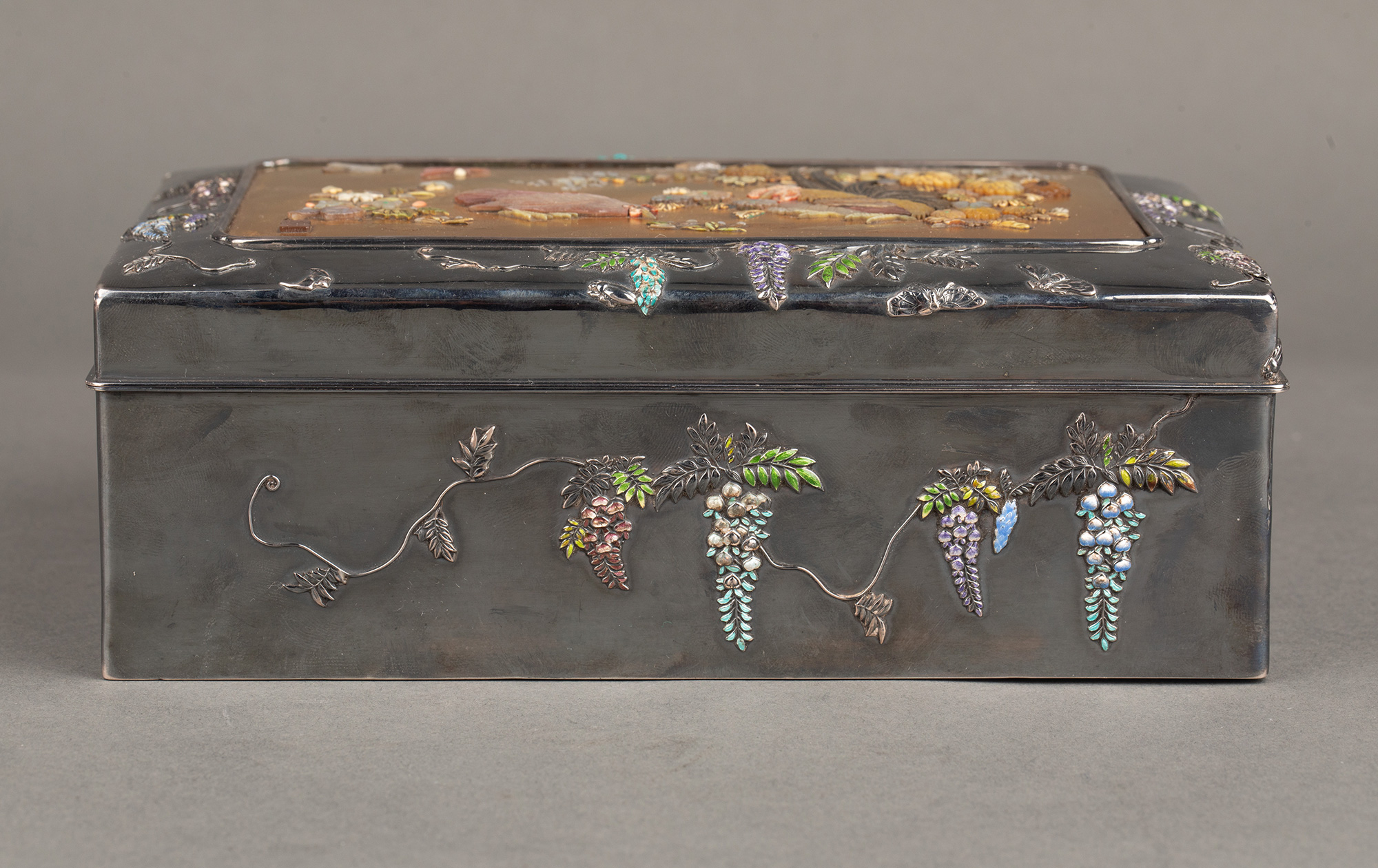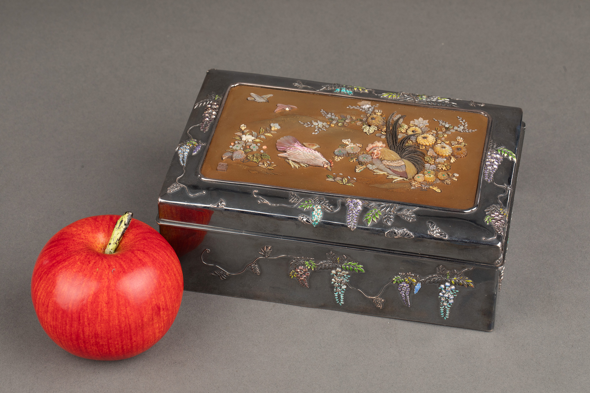 1880年代日本明治时期出品紫藤花蝶纹珐琅彩绘装饰雅菊雄鸡主题金地芝山镶嵌银雕木胎珍宝匣