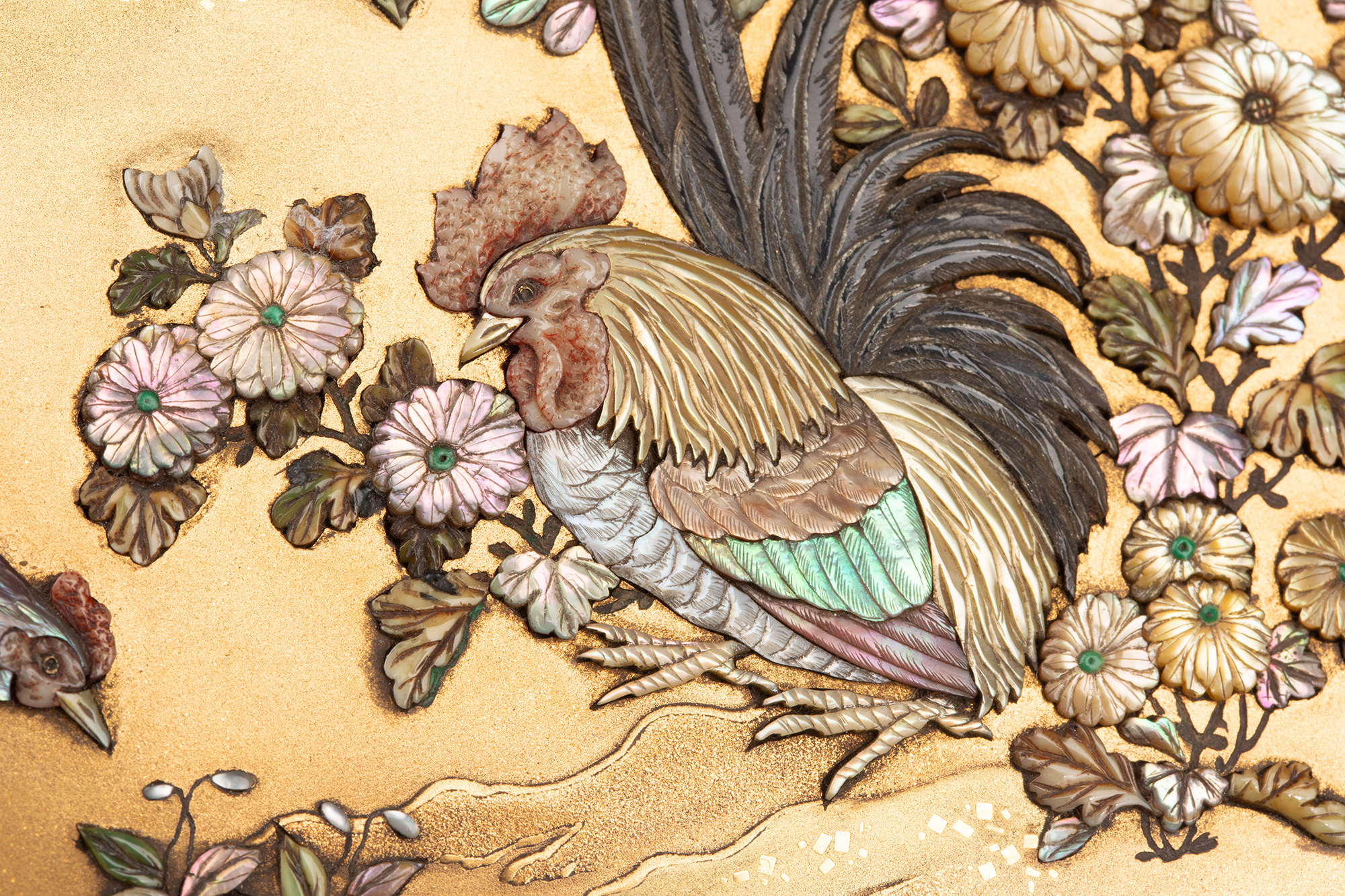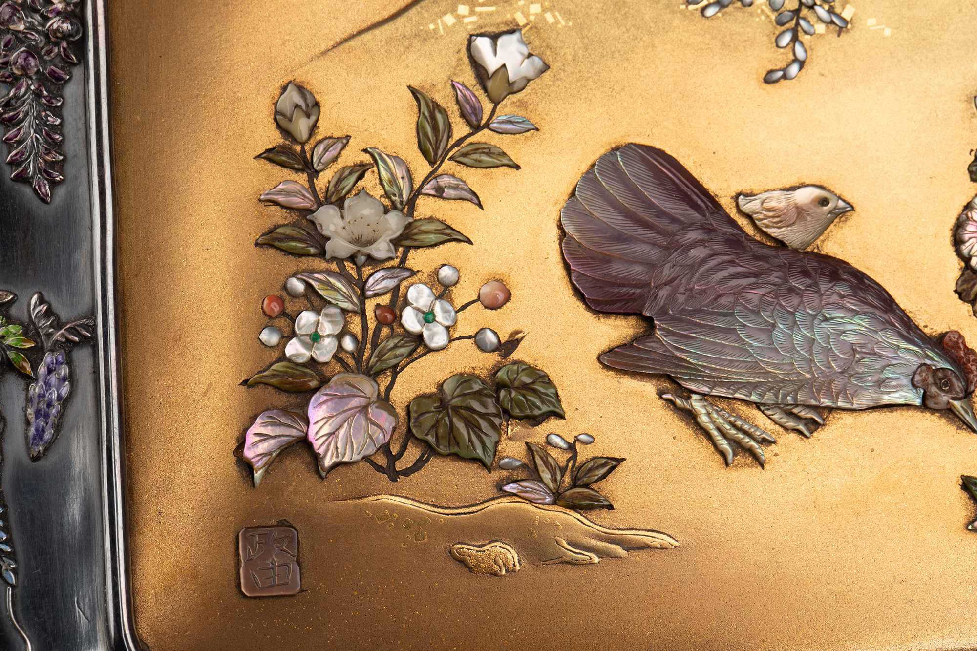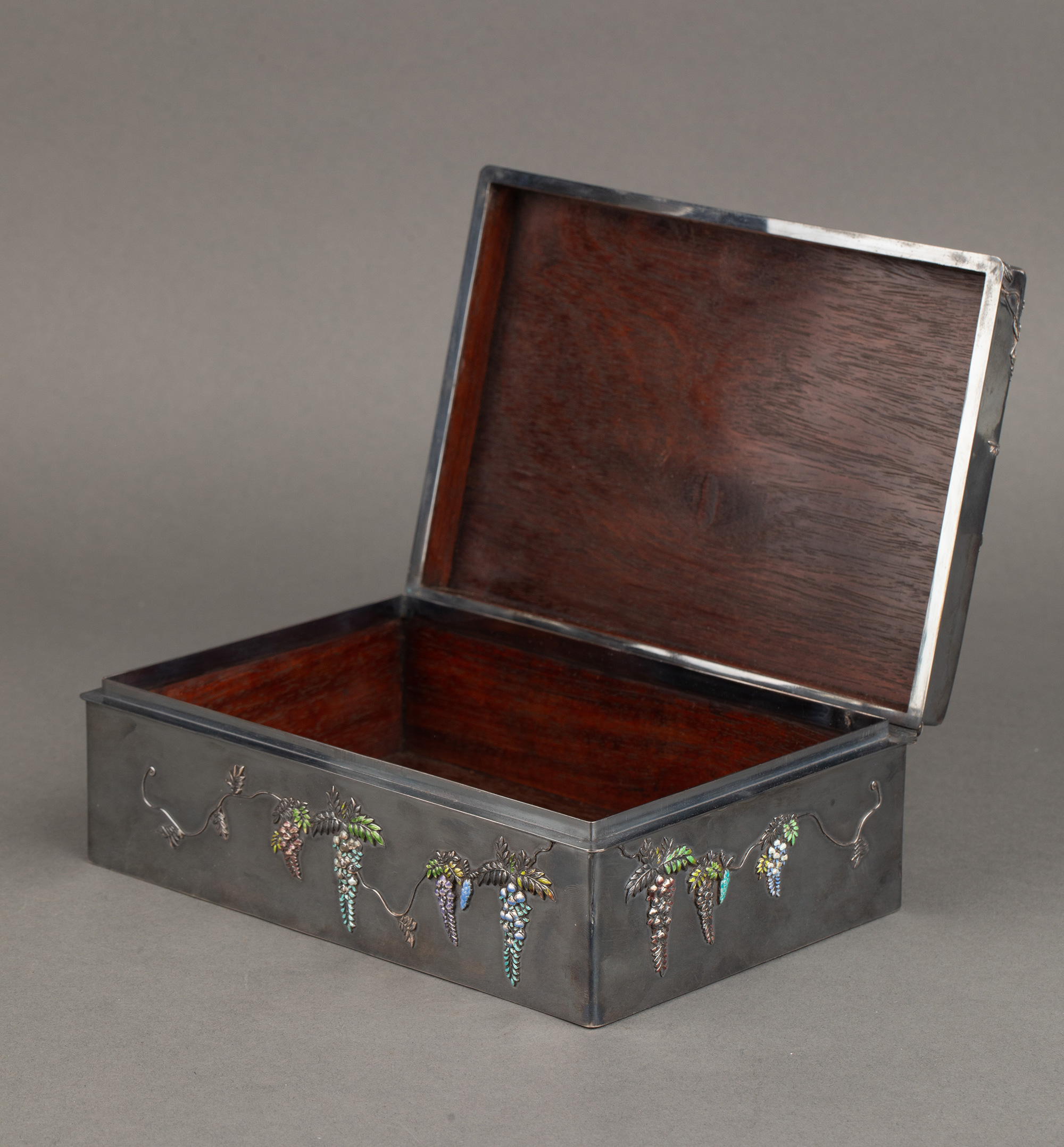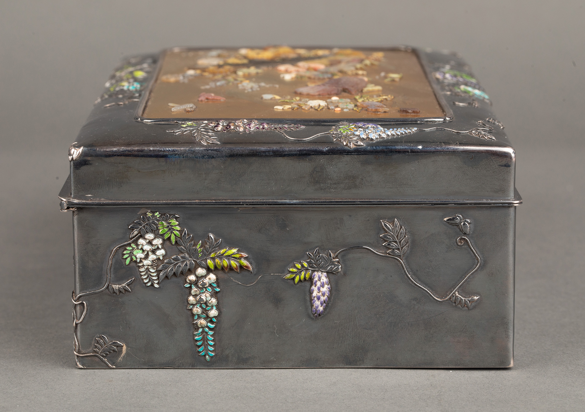 1880年代日本明治时期出品紫藤花蝶纹珐琅彩绘装饰雅菊雄鸡主题金地芝山镶嵌银雕木胎珍宝匣