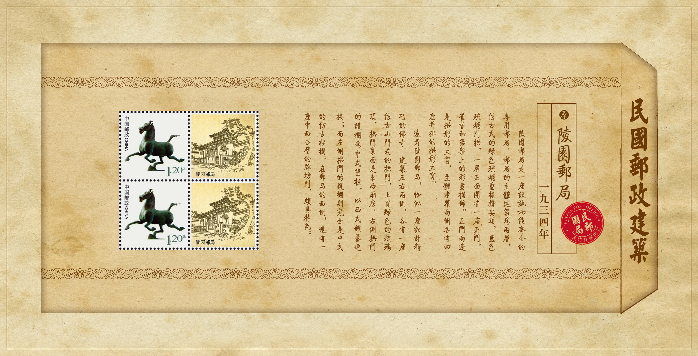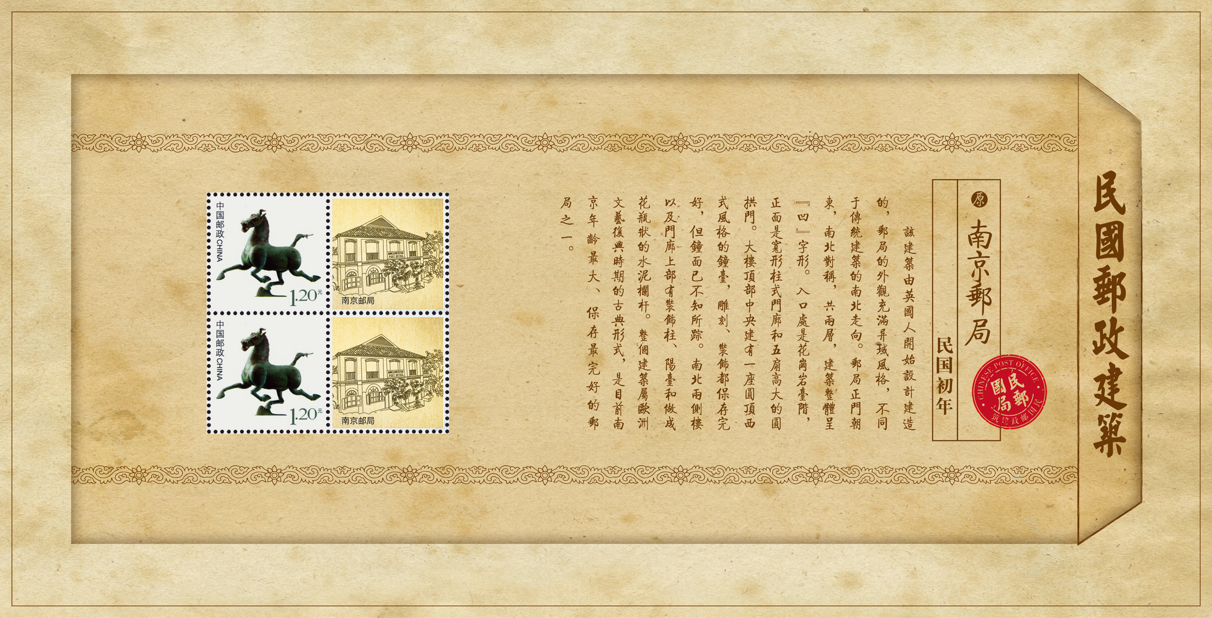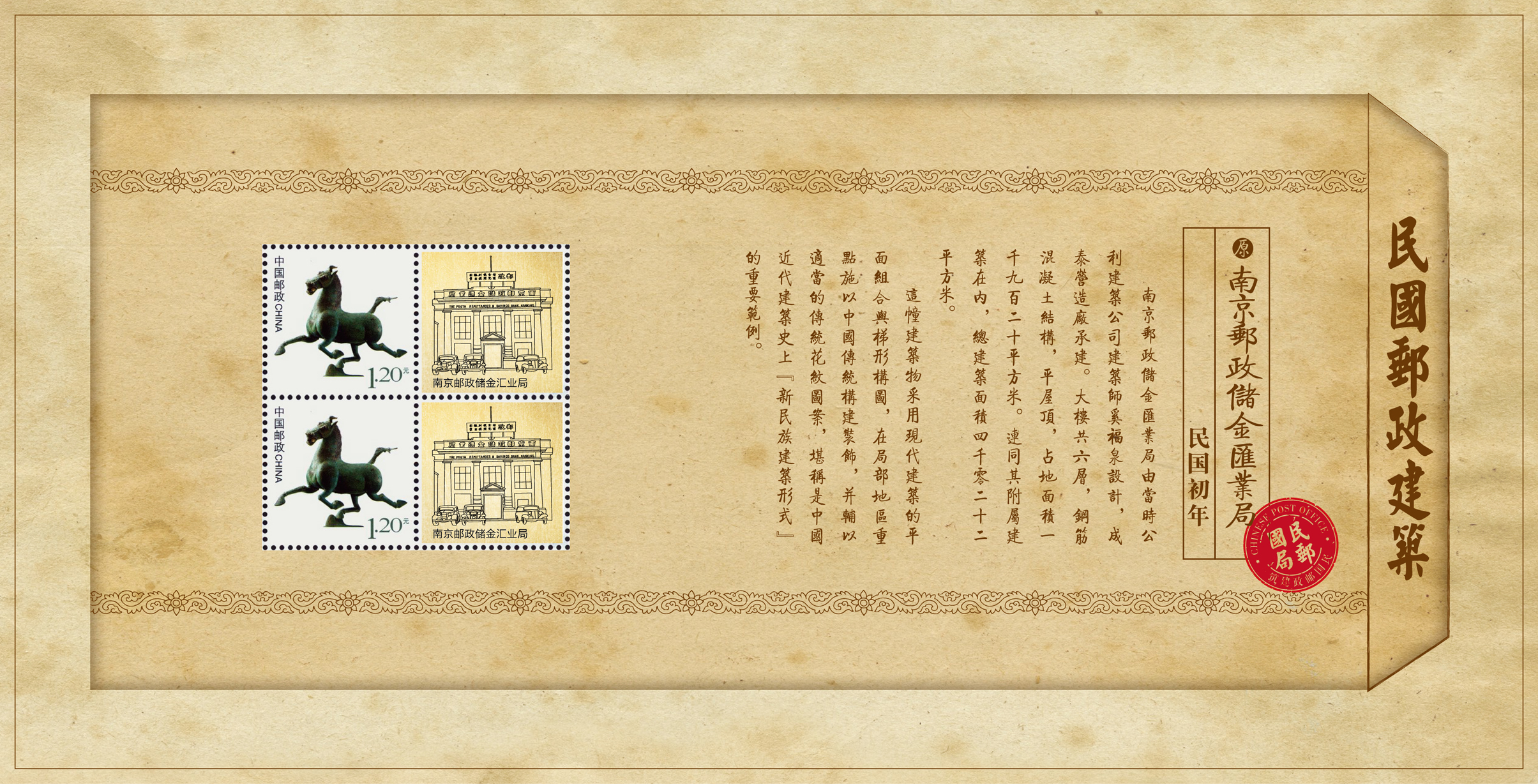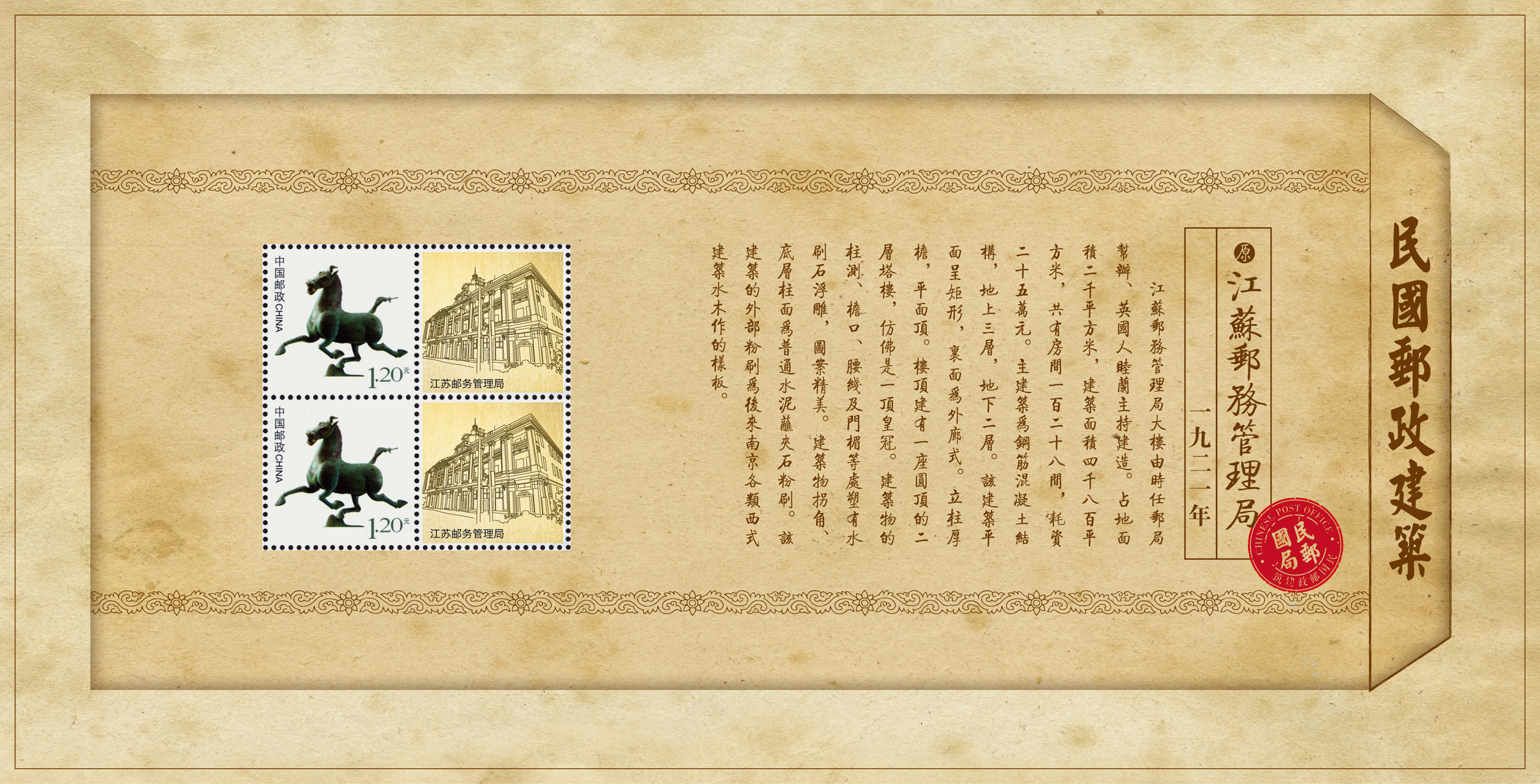 内含:江苏邮务管理局、陵园邮局、南京邮局、南京邮政储金汇业局四座民国建筑个性化邮票,邮资主图为马踏飞燕。