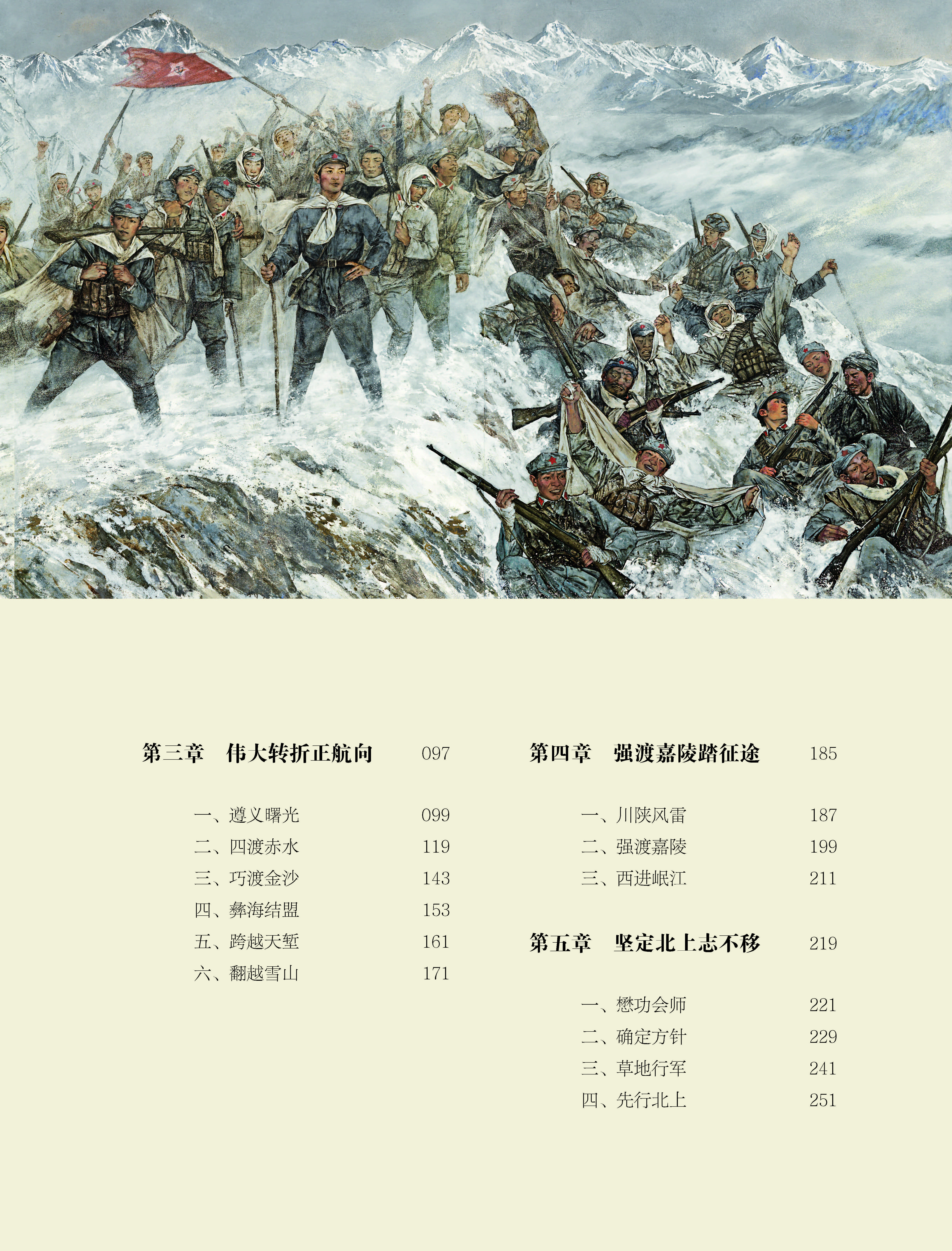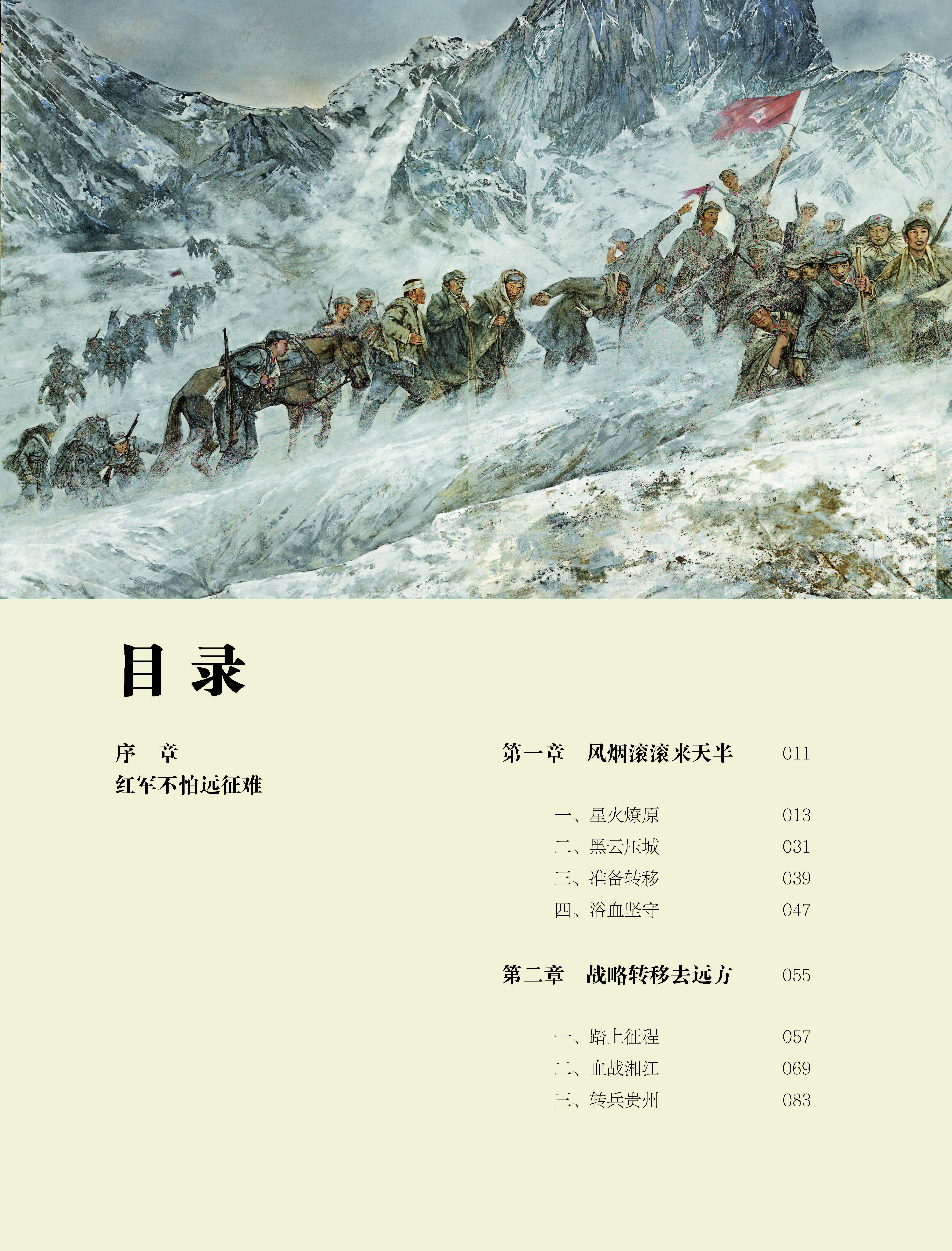 《长征画传》主体为12章,讲述红一方面军、红二方面军、红四方面军和红25军,从长江南北各革命根据地撤离,途经十余个省份,最终会师陕甘苏区的伟大征程。《画传》精选油画、国画、版画、雕塑等经典美术作品150幅,珍贵文物资料80幅,摄影作品70幅,展现长征途中的重要场景和感人故事。血战湘江、遵义会议、翻越雪山、强渡嘉陵、草地跋涉、百丈受挫……一幅幅空间与场景的大叙事,一个个生动细微的小故事,串起二万五千里的长征。