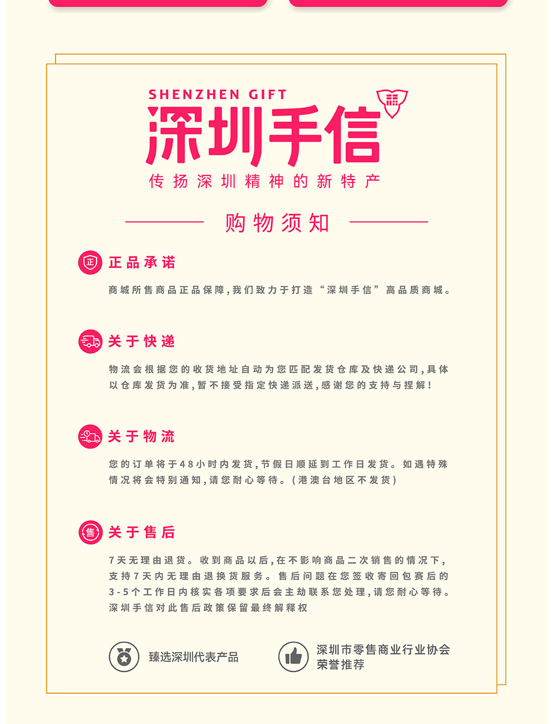 欢迎关注【深圳手信商城】 深圳手信是城市礼品的选购平台,臻选深圳八大优势产业代表产品,深圳市零售商业行业协会推荐。 闭着眼睛挑,每一份都是好礼,是商务往来、旅游出差、走亲访友、员工福利的好礼