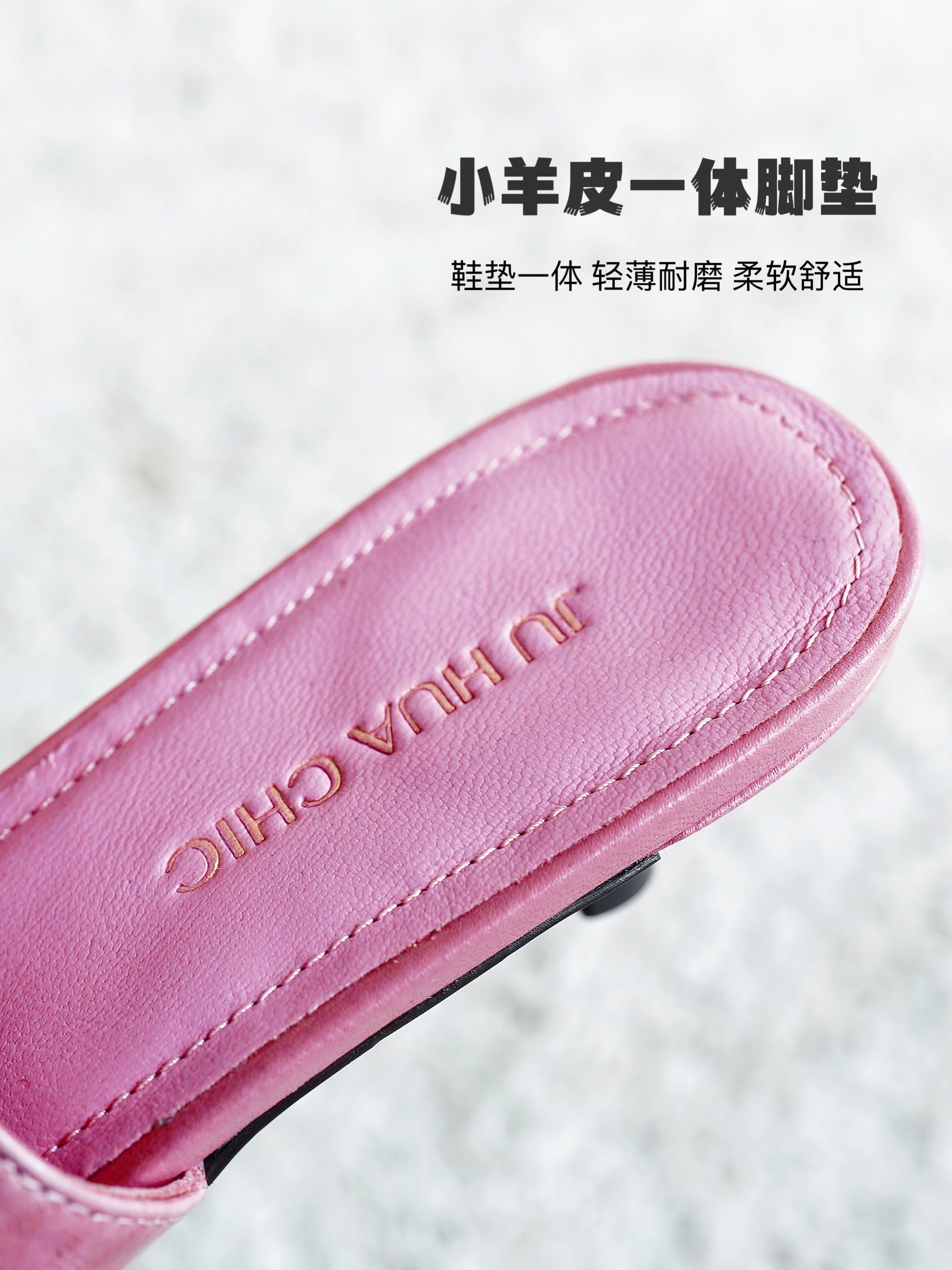 一体的羊皮里垫,包括侧边也是小羊皮,加了海绵垫,脚感非常舒服透气,不磨脚,从内到外的奢华体感。