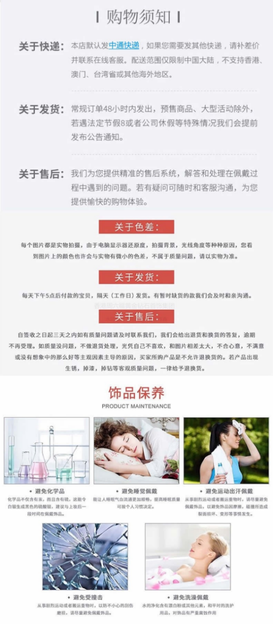 4、 运输过程中难免有些小瑕疵,珠宝首饰是贵重货品,务必要求当场签收!!!