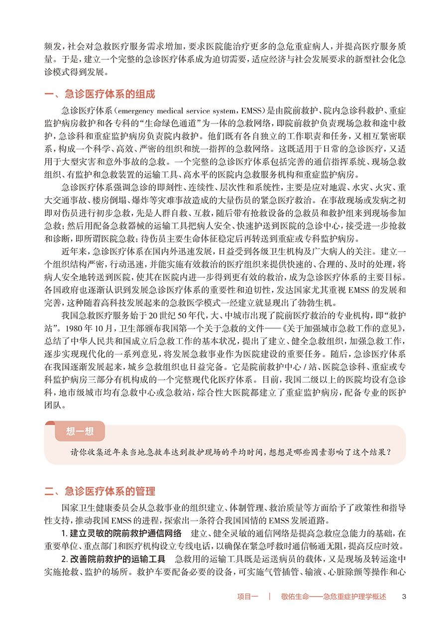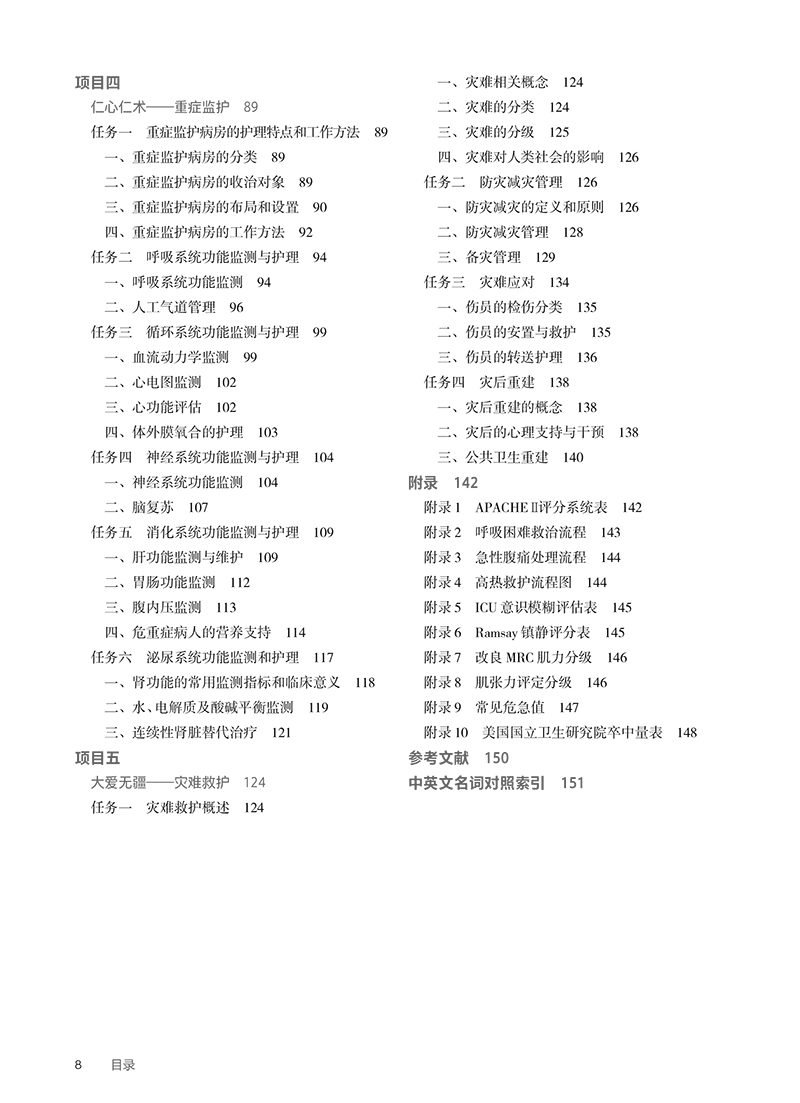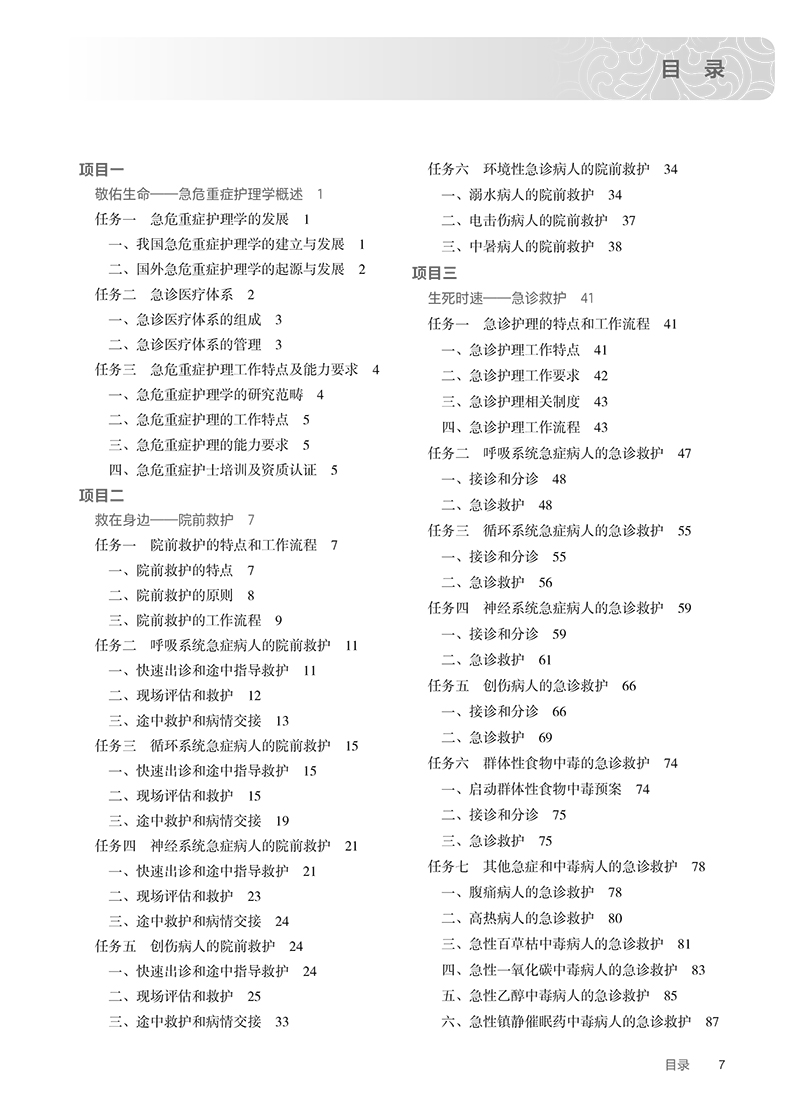 项目一敬佑生命——急危重症护理学概述/1 任务一急危重症护理学的发展/1 一、我国急危重症护理学的建立与发展/1 二、国外急危重症护理学的起源与发展/2 任务二急诊医疗体系/2 一、急诊医疗体系的组成/3 二、急诊医疗体系的管理/3 任务三急危重症护理工作特点及能力要求/4 一、急危重症护理学的研究范畴/4 二、急危重症护理的工作特点/5 三、急危重症护理的能力要求/5 四、急危重症护士培训及资质认证/5 项目二救在身边——院前救护/7 任务一院前救护的特点和工作流程/7 一、院前救护的特点/7 二、院前救护的原则/8 三、院前救护的工作流程/9 任务二呼吸系统急症病人的院前救护/11 一、快速出诊和途中指导救护/11 二、现场评估和救护/12 三、途中救护和病情交接/13 任务三循环系统急症病人的院前救护/15 一、快速出诊和途中指导救护/15 二、现场评估和救护/15 三、途中救护和病情交接/19 任务四神经系统急症病人的院前救护/21 一、快速出诊和途中指导救护/21 二、现场评估和救护/23 三、途中救护和病情交接/24 任务五创伤病人的院前救护/24 一、快速出诊和途中指导救护/24 二、现场评估和救护/25 三、途中救护和病情交接/33 任务六环境性急诊病人的院前救护/34 一、溺水病人的院前救护/34 二、电击伤病人的院前救护/37 三、中暑病人的院前救护/38 项目三生死时速——急诊救护/41 任务一急诊护理的特点和工作流程/41 一、急诊护理工作特点/41 二、急诊护理工作要求/42 三、急诊护理相关制度/43 四、急诊护理工作流程/43 任务二呼吸系统急症病人的急诊救护/47 一、接诊和分诊/48 二、急诊救护/48 任务三循环系统急症病人的急诊救护/55 一、接诊和分诊/55 二、急诊救护/56 任务四神经系统急症病人的急诊救护/59 一、接诊和分诊/59 二、急诊救护/61 任务五创伤病人的急诊救护/66 一、接诊和分诊/66 二、急诊救护/69 任务六群体性食物中毒的急诊救护/74 一、启动群体性食物中毒预案/74 二、接诊和分诊/75 三、急诊救护/75 任务七其他急症和中毒病人的急诊救护/78 一、腹痛病人的急诊救护/78 二、高热病人的急诊救护/80 三、急性百草枯中毒病人的急诊救护/81 四、急性一氧化碳中毒病人的急诊救护/83 五、急性乙醇中毒病人的急诊救护/85 六、急性镇静催眠药中毒病人的急诊救护/87 项目四仁心仁术——重症监护/89 任务一重症监护病房的护理特点和工作方法/89 一、重症监护病房的分类/89 二、重症监护病房的收治对象/89 三、重症监护病房的布局和设置/90 四、重症监护病房的工作方法/92 任务二呼吸系统功能监测与护理/94 一、呼吸系统功能监测/94 二、人工气道管理/96 任务三循环系统功能监测与护理/99 一、血流动力学监测/99 二、心电图监测/102 三、心功能评估/102 四、体外膜氧合的护理/103 任务四神经系统功能监测与护理/104 一、神经系统功能监测/104 二、脑复苏/107 任务五消化系统功能监测与护理/109 一、肝功能监测与维护/109 二、胃肠功能监测/112 三、腹内压监测/113 四、危重症病人的营养支持/114 任务六泌尿系统功能监测和护理/117 一、肾功能的常用监测指标和临床意义/118 二、水、电解质及酸碱平衡监测/119 三、连续性肾脏替代治疗/121 项目五大爱无疆——灾难救护/124 任务一灾难救护概述/124 一、灾难相关概念/124 二、灾难的分类/124 三、灾难的分级/125 四、灾难对人类社会的影响/126 任务二防灾减灾管理/126 一、防灾减灾的定义和原则/126 二、防灾减灾管理/128 三、备灾管理/129 任务三灾难应对/134 一、伤员的检伤分类/135 二、伤员的安置与救护/135 三、伤员的转送护理/136 任务四灾后重建/138 一、灾后重建的概念/138 二、灾后的心理支持与干预/138 三、公共卫生重建/140 附录/142 附录1APACHEⅡ评分系统表/142 附录2呼吸困难救治流程/143 附录3急性腹痛处理流程/144 附录4高热救护流程图/144 附录5ICU意识模糊评估表/145 附录6Ramsay镇静评分表/145 附录7改良MRC肌力分级/146 附录8肌张力评定分级/146 附录9常见危急值/147 附录10美国国立卫生研究院卒中量表/148 参考文献/150 中英文名词对照索引/151