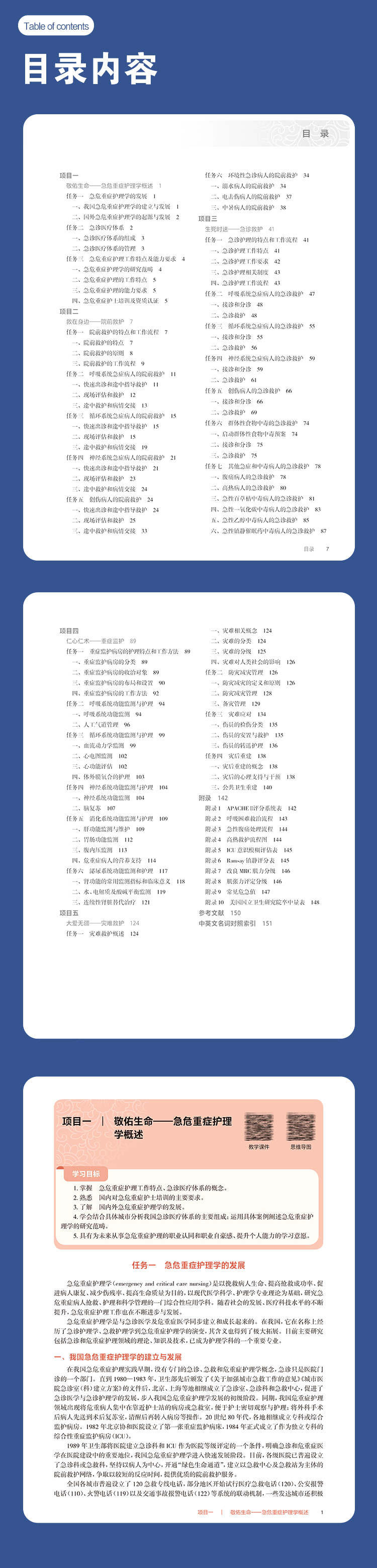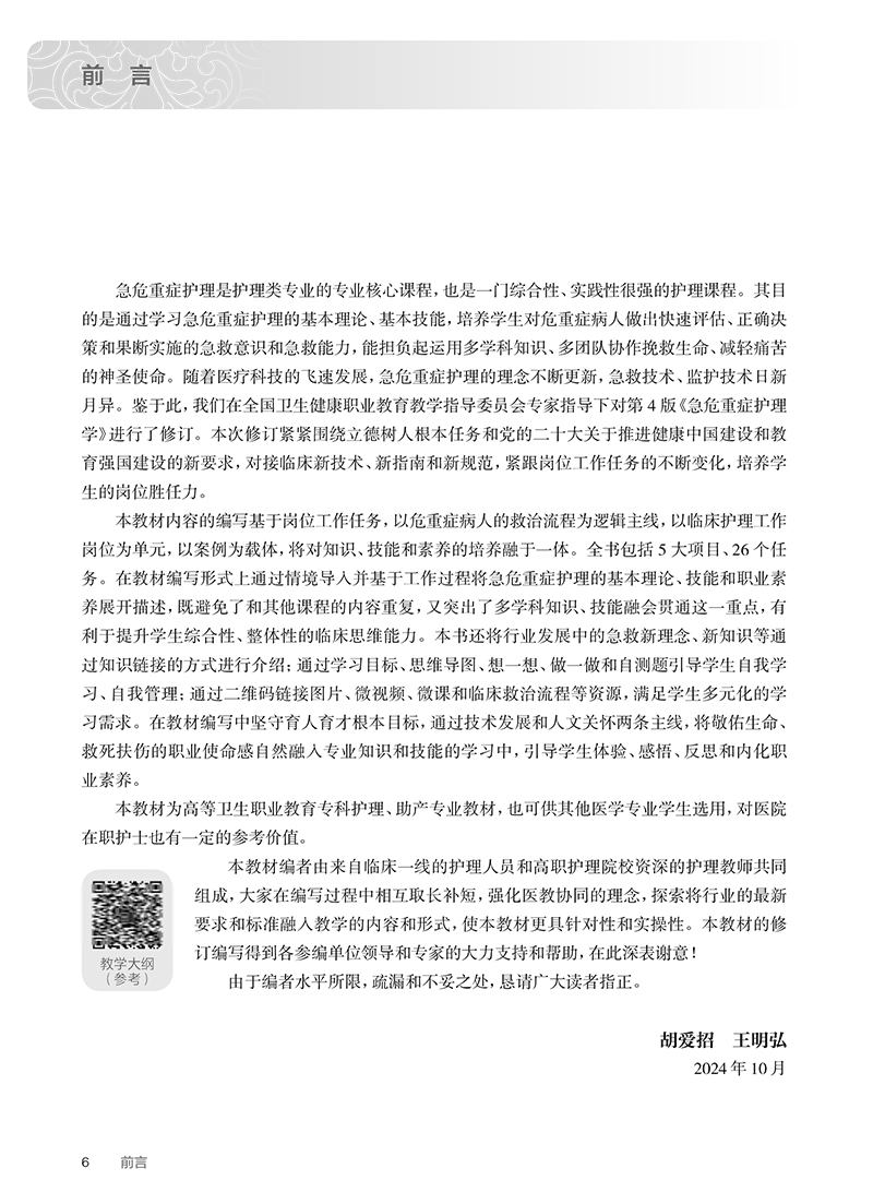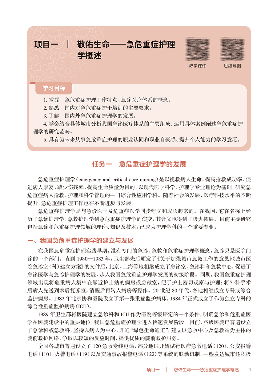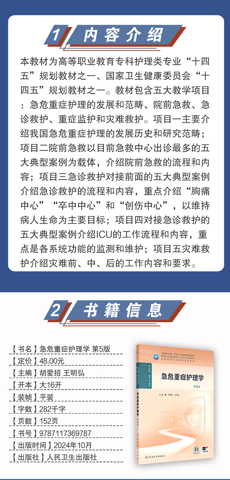 本教材为高等职业教育专科护理类专业“十四五”规划教材之一、国家卫生健康委员会“十四五”规划教材之一。教材包含五大教学项目:急危重症护理的发展和范畴、院前急救、急诊救护、重症监护和灾难救护。项目一主要介绍我国急危重症护理的发展历史和研究范畴;项目二院前急救以目前急救中心出诊最多的五大典型案例为载体,介绍院前急救的流程和内容;项目三急诊救护对接前面的五大典型案例介绍急诊救护的流程和内容,重点介绍“胸痛中心”“卒中中心”和“创伤中心”,以维持病人生命为主要目标;项目四对接急诊救护的五大典型案例介绍ICU的工作流程和内容,重点是各系统功能的监测和维护;项目五灾难救护介绍灾难前、中、后的工作内容和要求。