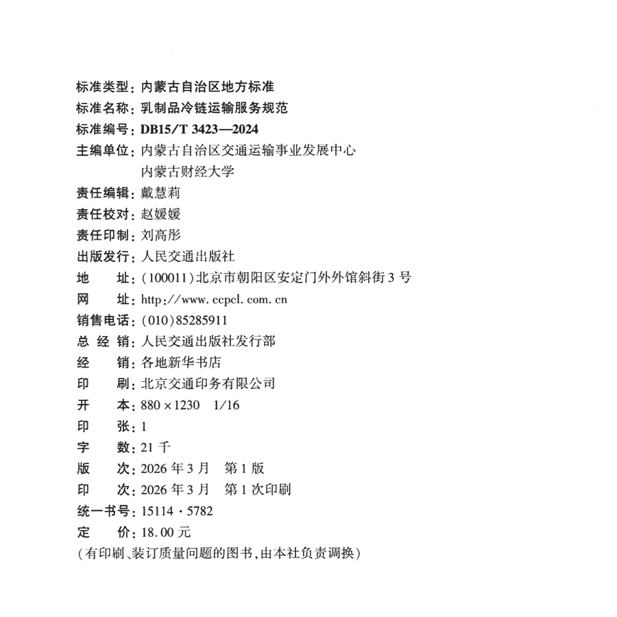 书名:乳制品冷链运输服务规范(DB15/T 3423-2024)