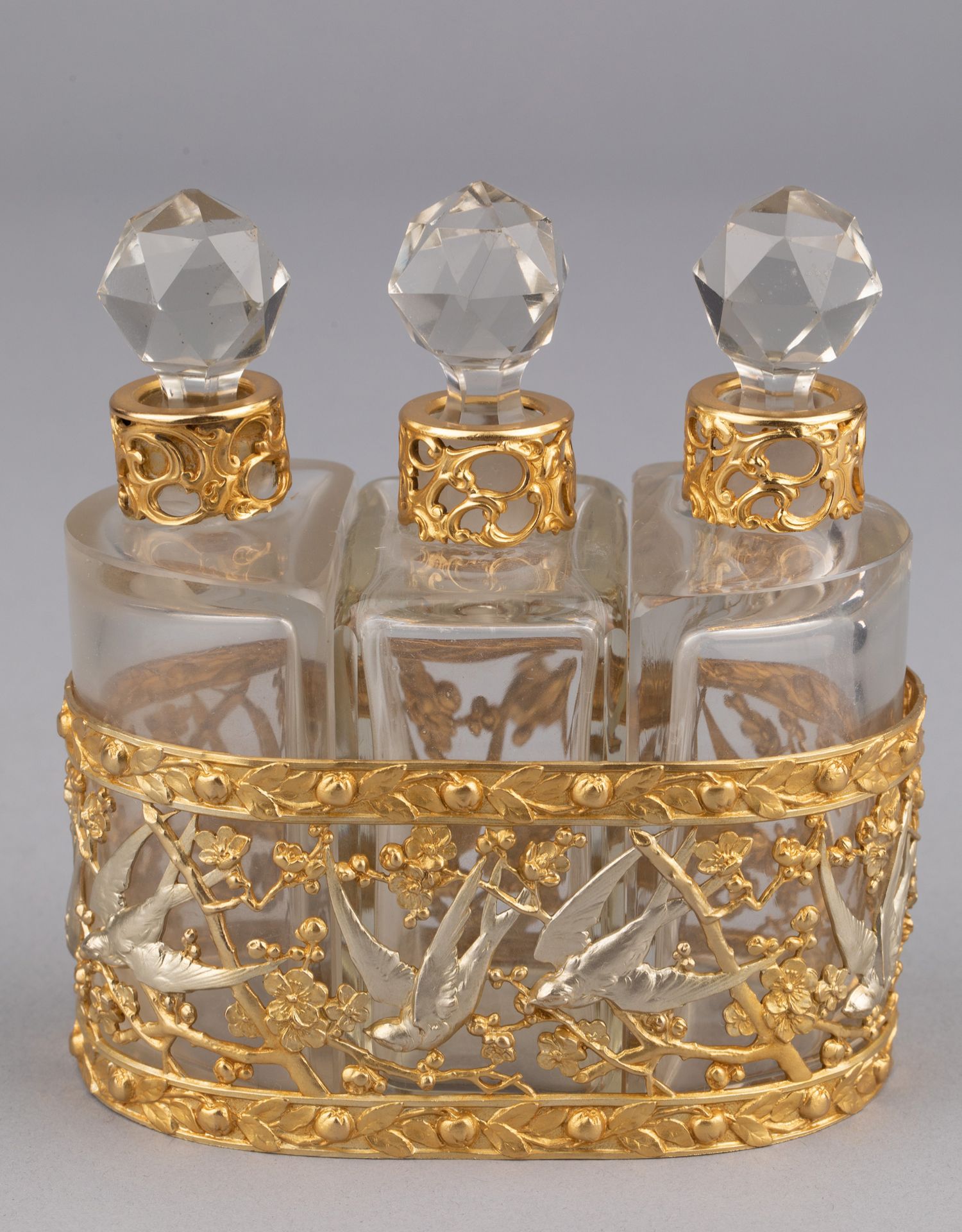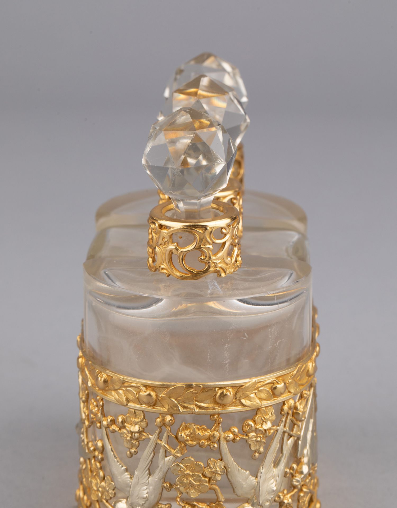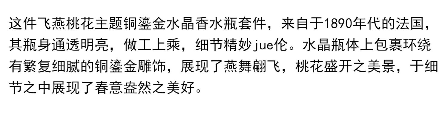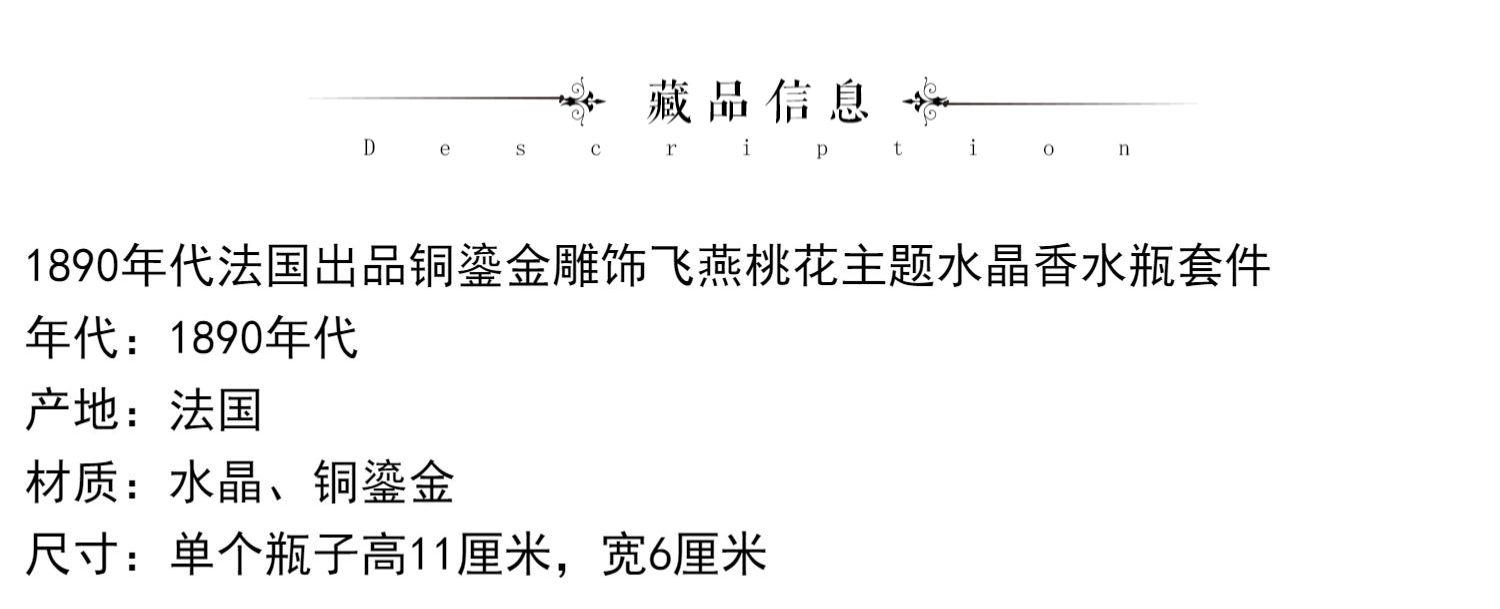 独角鹿西洋古董法国出品铜鎏金雕饰飞燕桃花主题水晶香水瓶套件