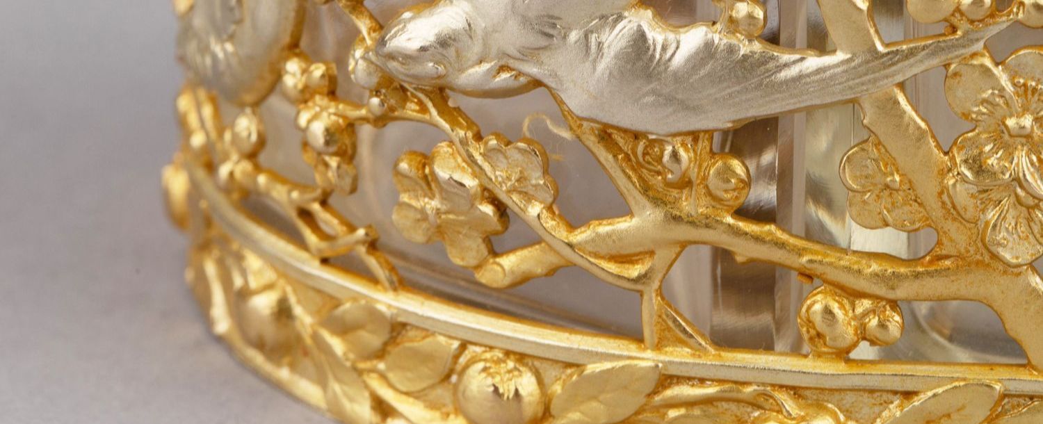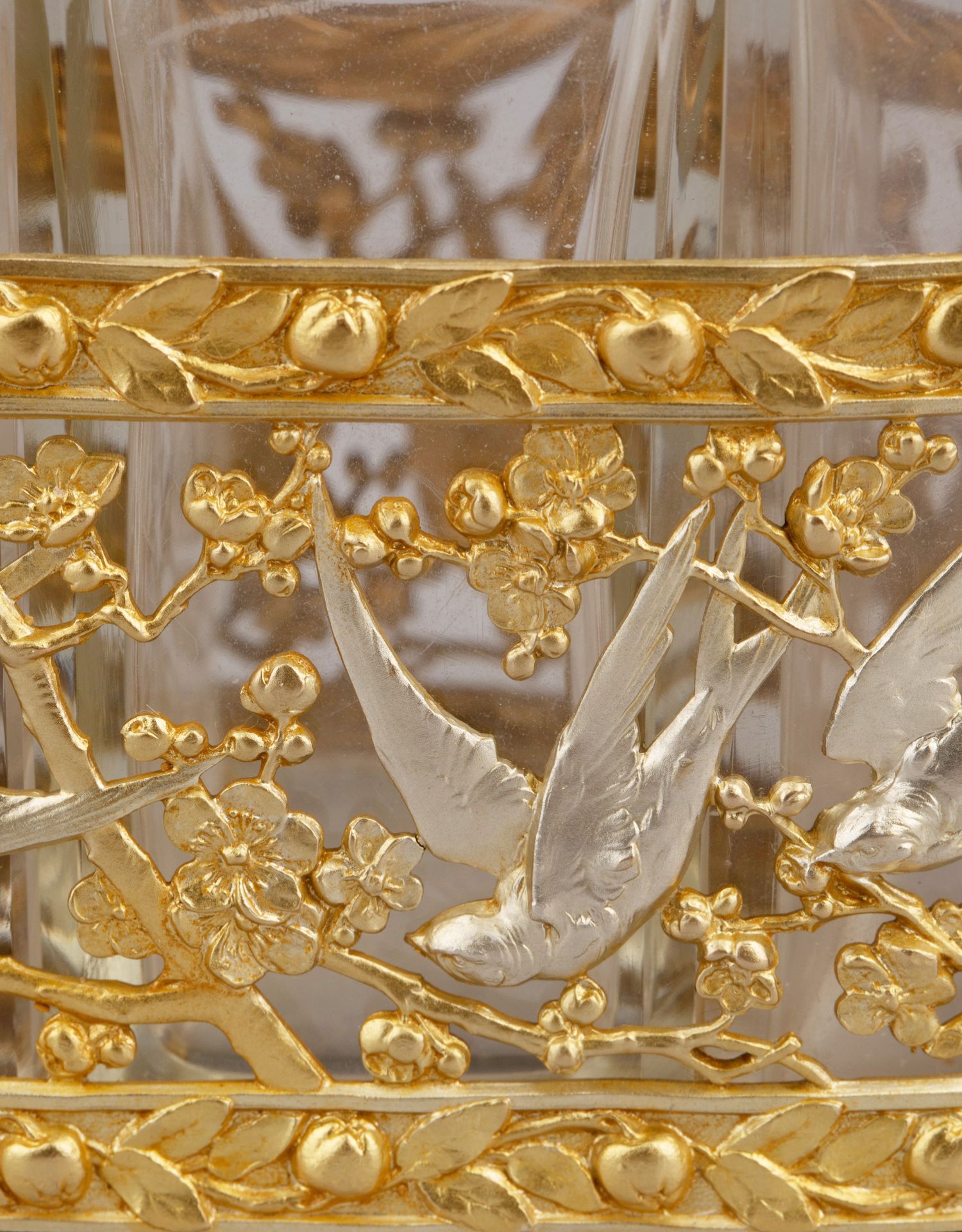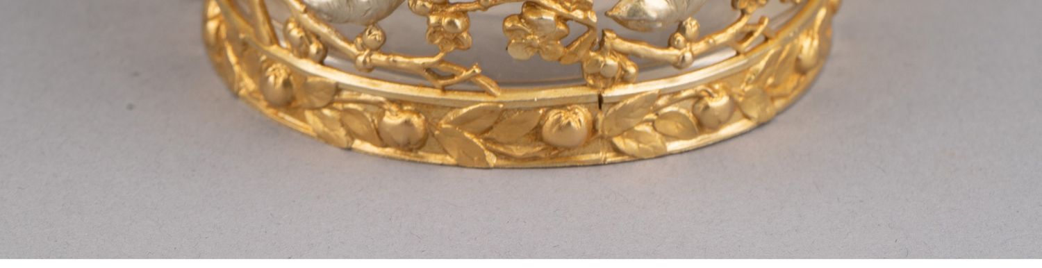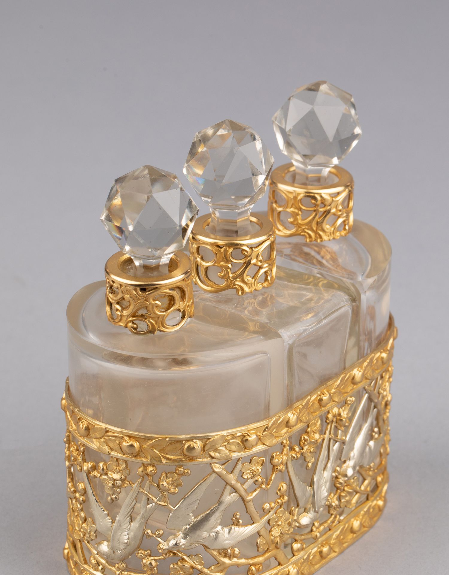 独角鹿西洋古董法国出品铜鎏金雕饰飞燕桃花主题水晶香水瓶套件