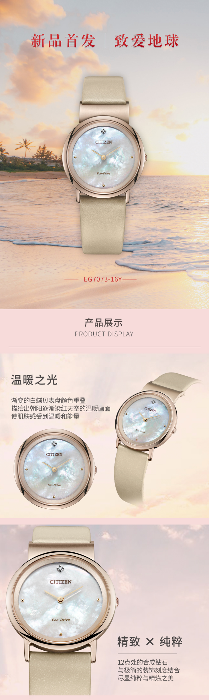 西铁城舒博钛樱花粉色光动能女表EG7073-16Y