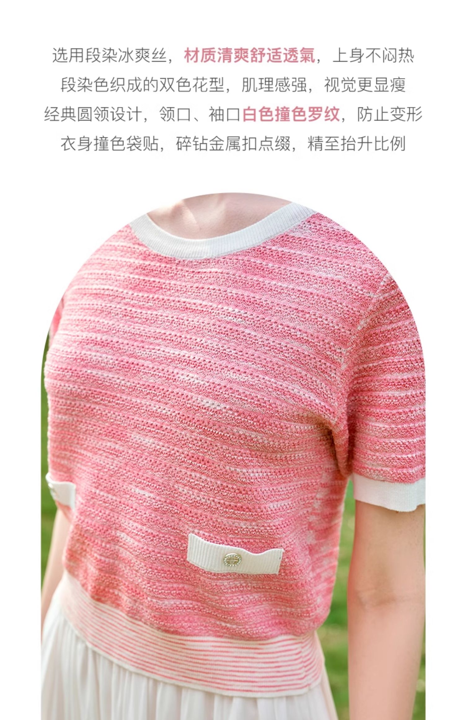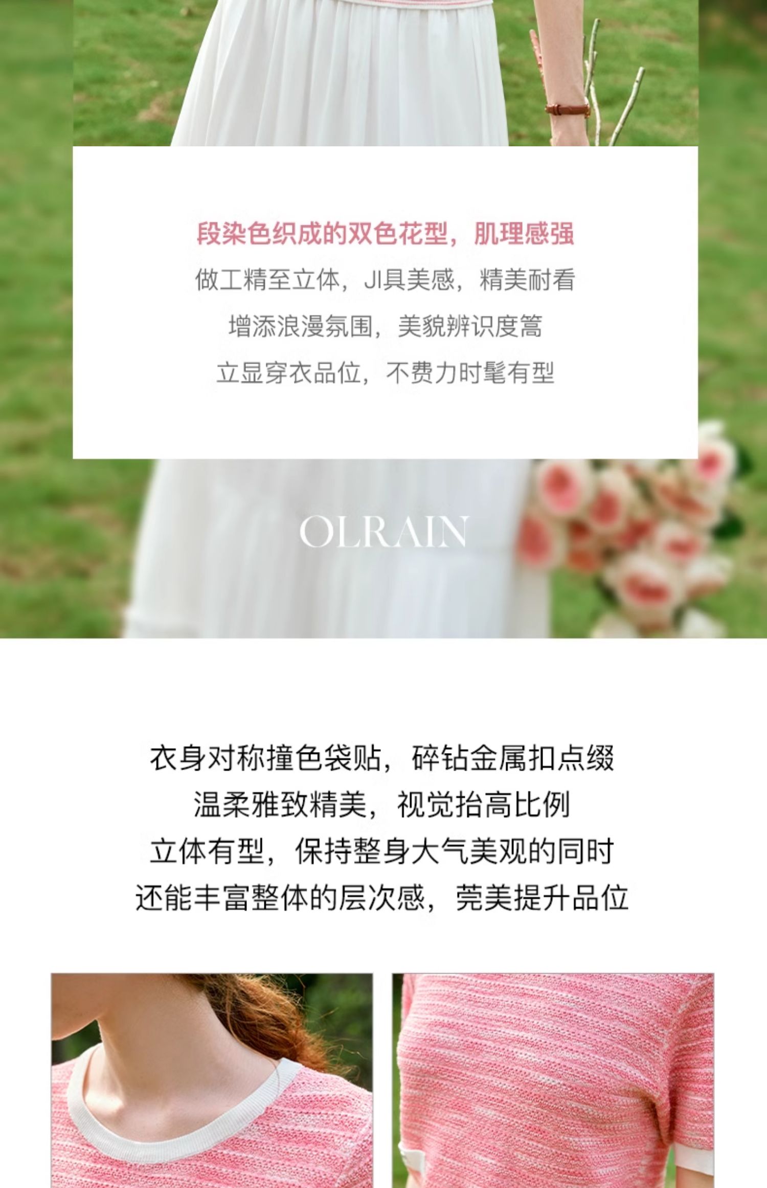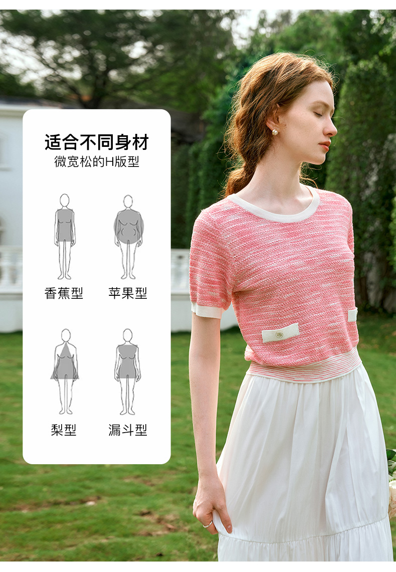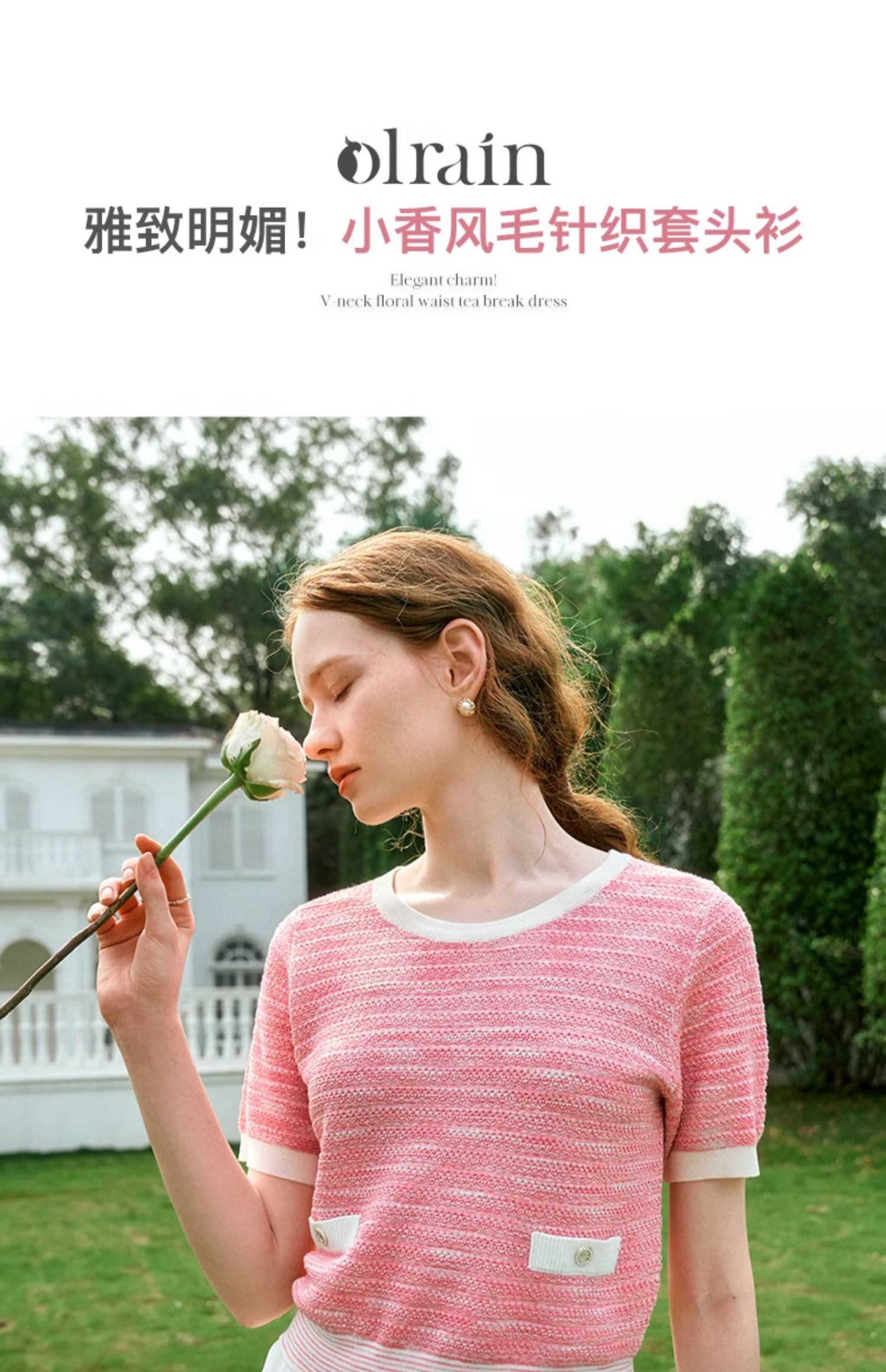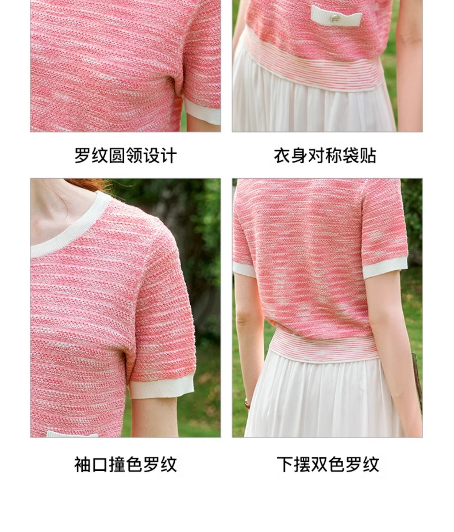 OLrain欧芮儿粉色圆领针织衫女夏季2024年新款小香风宽松套头短袖