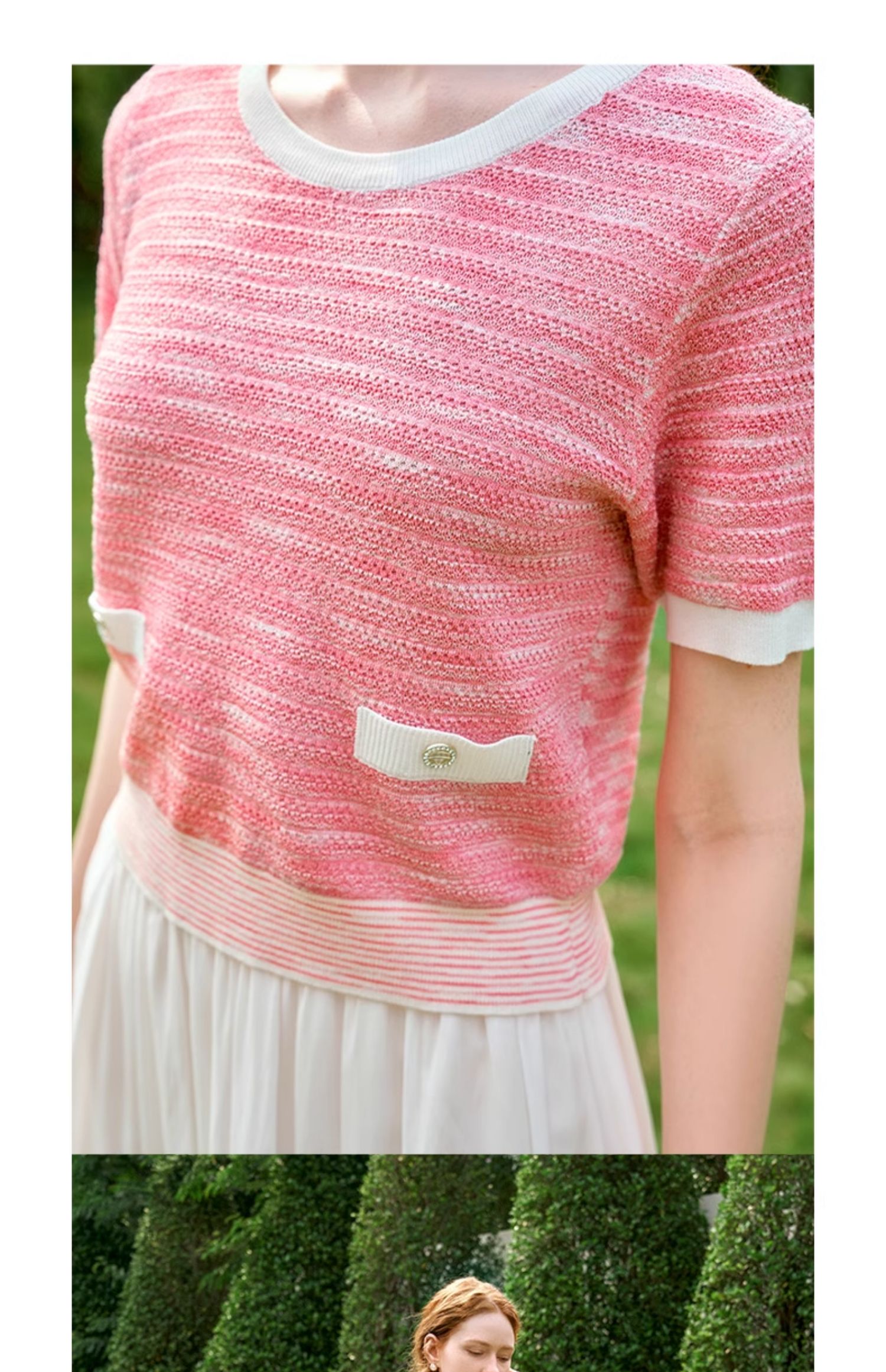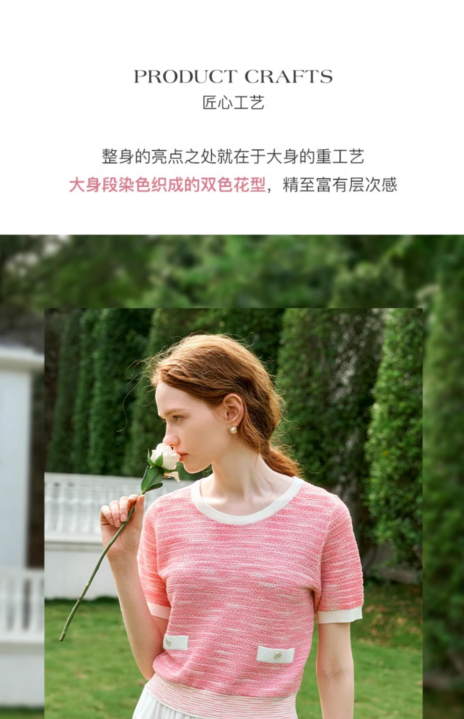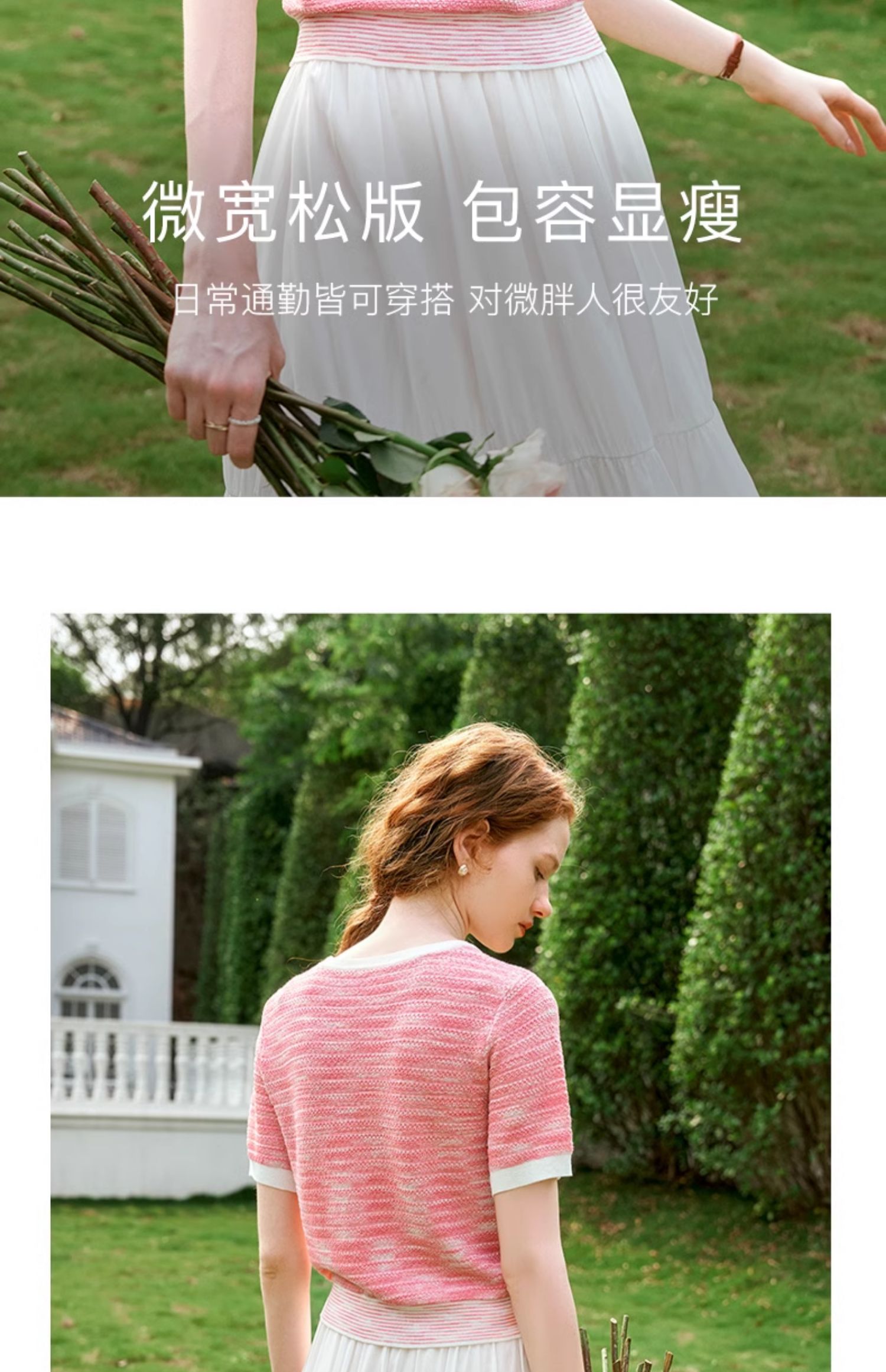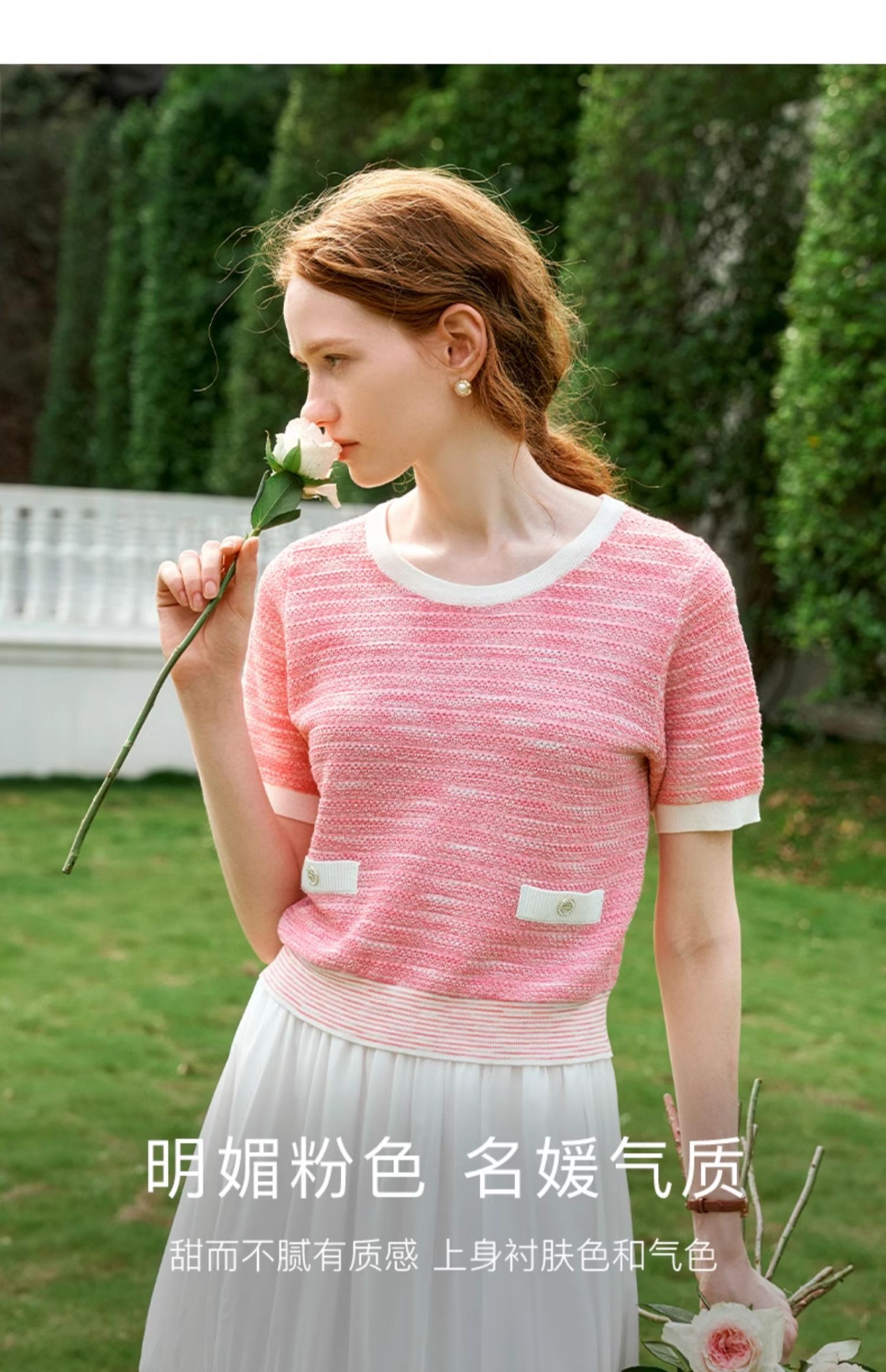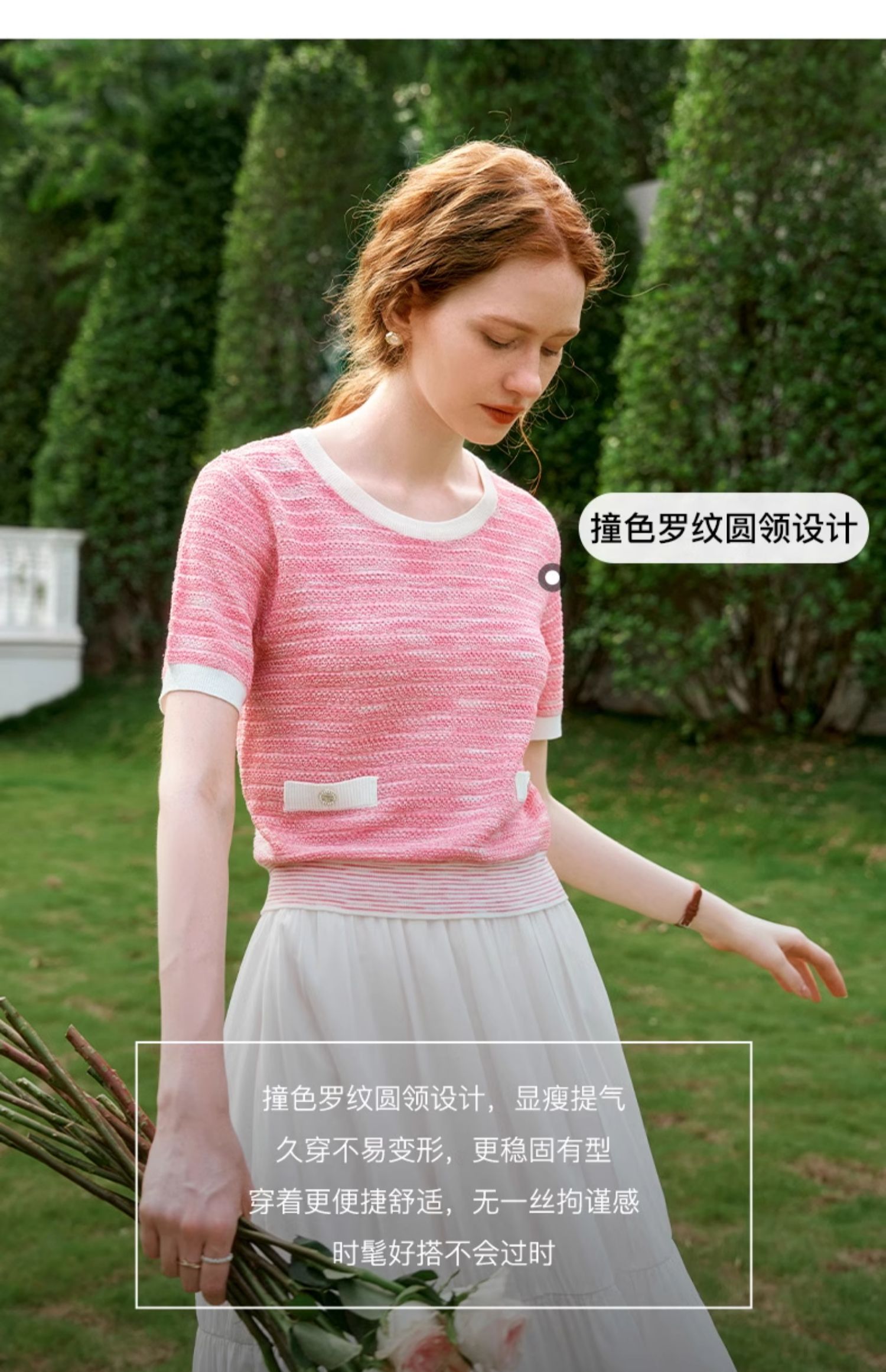 OLrain欧芮儿粉色圆领针织衫女夏季2024年新款小香风宽松套头短袖
