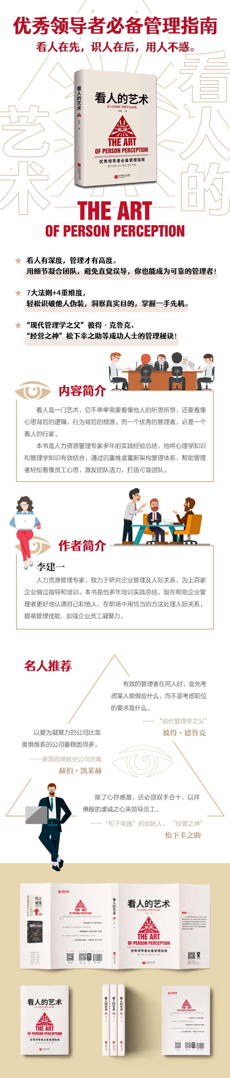 1.管理的本质是看人。搞定人,才能搞定管理。 看人是门艺术,每个员工在工作中都会透露出个人特质,不论是姿势、语气,还是做事风格,都在默默地映射出一个人真实的看法、取向和工作潜力。只有看破他们的内心,管理者才能因人而异,合理安排工作,有效提升管理质量。 2.四重维度架构管理体系,搭配七大看人法则,内外结合提升管理水平。 本书根据管理对象的不同,将管理划分为四个维度,从内在分析针对不同人群特点的管理方法,同时作者提出了七条极具实用价值的看人法则,帮助读者通过外在表现识破他人伪装,以便选择相应的管理方式,优化个人管理。 3.权威知识结合真实案例,剖析式解读,帮助管理者摆脱识人不清的困局,实现职场进阶。 作者将心理学知识和管理学技巧相结合,通过丰富的真实案例和个人经验,帮助管理者突破心思猜不到、做事没章法、问题讲不清的困局,切实建立个人管理风格,打造靠谱团队,实现个人进阶。