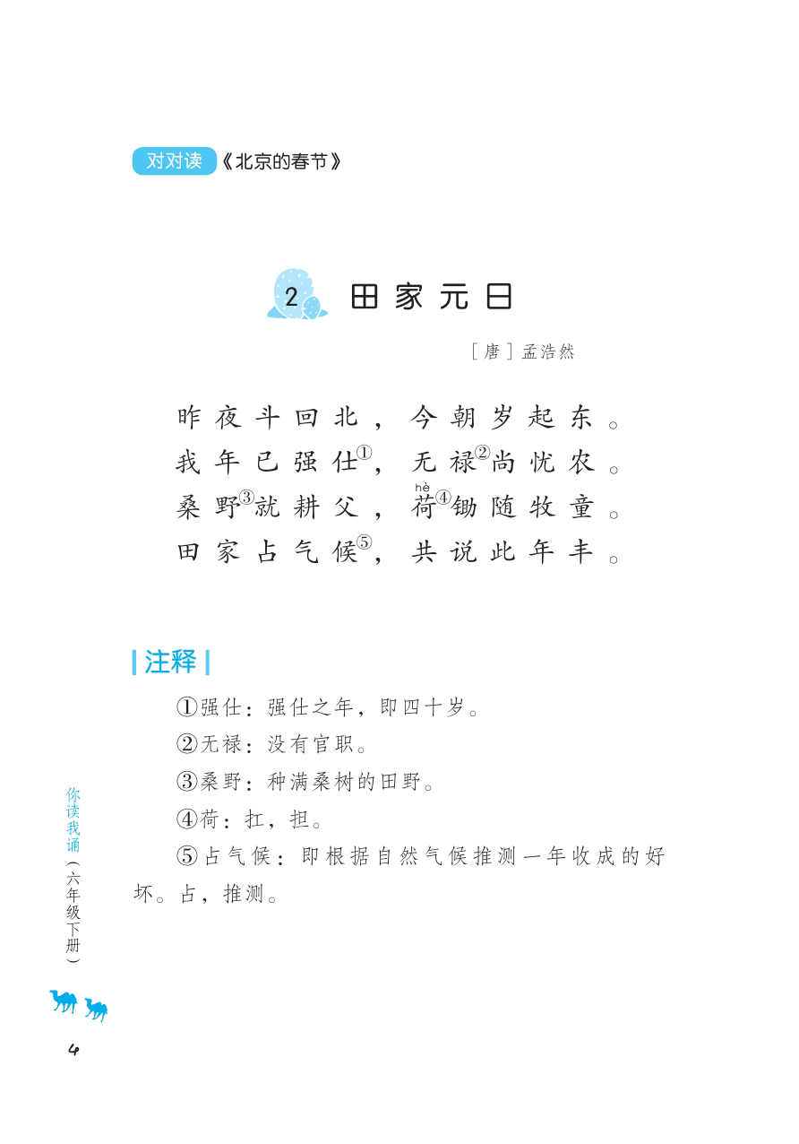 不论是老师还是家长,都可以像下面的例子这样,用“读”来提示孩子背诵,也就是“你读我诵”。比如六年级上册第四单元“革命理想”主题中李大钊的《口占一绝》:
