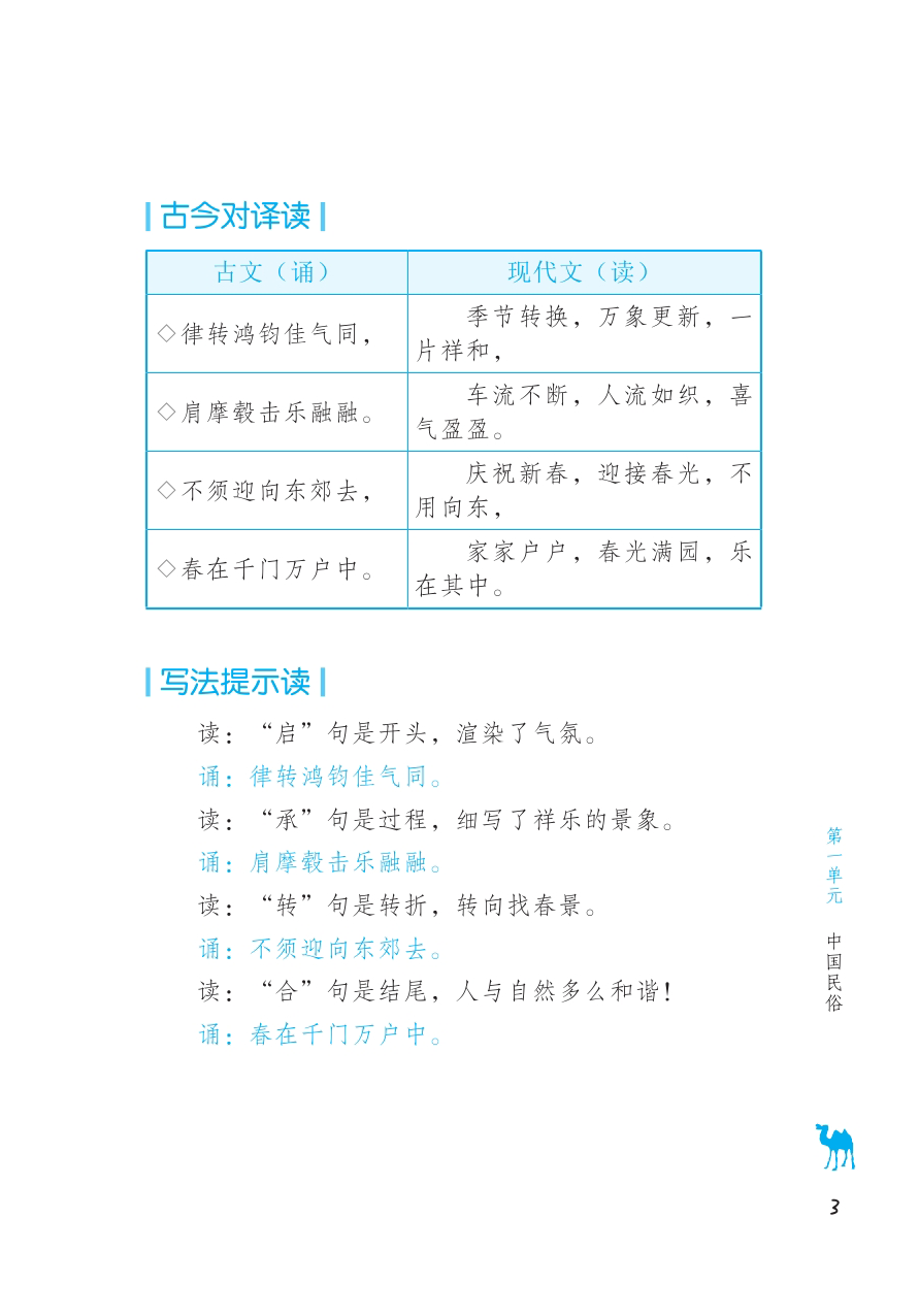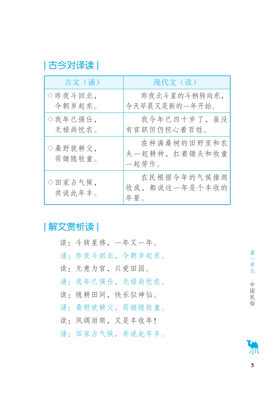 3.其他如对联、成语、谚语、小古文等,每册有25篇左右,约占30%。这些内容短小易于背诵,同时又蕴含了丰富的中国文化与智慧。
