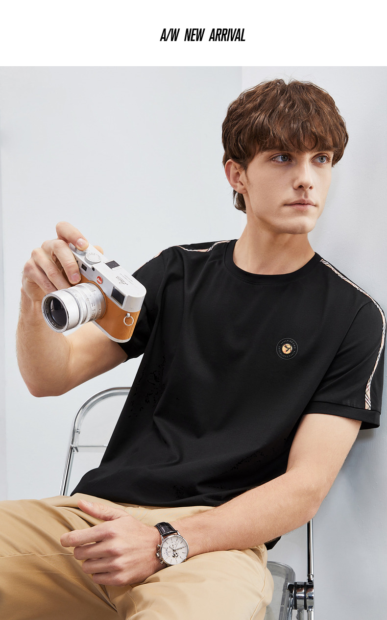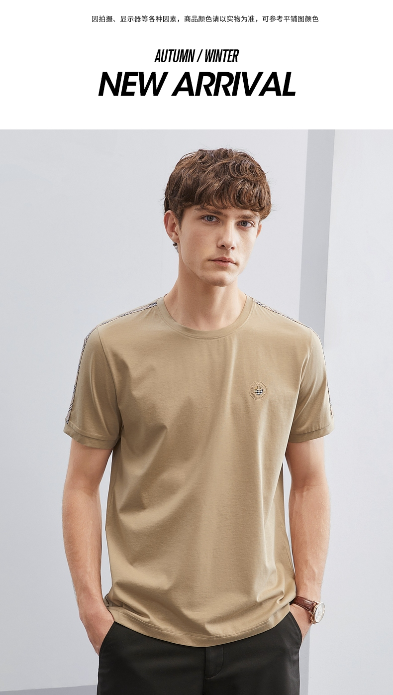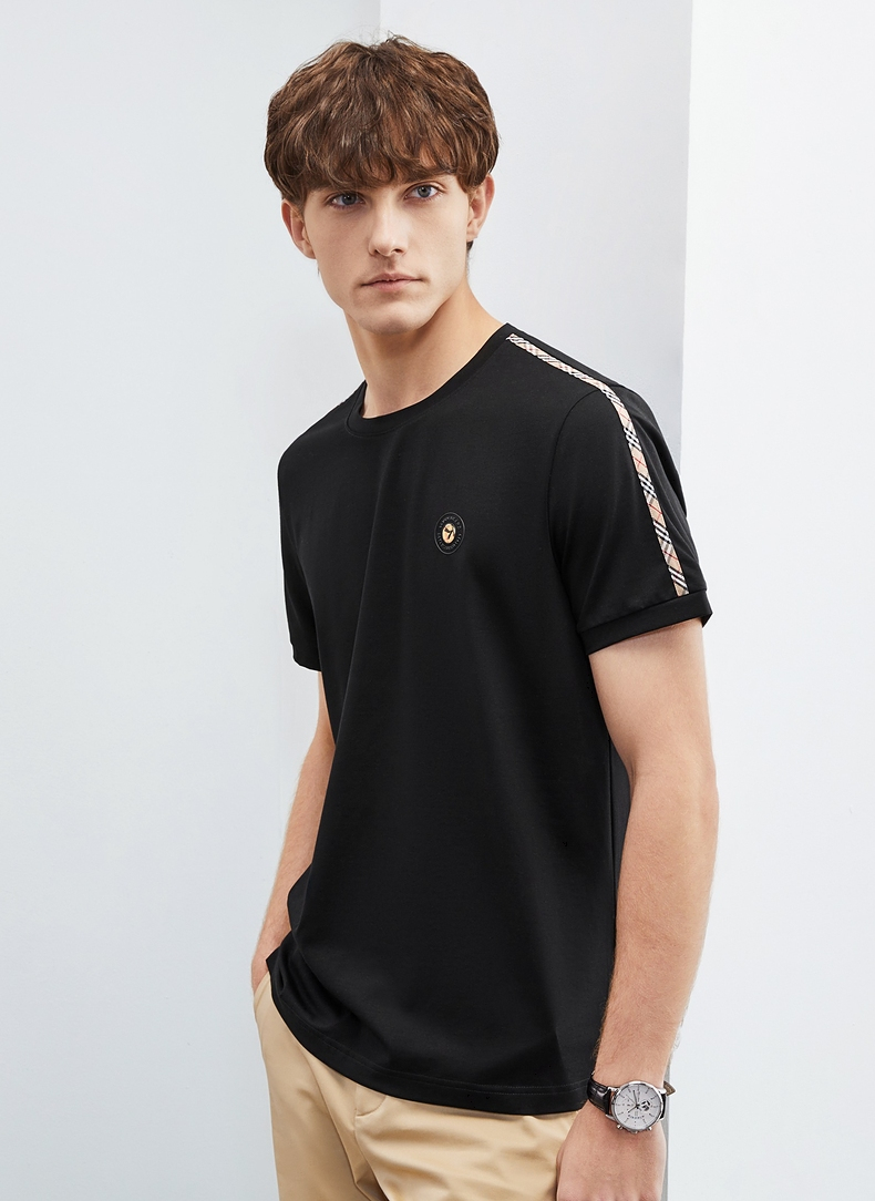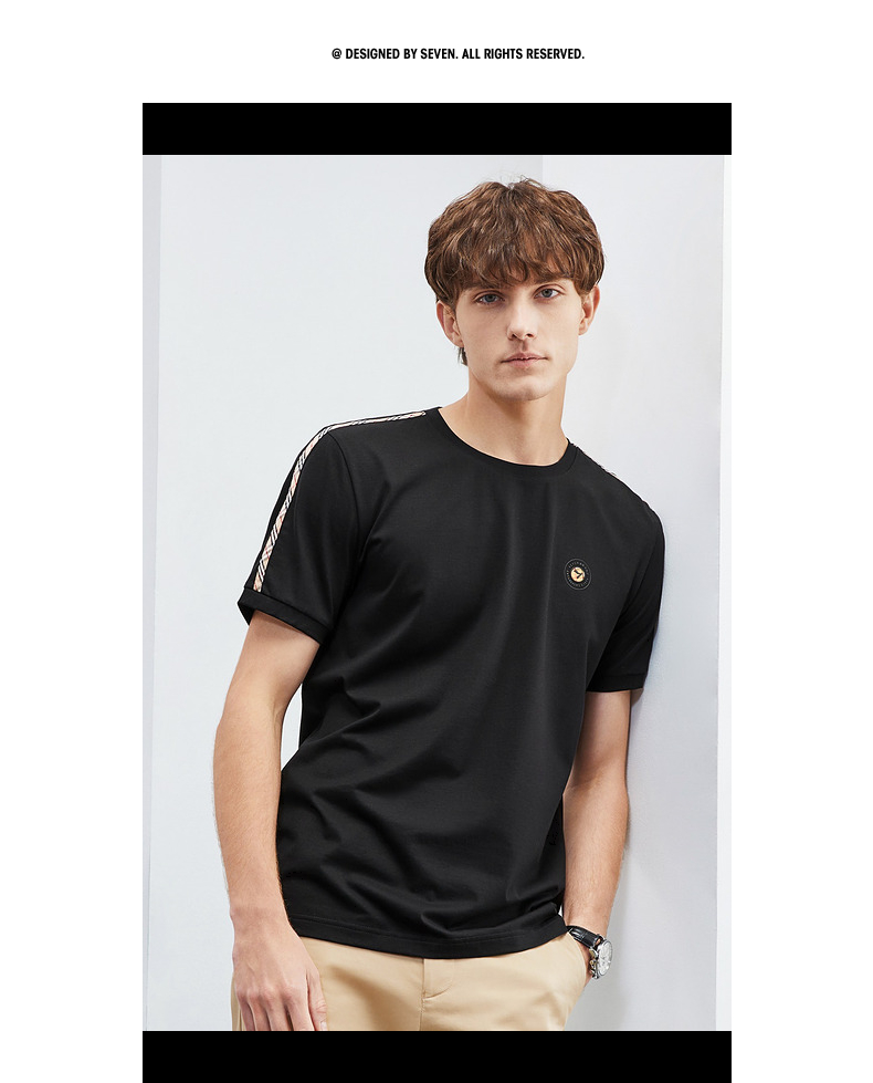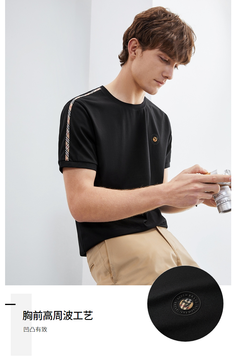 柒牌短袖t恤男夏季新款时尚休闲中青年男士格纹织带圆领上衣124T73010