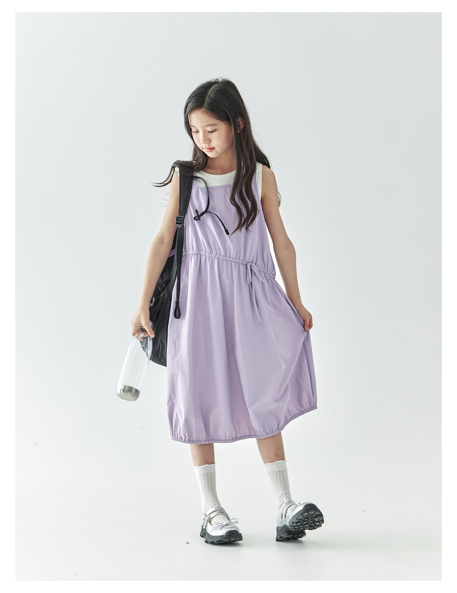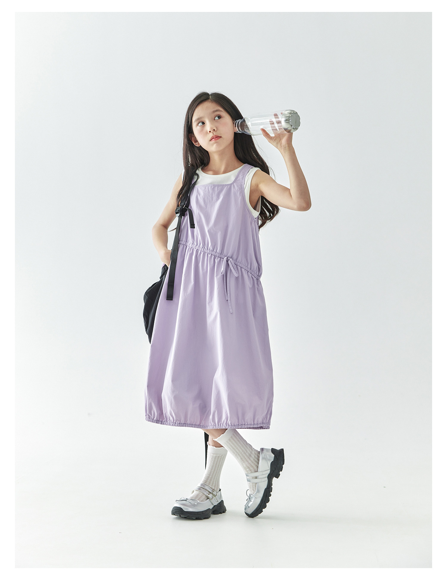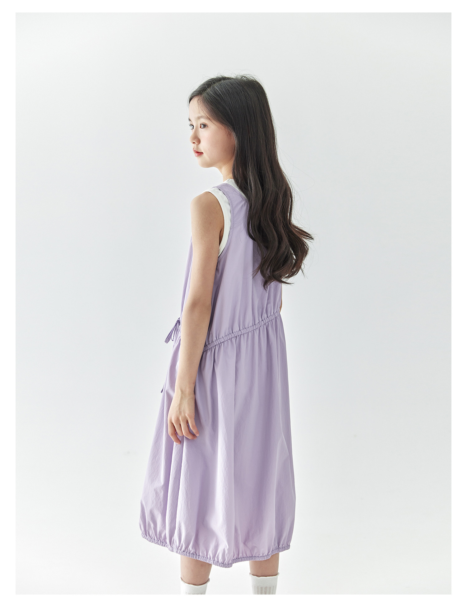 【代发】紫色尼龙连衣裙 棵初夏季款女童工装裙子不规则腰线纯色亲子花苞裙