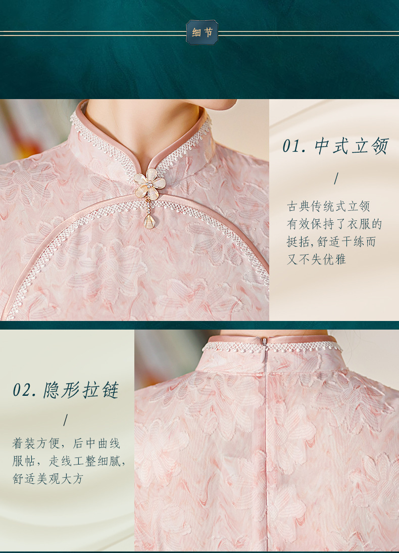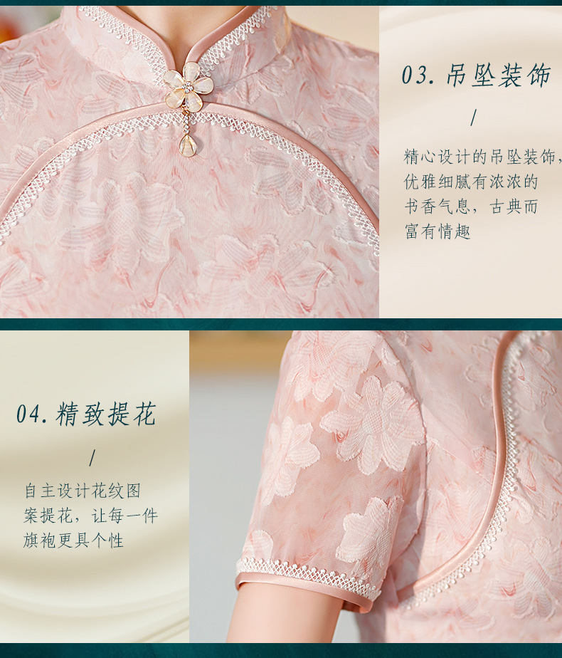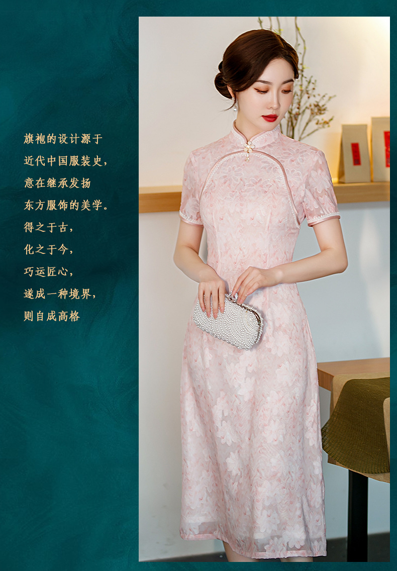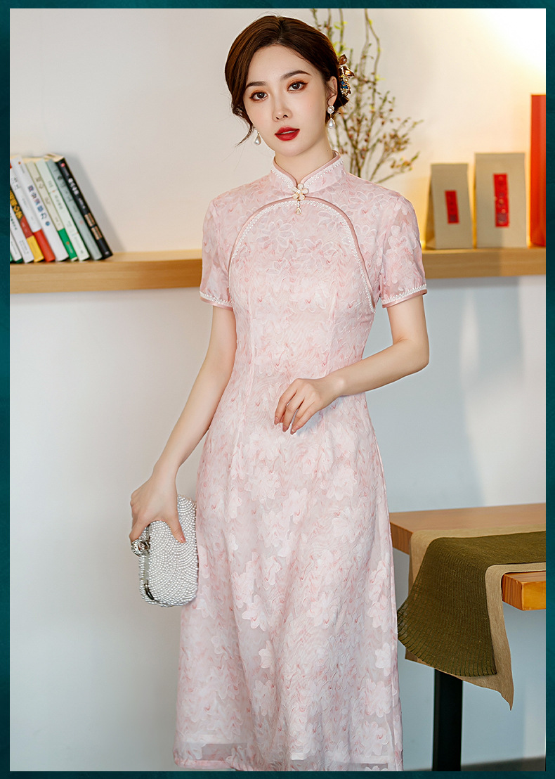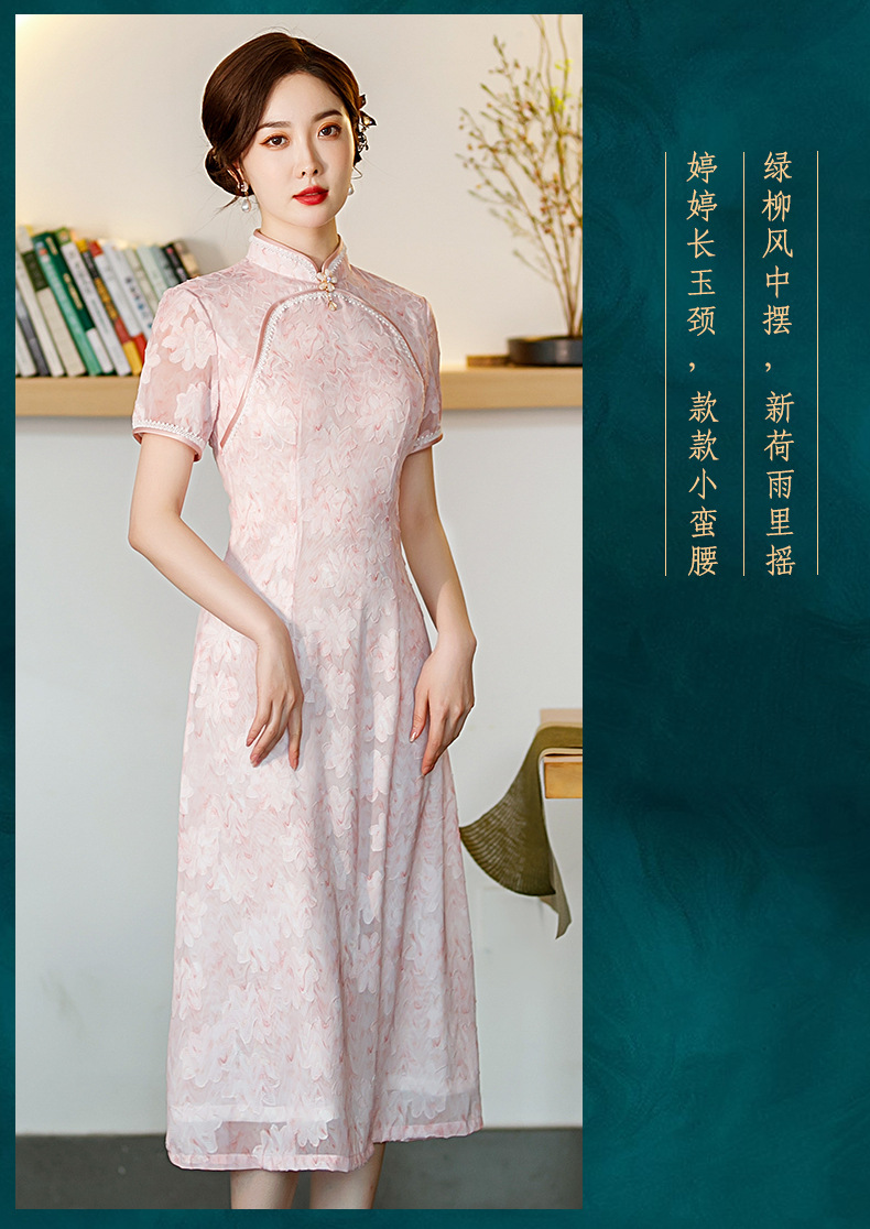新款中长款粉色提花开叉改良中国风礼服旗袍连衣裙 ST-B2076