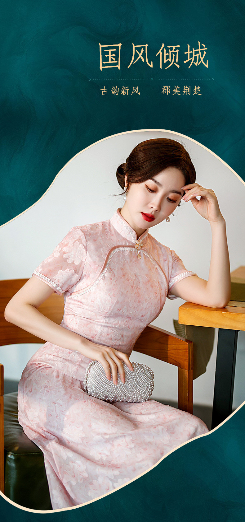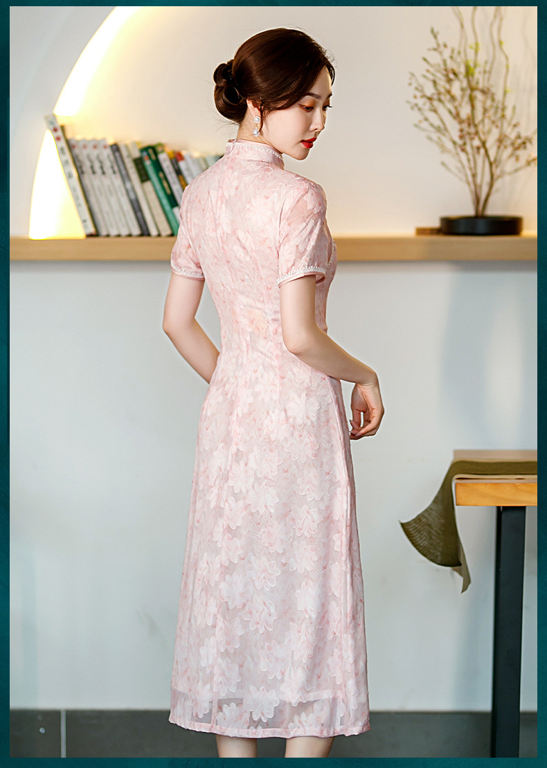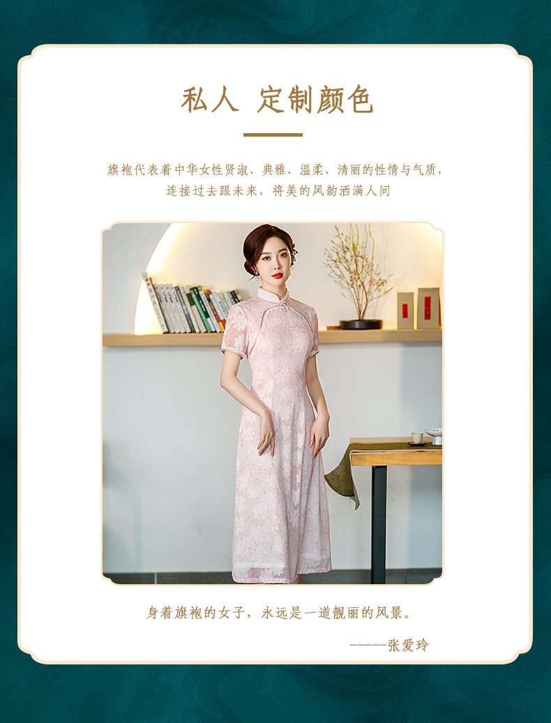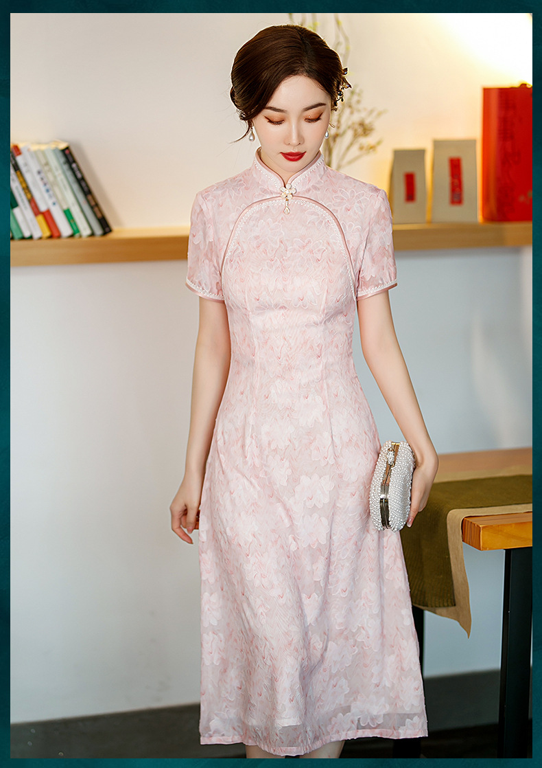 新款中长款粉色提花开叉改良中国风礼服旗袍连衣裙 ST-B2076