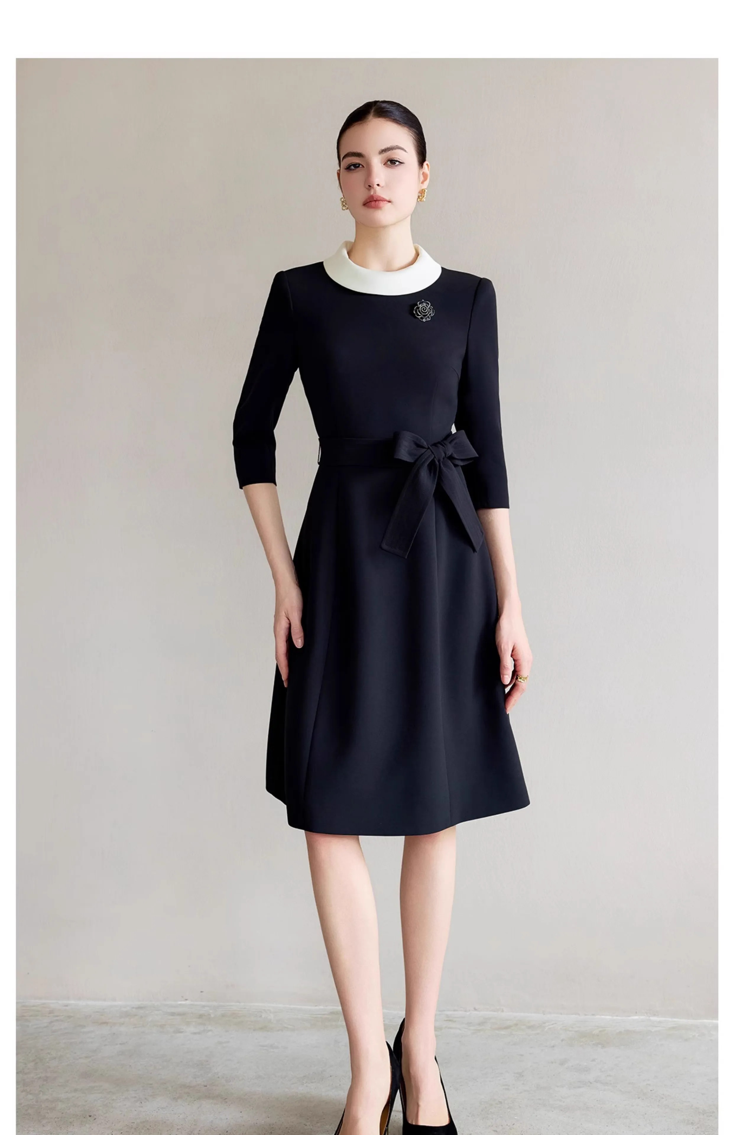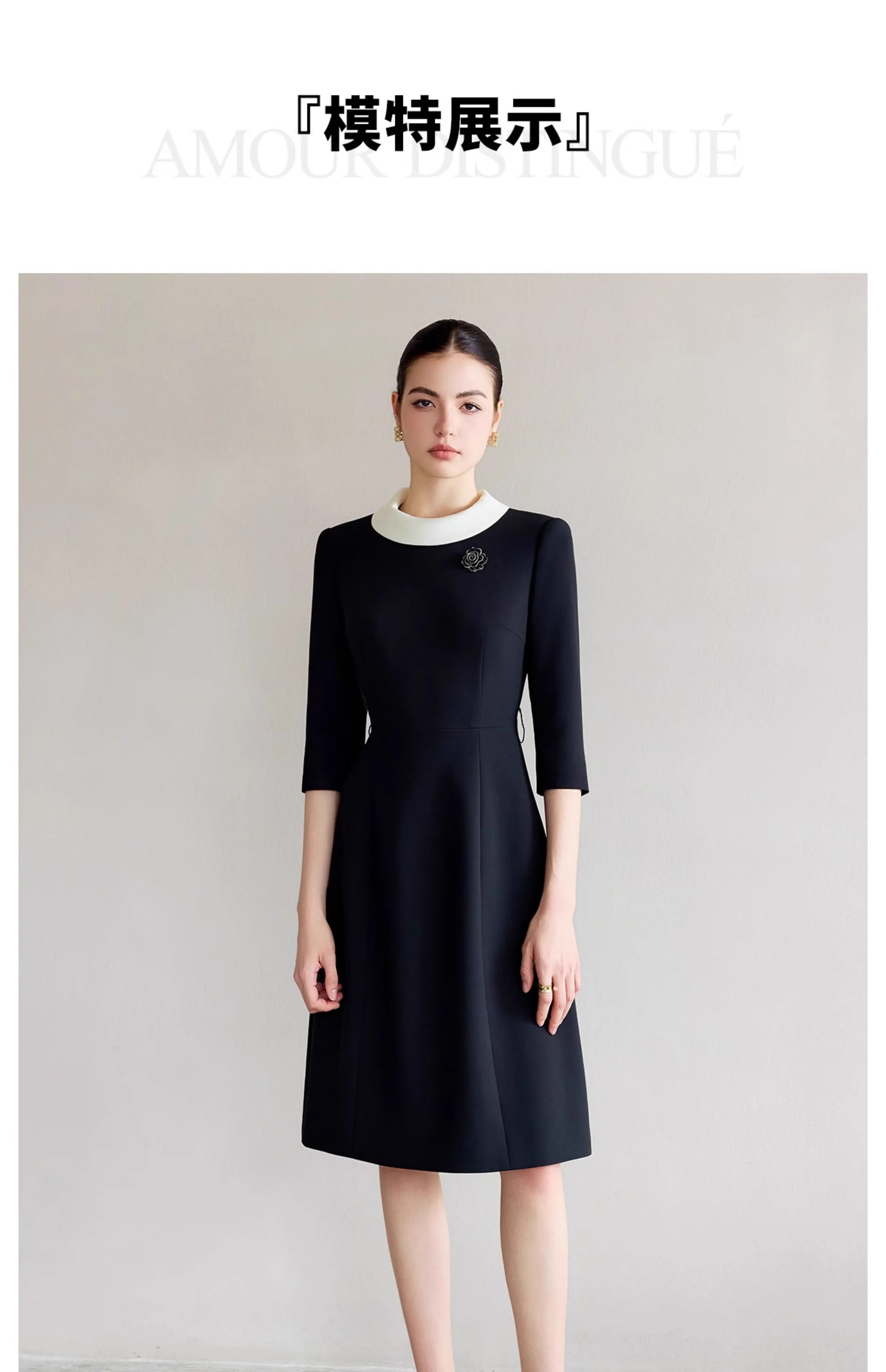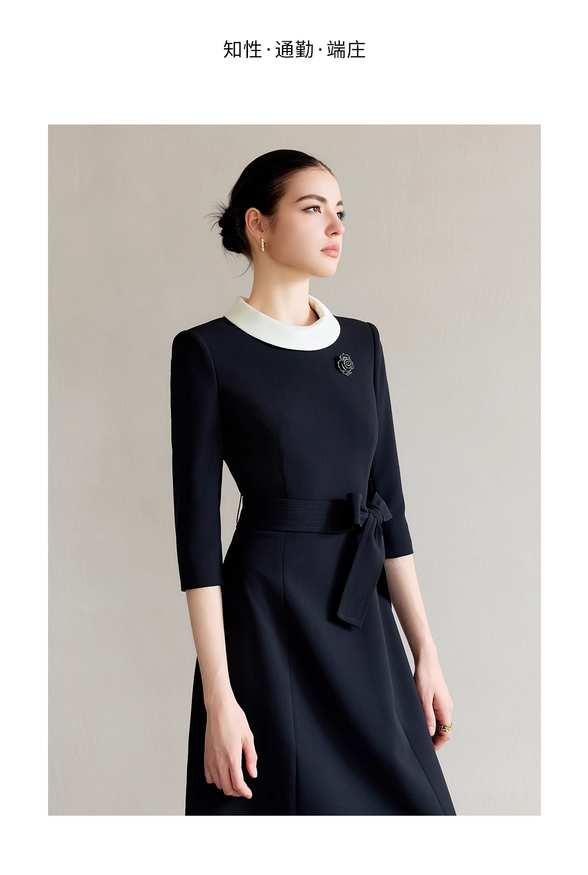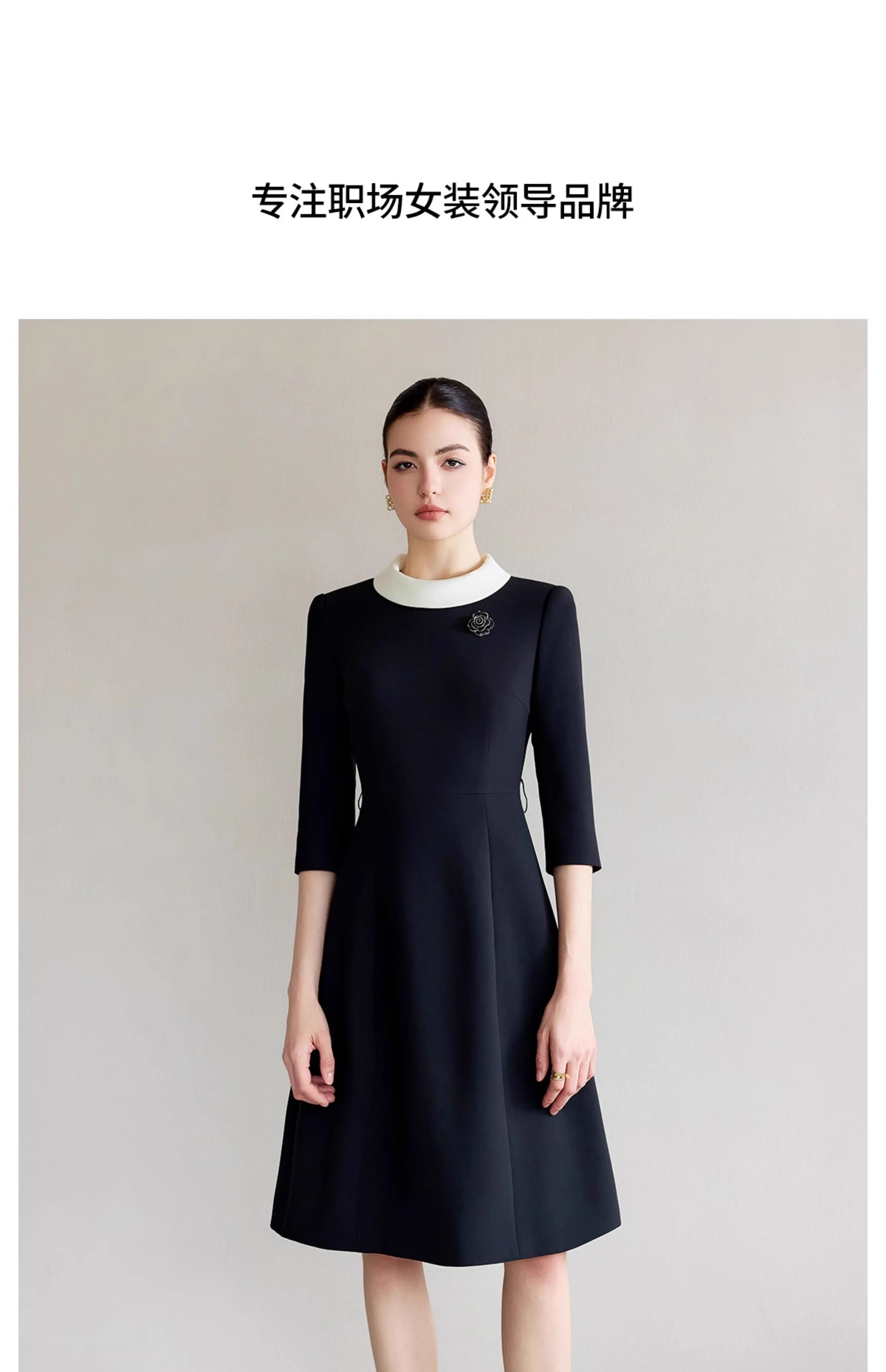 IWY/法式赫本风连衣裙高级感黑色接拼米色缎面翻圆领职业西服a字裙Q1302