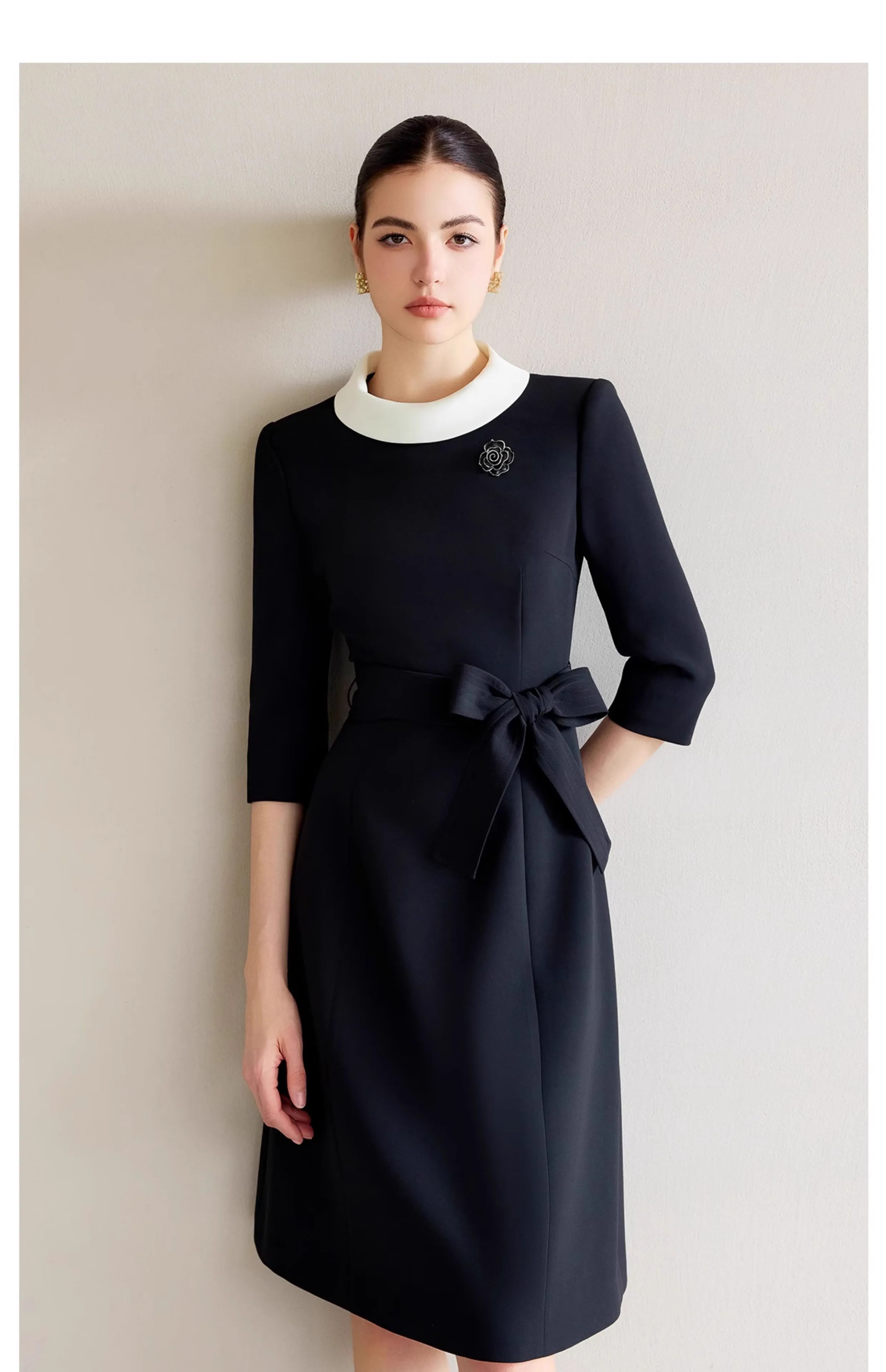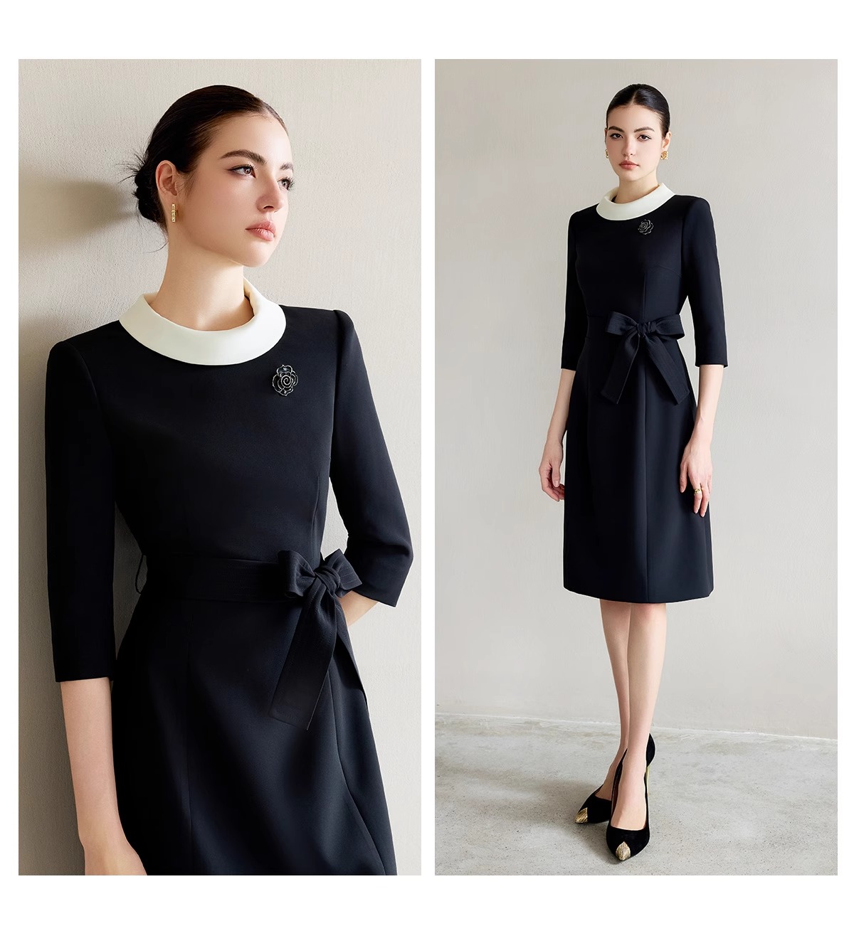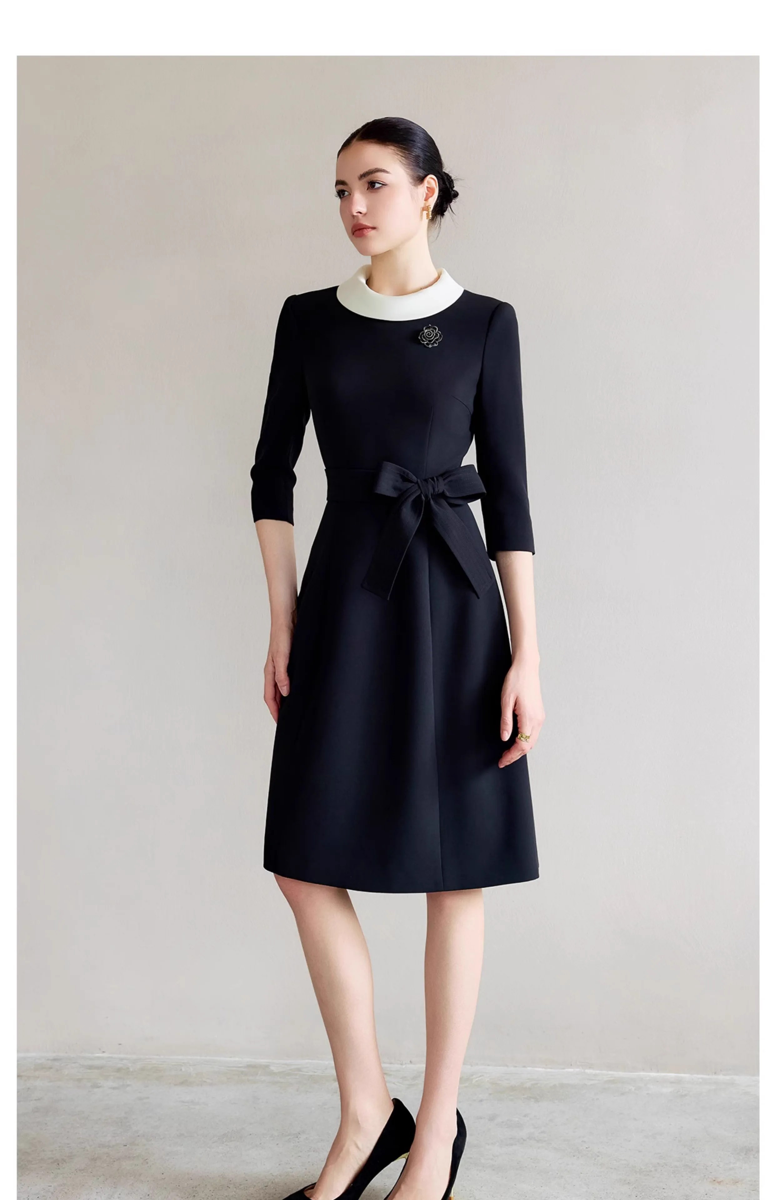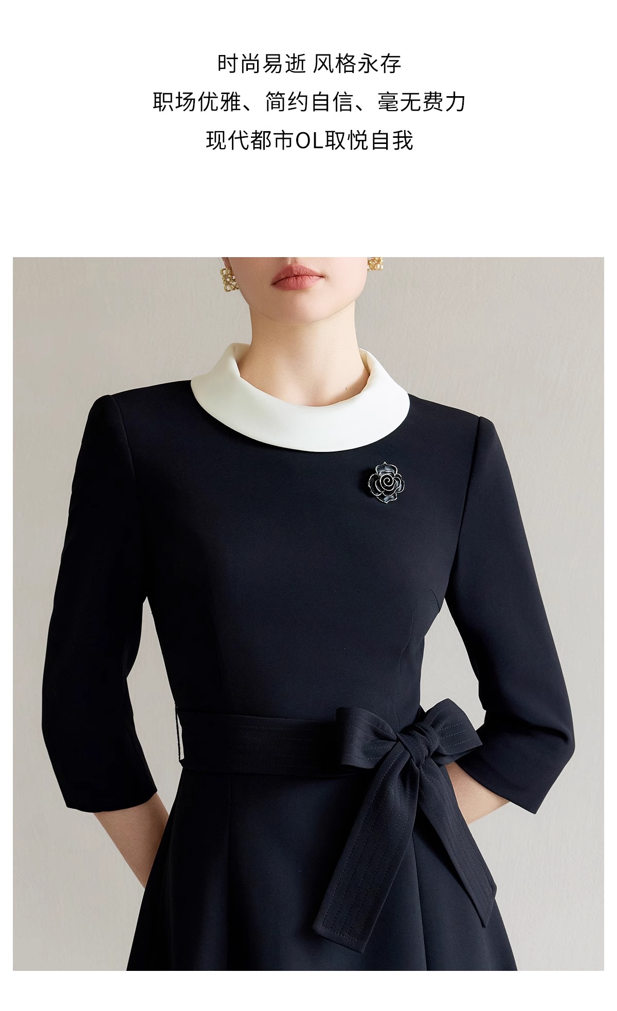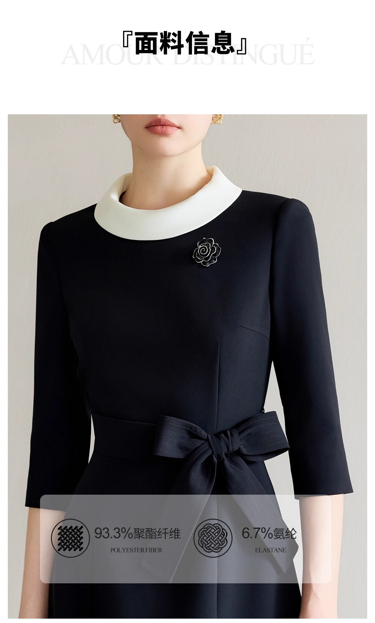 IWY/法式赫本风连衣裙高级感黑色接拼米色缎面翻圆领职业西服a字裙Q1302