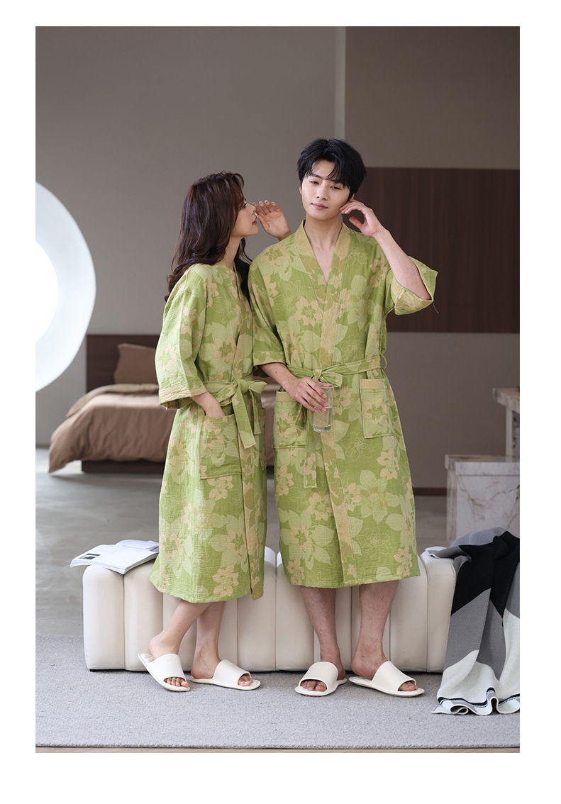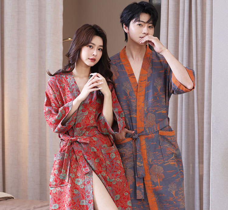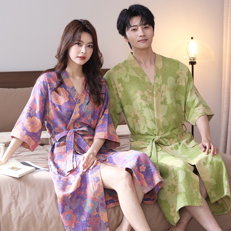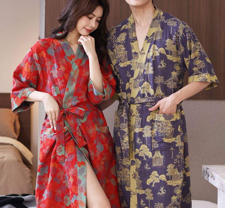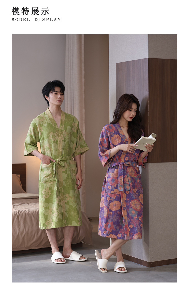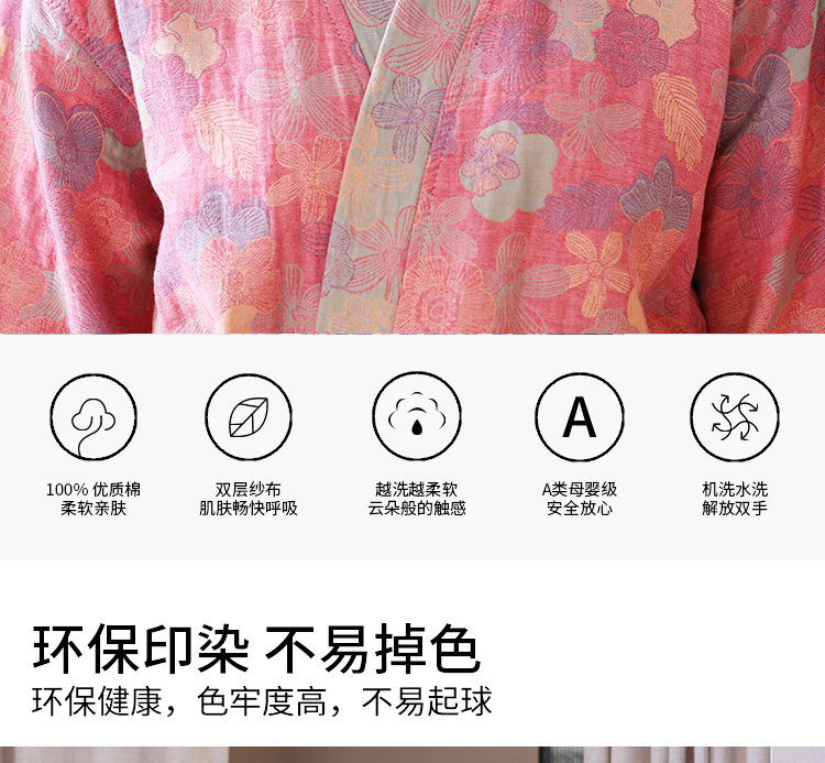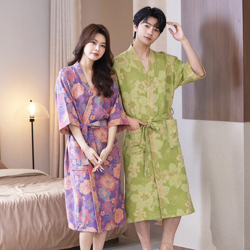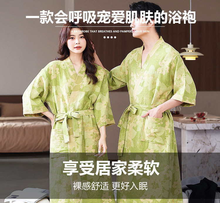 【优质天 然棉、双层纱越洗越柔软】a类春夏薄款睡衣纯棉双层纱布浴袍家居服睡袍情侣款吸水速 干浴衣.TA