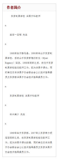 日本*威糕点制作学校——东京制果学校建校60年来,教材大公开!强大讲师阵容强强联手创作!书中讲述了课堂必学的100多个技巧和秘诀+500多张图解步骤说明。看完本书,如同亲临东京制果学校,瞬间接近大师水平! n书中部分,介绍了25款经典甜点与配方,包括草莓鲜奶油蛋糕、水果蛋糕卷、提拉米苏、蒙布朗、奶酪蛋糕、玛德琳、费南雪、焦糖布丁等众多备受欢迎的蛋糕种类。蛋糕制作基础中的基础,就是海绵蛋糕体。鸡蛋的选用、混合材料的时间等细节,都会对成品质量造成影响。当然,也不能忽略制作当天的气温和湿度。还有*后的点缀装饰,也起到升华作品效果的重要作用。 n书中第二部分,介绍了相关巧克力糕点的制作。对于巧克力来讲,温度控制至关重要。仅仅1~2℃的温差,就会影响到成品的味道与口感。使用烘焙专用温度计,始终确保正确的温度范围。就装饰来说,有多种多样的装饰方法。可以从*简单的方法入手,循序渐进地去进阶挑战。与蛋糕相同,反复操作才是通往成功的捷径。 n |