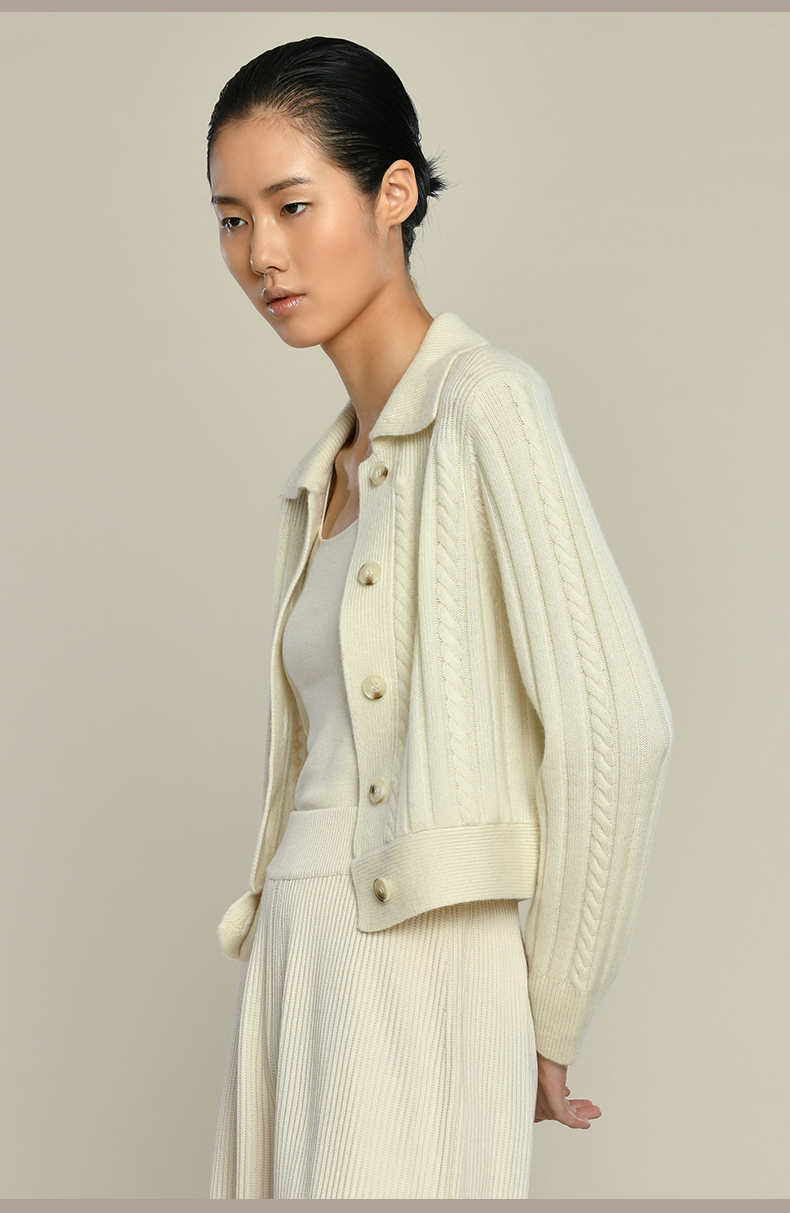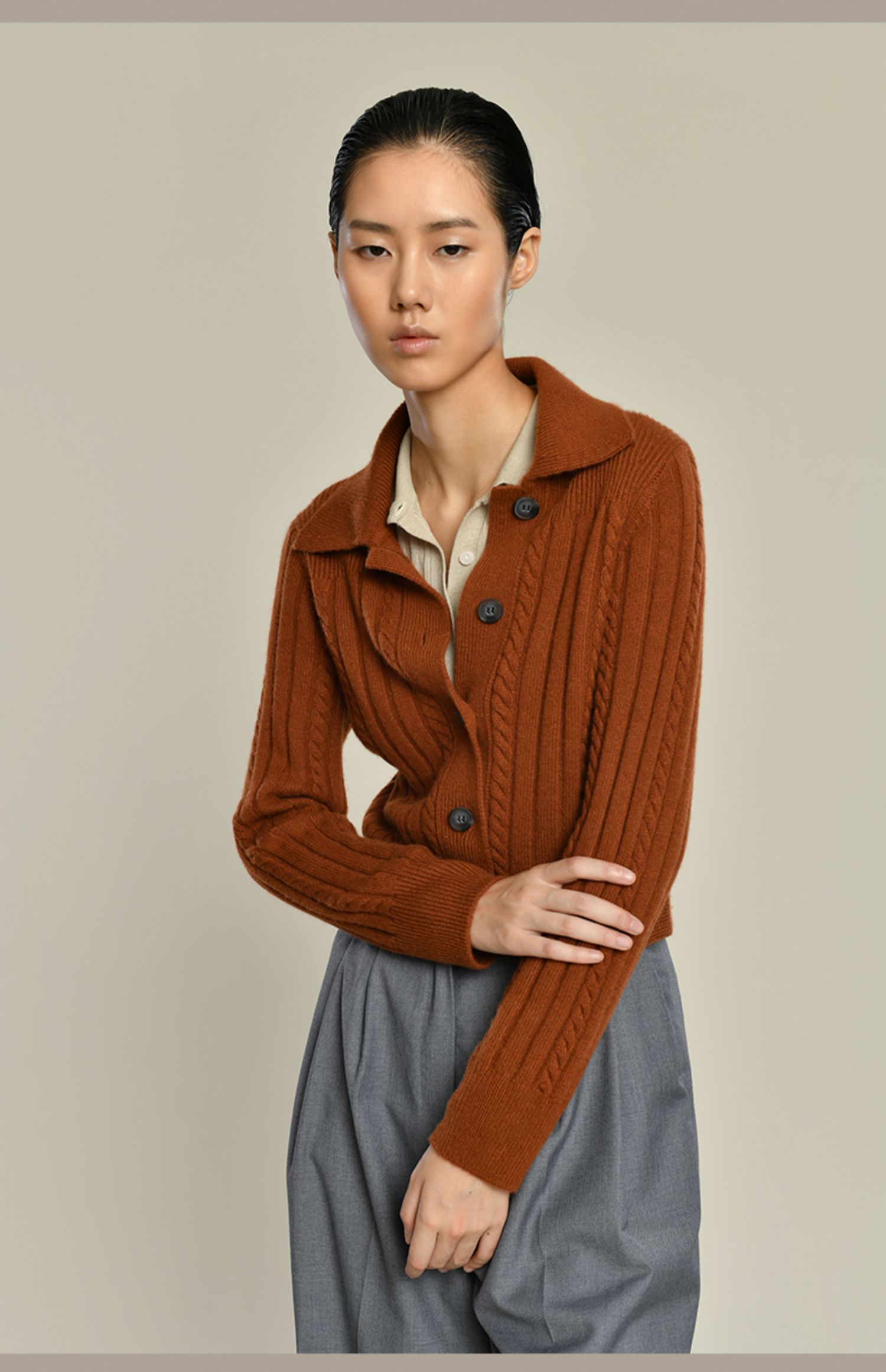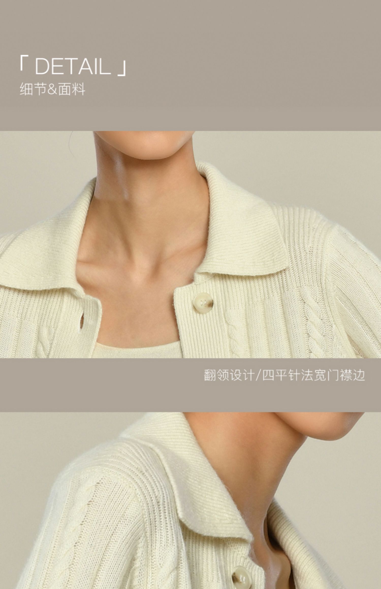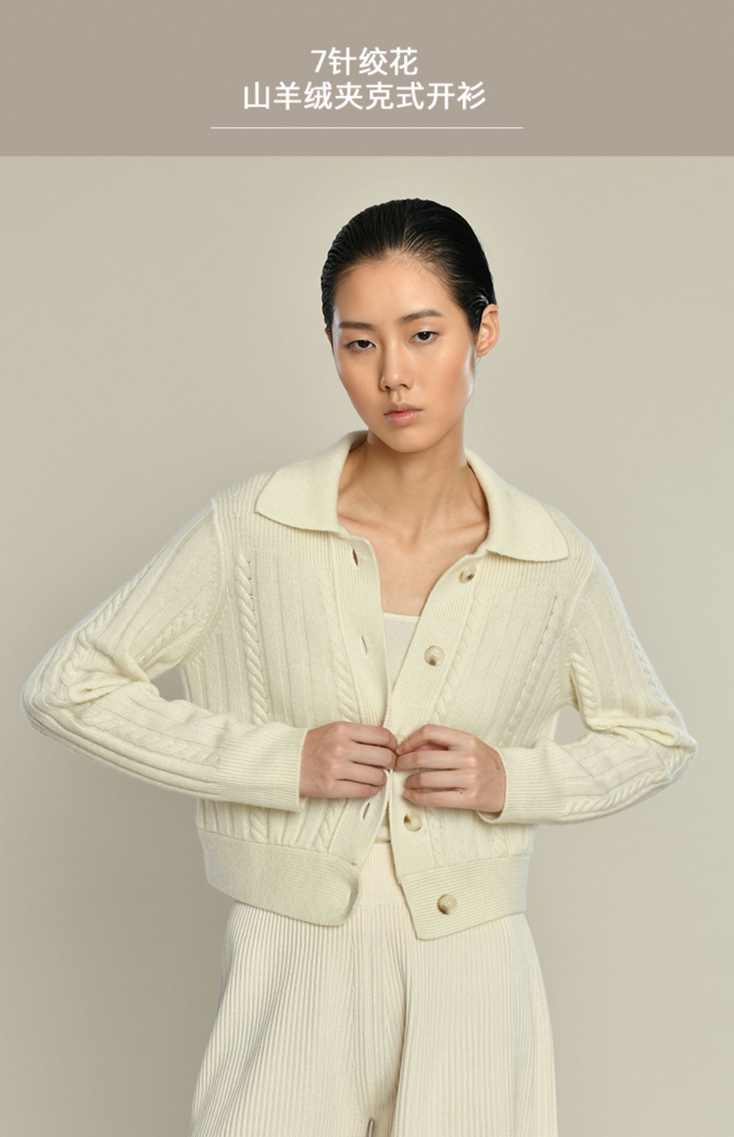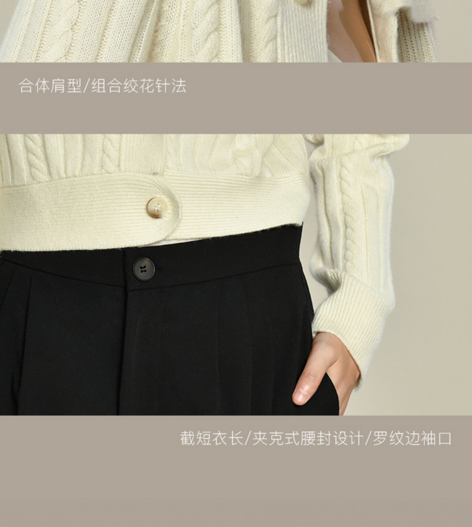 女士2021新款纯山羊绒翻领短款绞花开衫