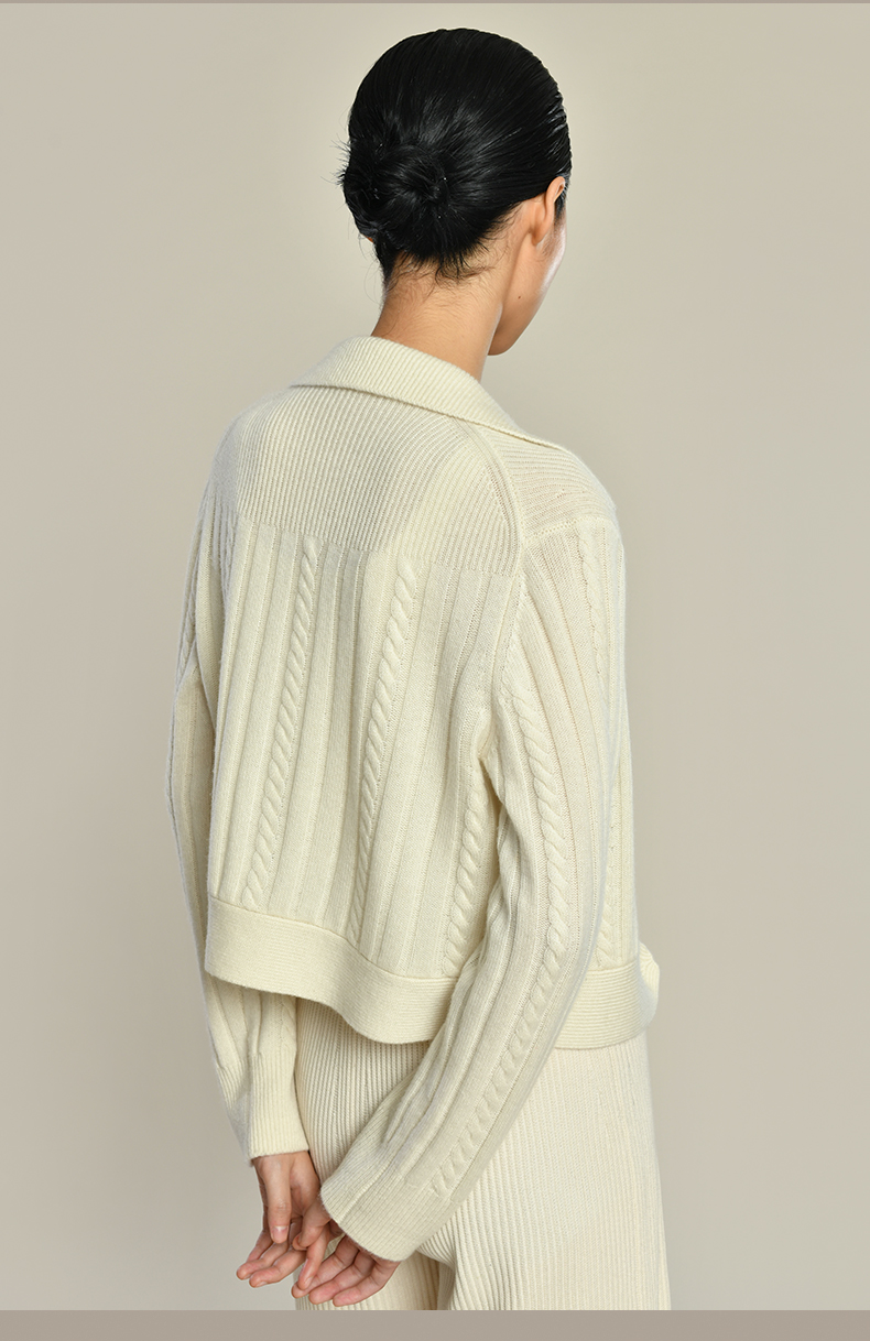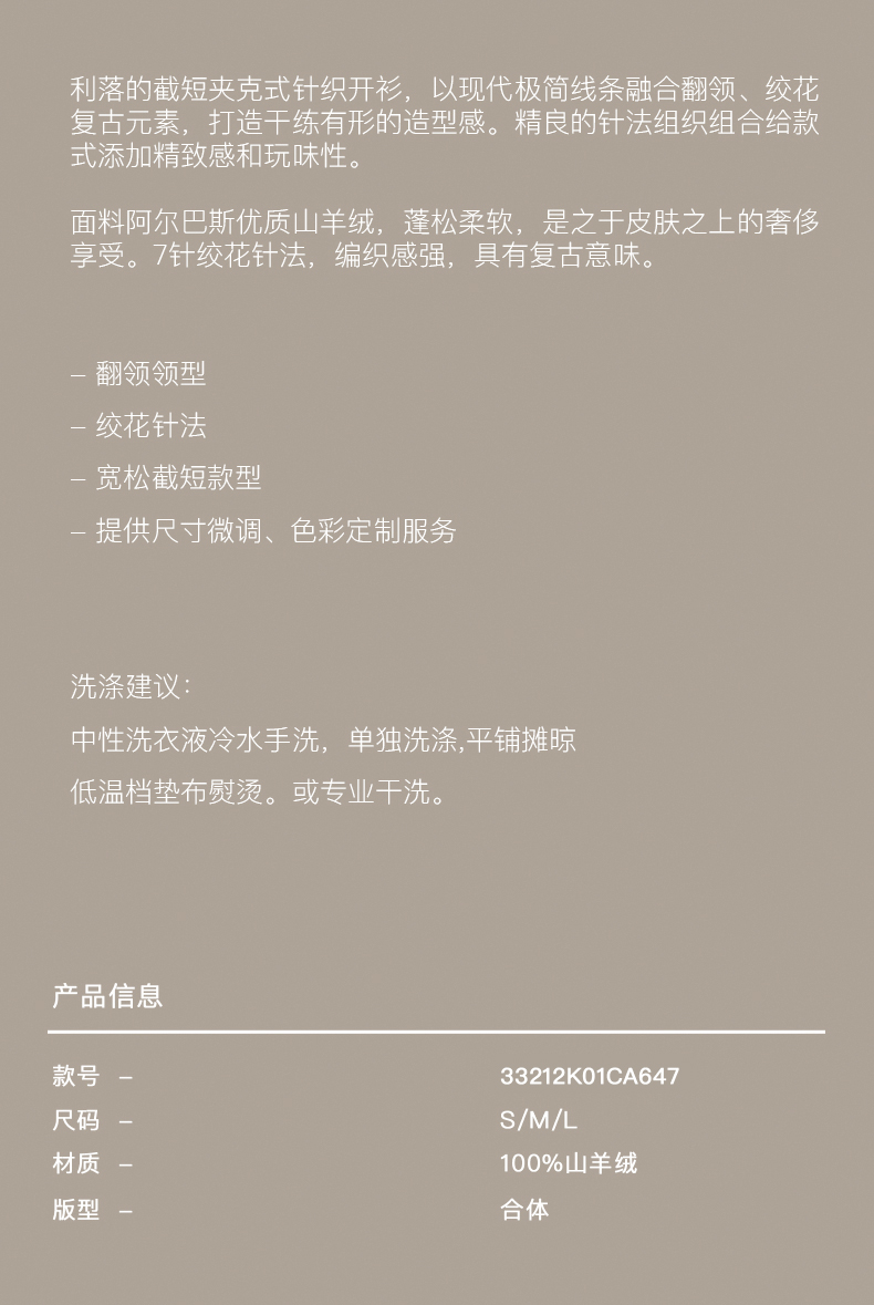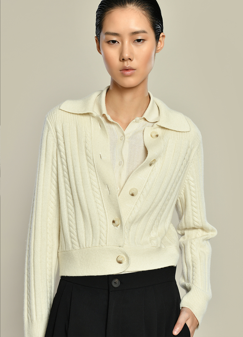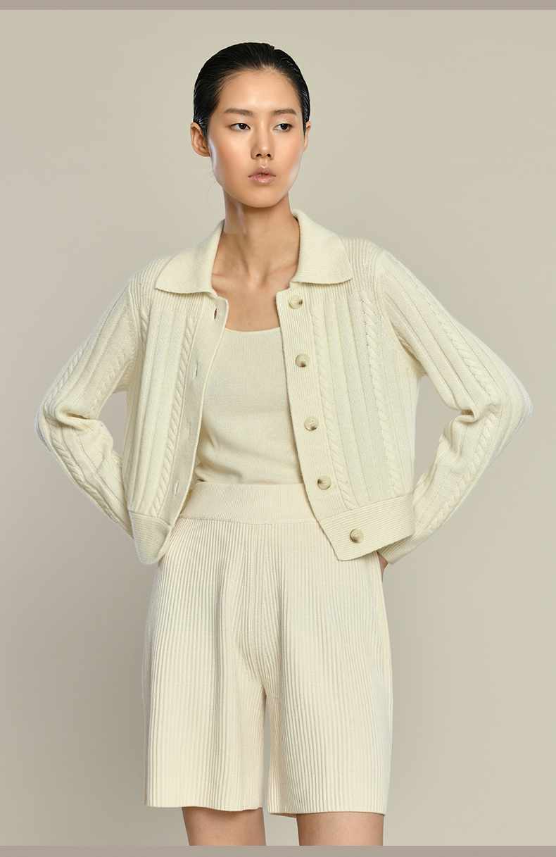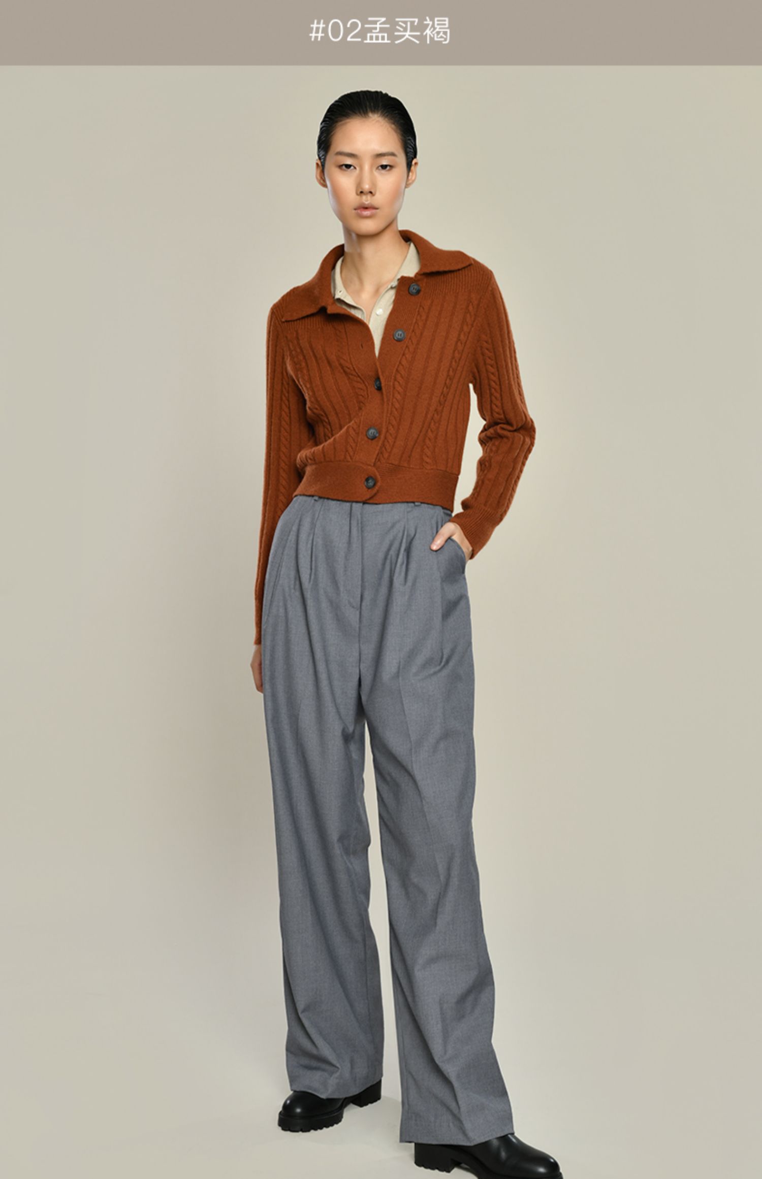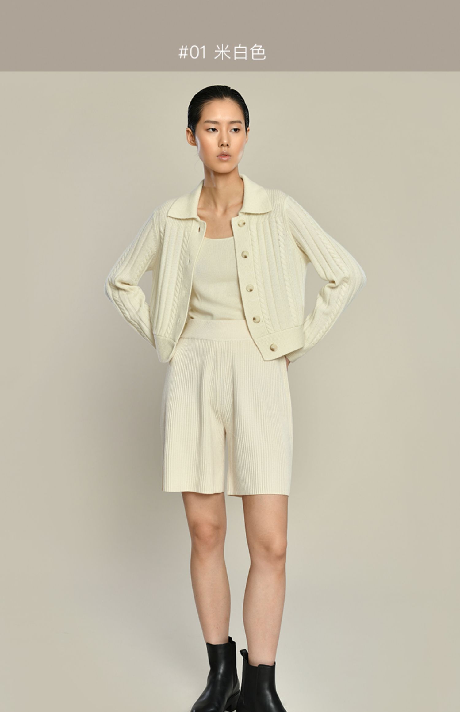 女士2021新款纯山羊绒翻领短款绞花开衫