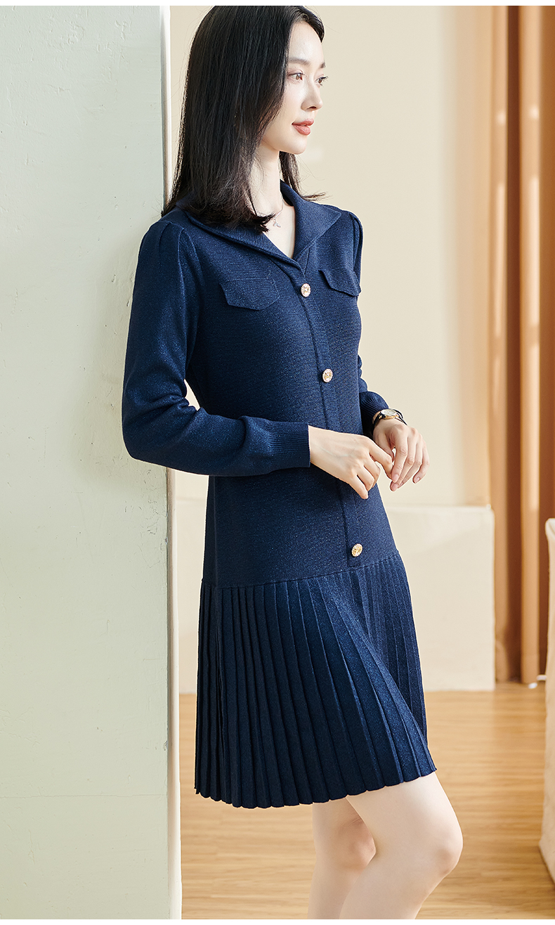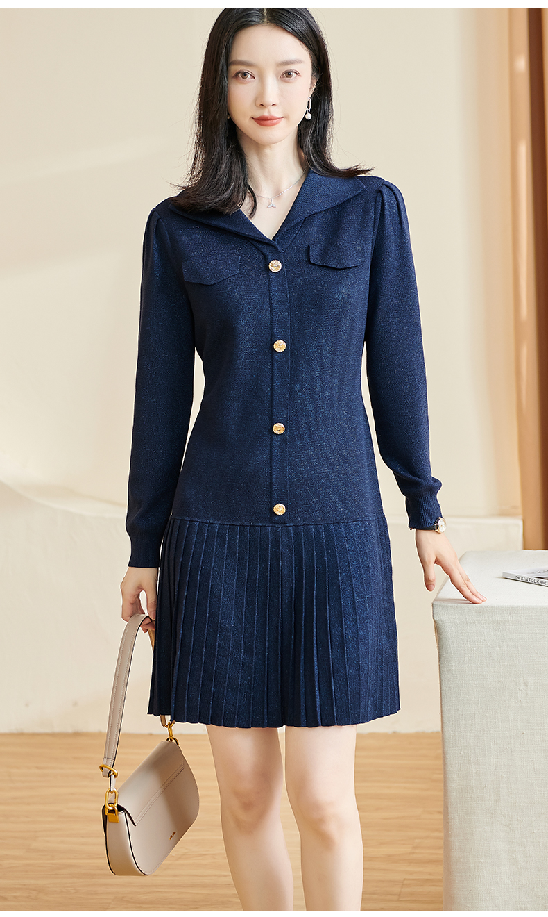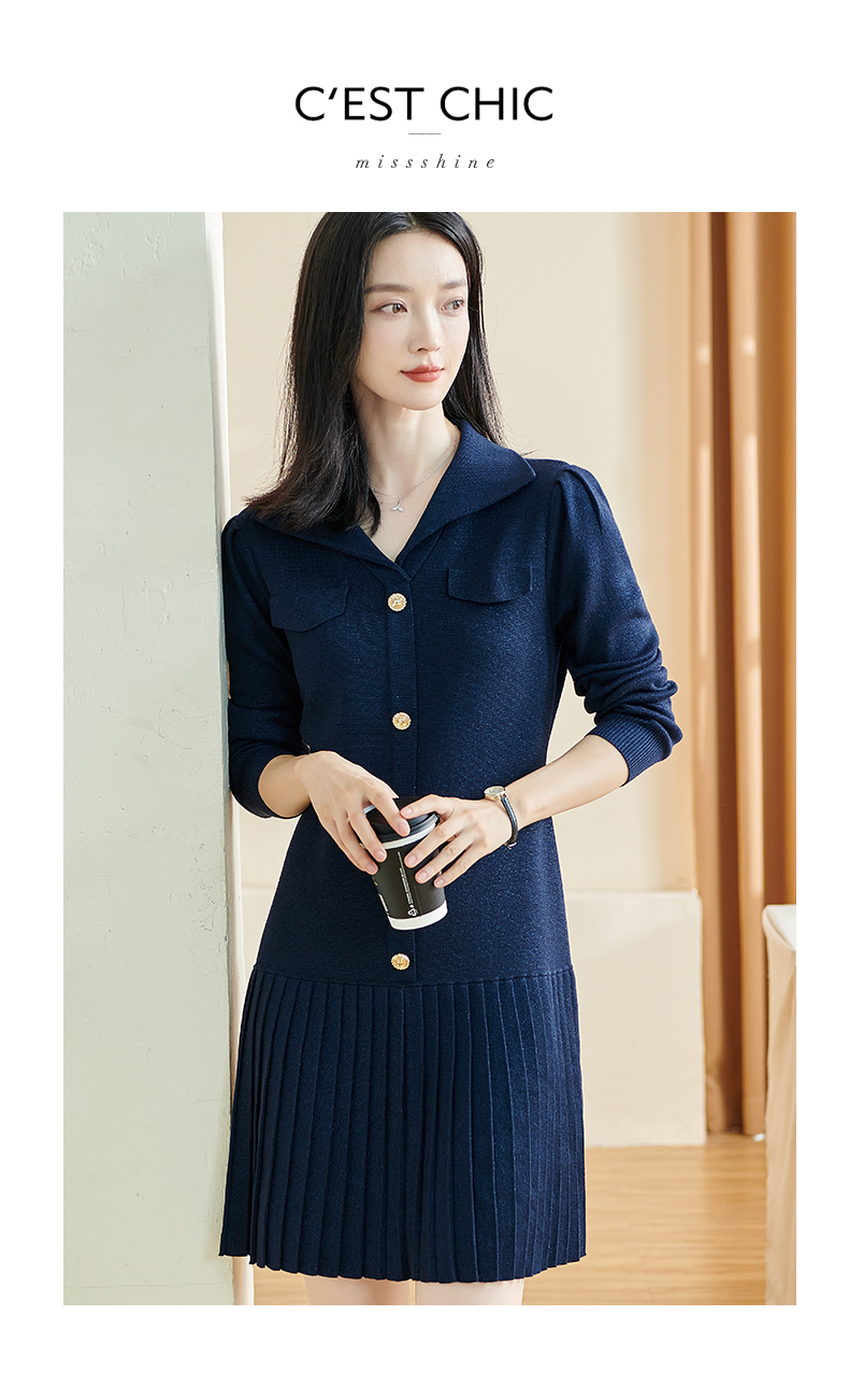 剩S/M 米思阳2025秋冬季新款时尚设计感藏蓝色连衣裙亮丝减龄百褶裙子3086