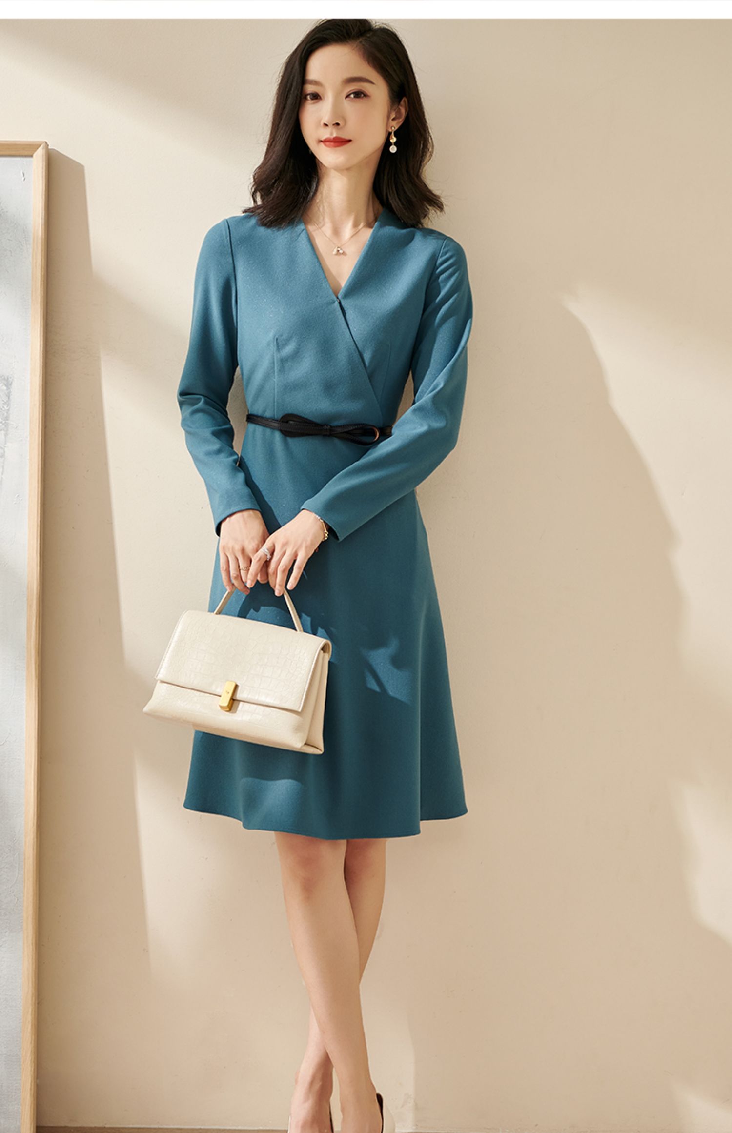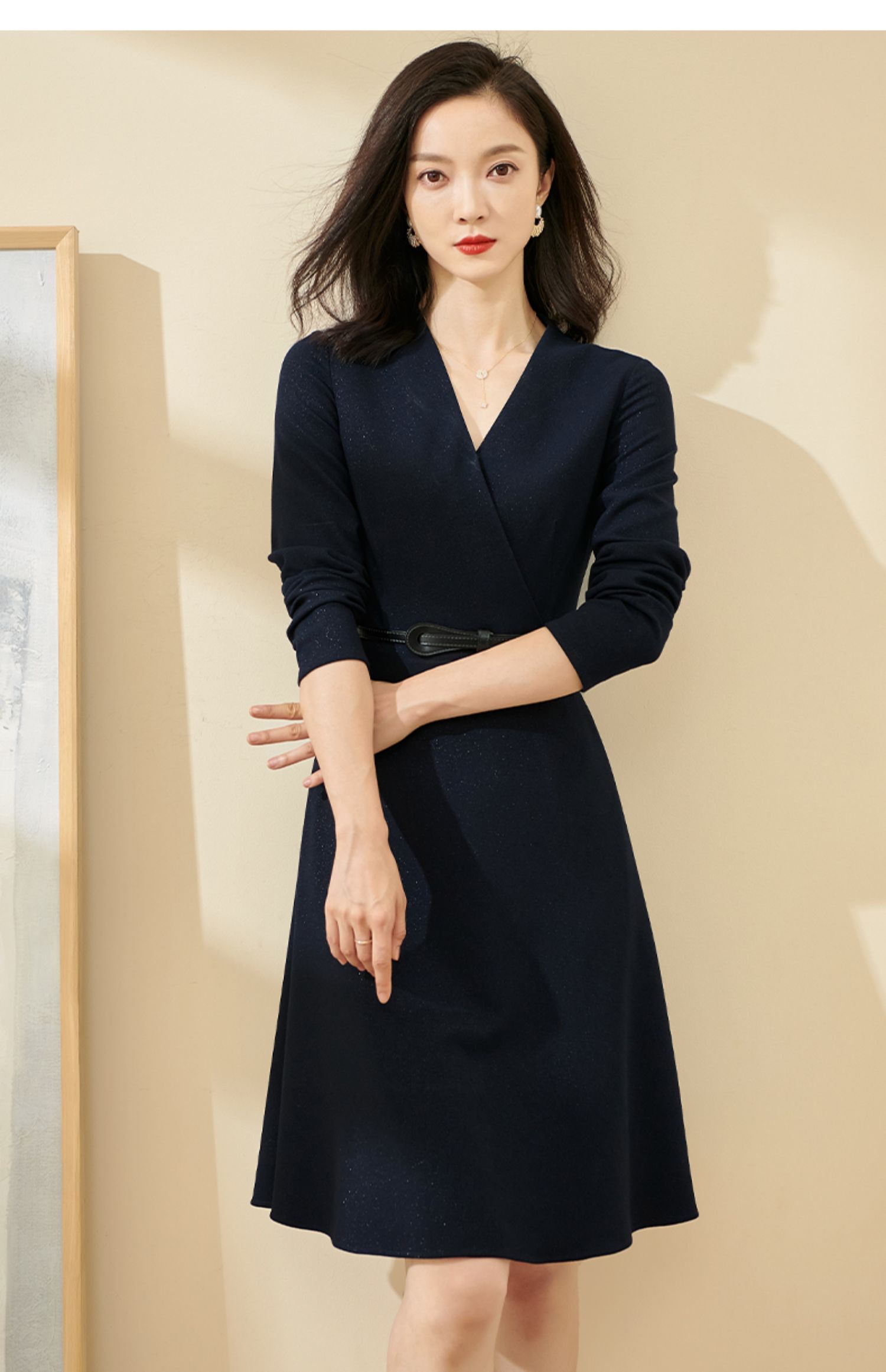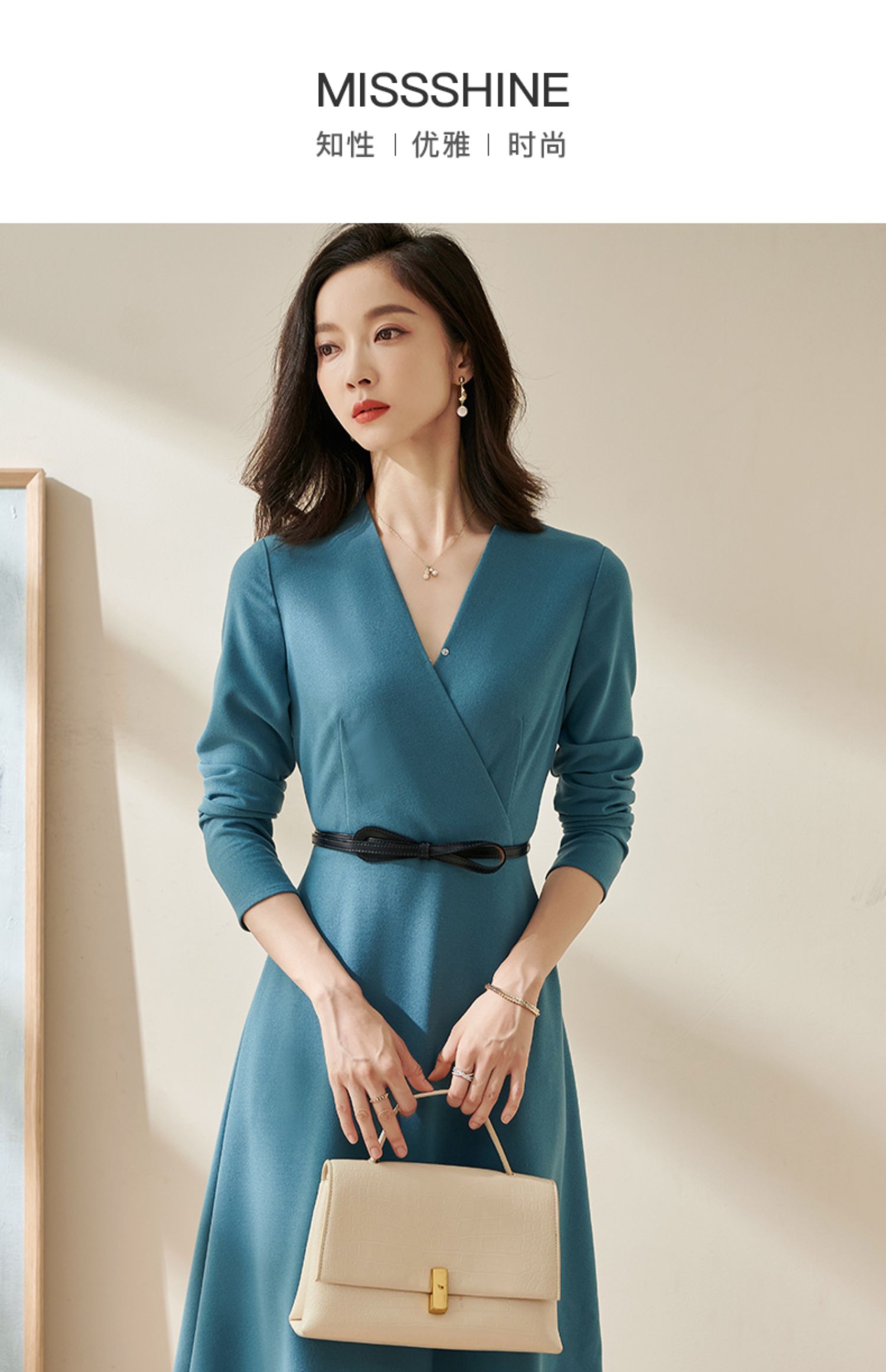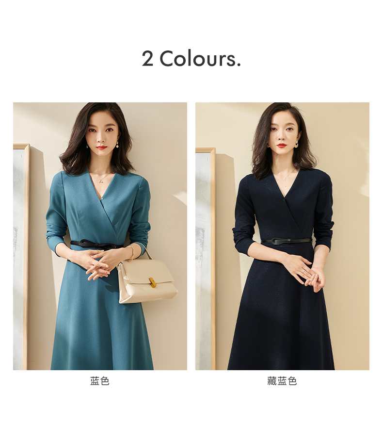剩S/M/L/XL 米思阳2025春季新款轻熟连衣裙春装纯色简约长袖v领通勤气质a字裙1746