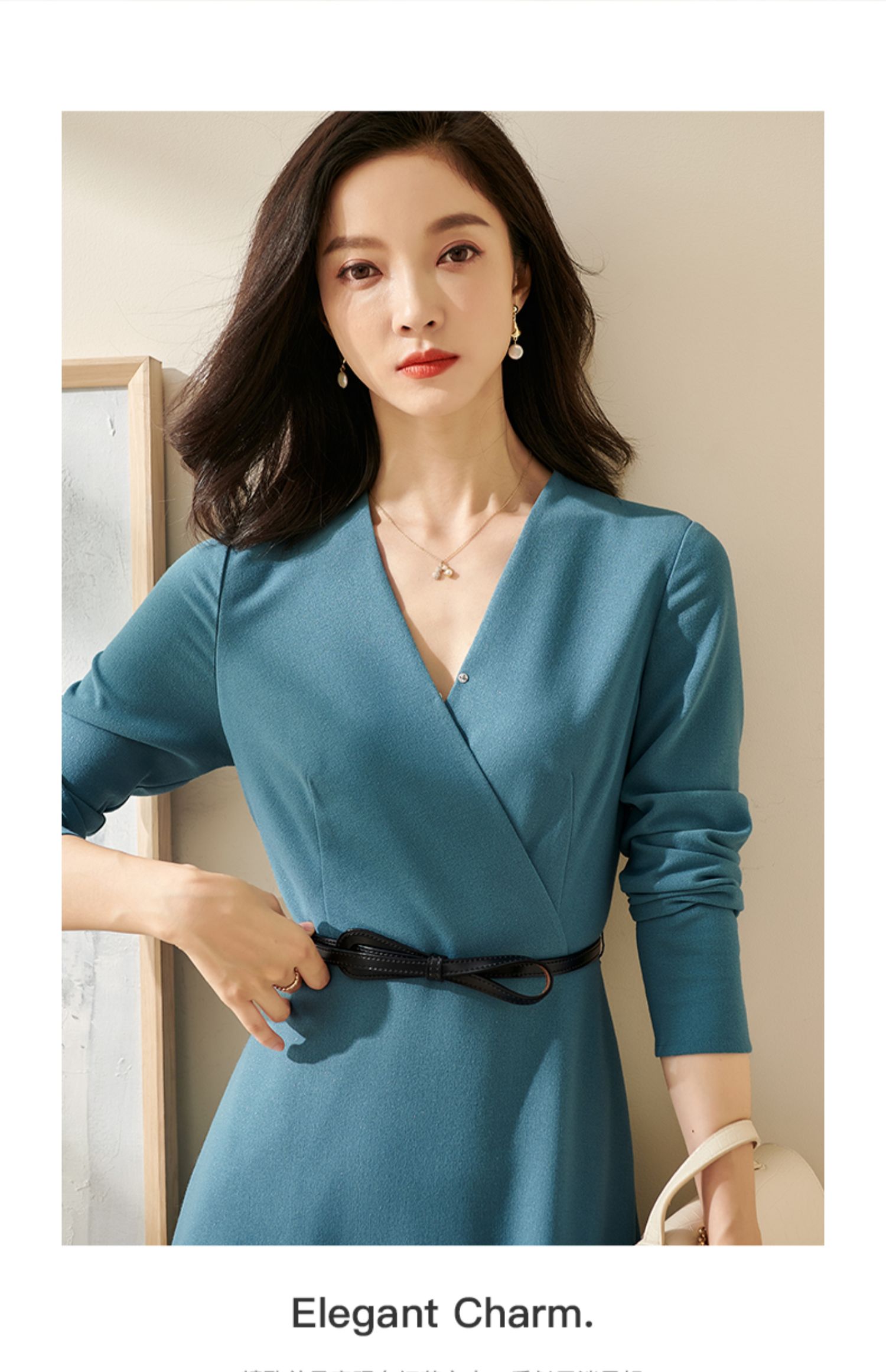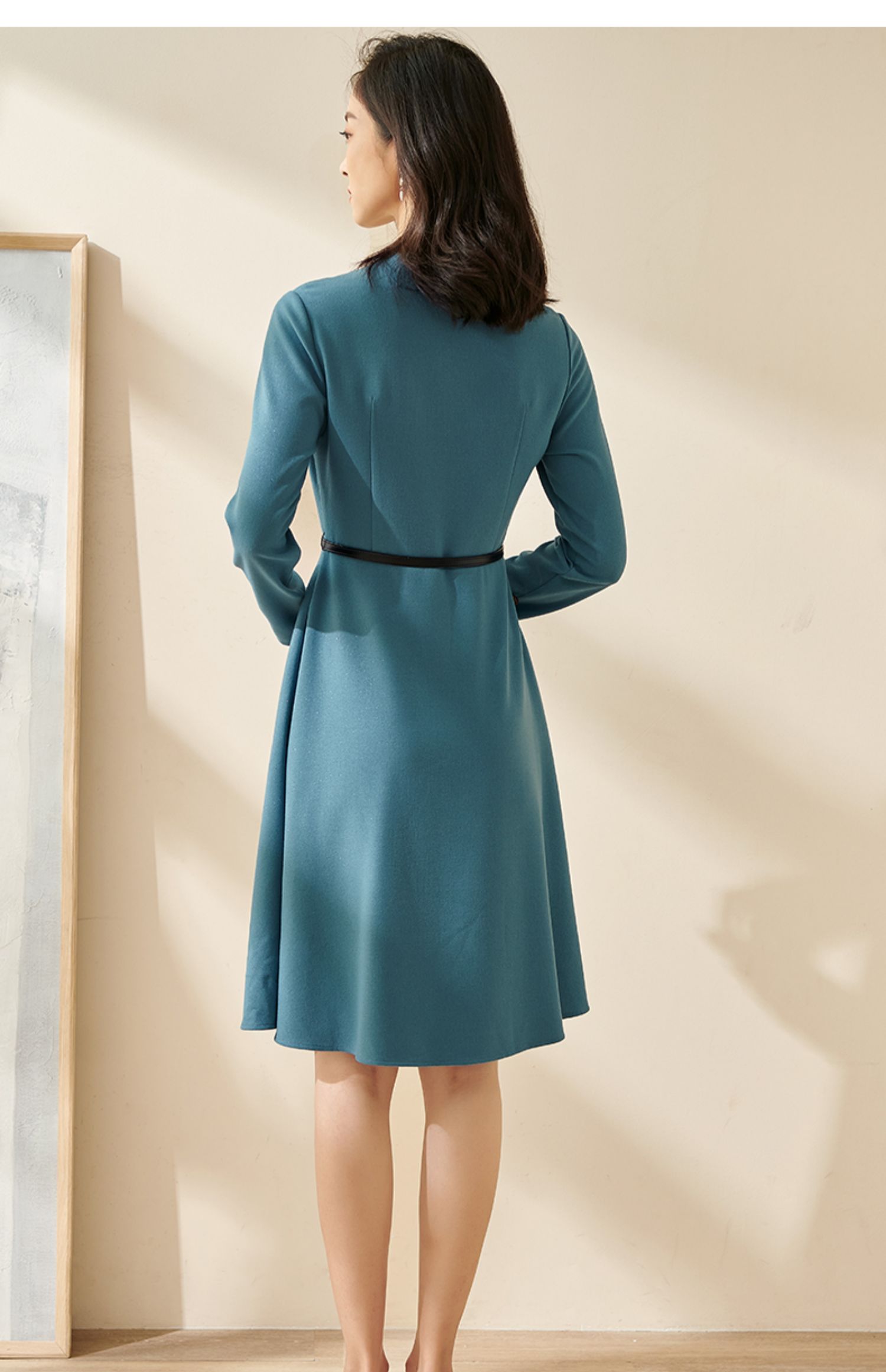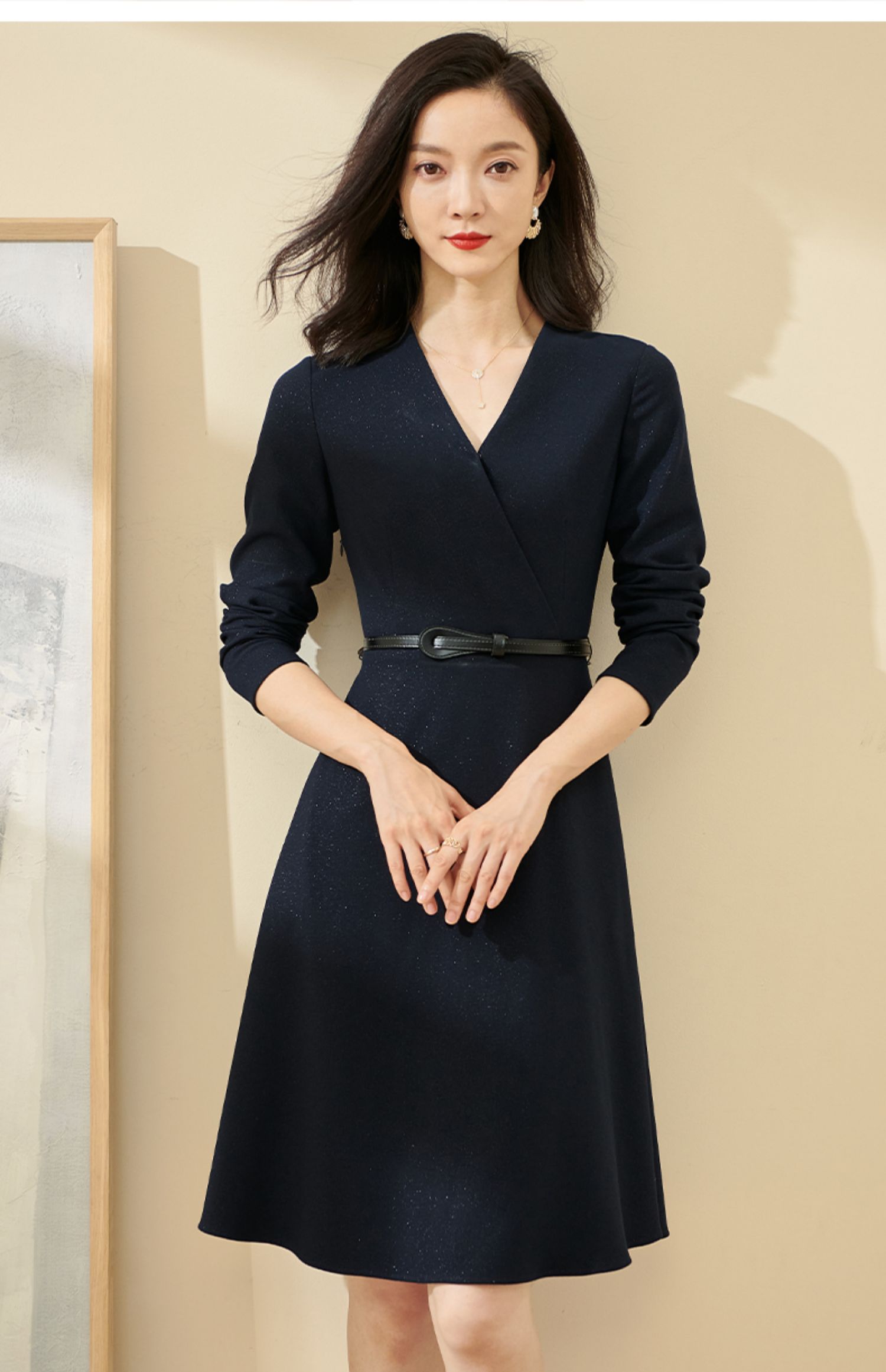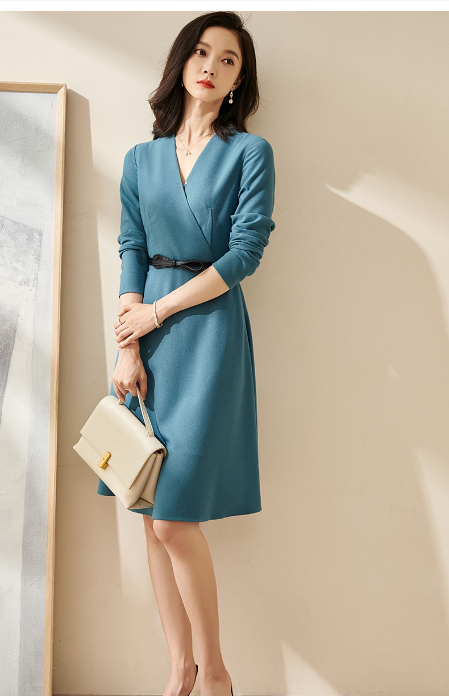 剩S/M/L/XL 米思阳2025春季新款轻熟连衣裙春装纯色简约长袖v领通勤气质a字裙1746