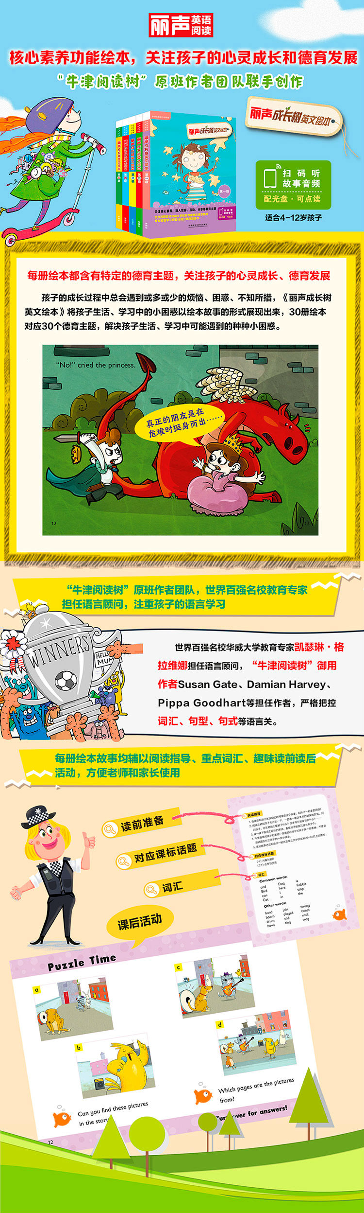 2.牛津阅读树原班作者团队创作,世界百强名校华威大学教育专家担任语言顾问,对词汇的选择、词汇量、句长、句式、复现等精心把控,专为小朋友的语言学习而设计;