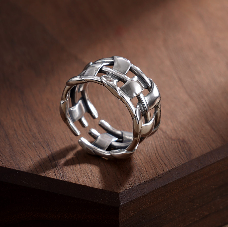 【寓意】:戒指采用纯银材质打造,表面打磨光滑,质感细腻。立体的编织纹理造型,简约干净,于细节之处彰显品味。
