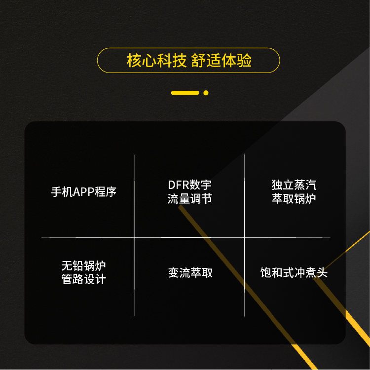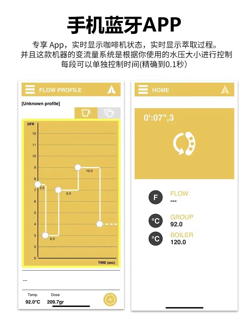 5.智能萃取:蓝牙app程序,手机与咖啡机的智能互动,预设所有机器的参数,可以记录每一杯的萃取参数,观察萃取状态,创建不同的萃取方案。