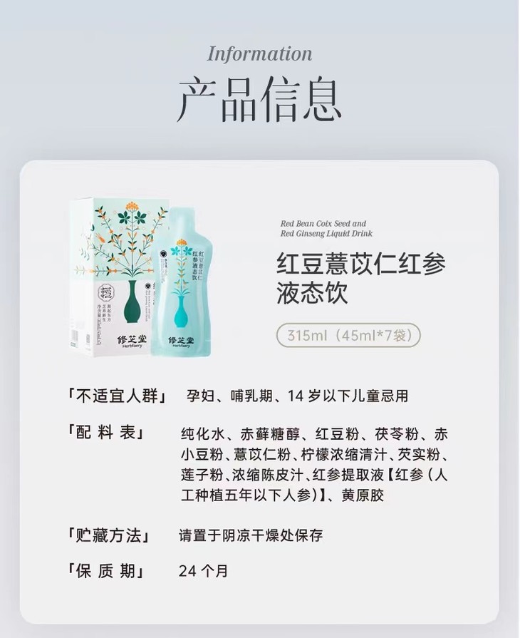 【新品推荐】修芝堂红豆薏米饮,10倍浓缩添加红参,姿美堂集团品牌,45ml*7袋/盒