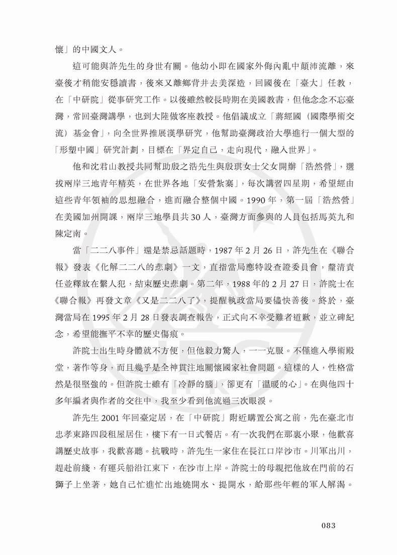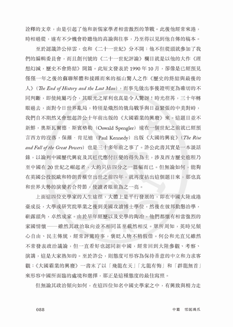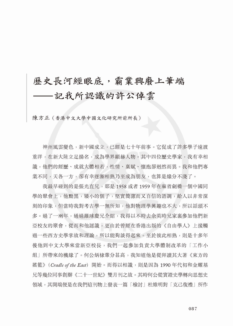本書用50篇文章記錄了許倬雲先生與40位學者的交往,涉及中國文化、歷史學傳承、知識份子的定位與中美關係等眾多議題,堪稱一場思想家之間的深度對話。