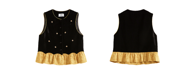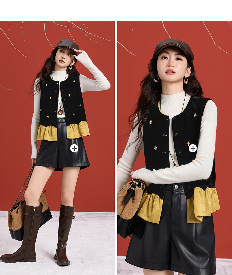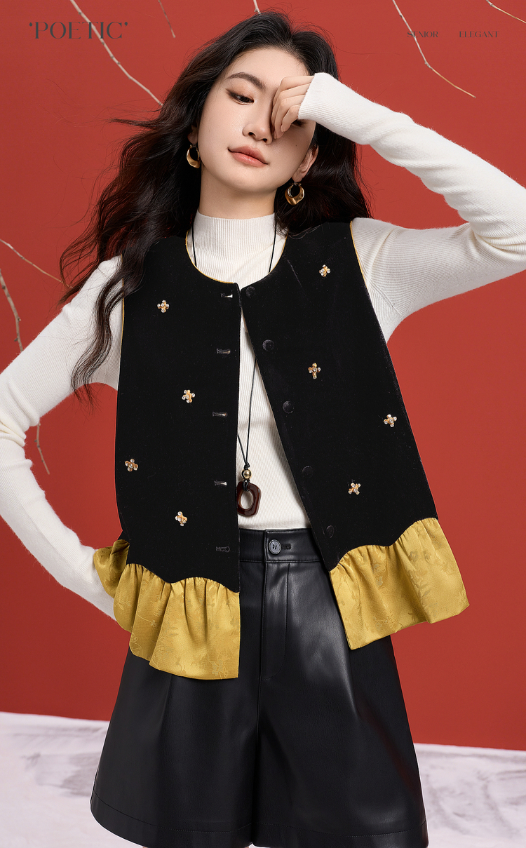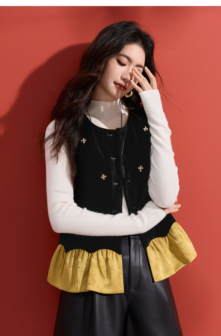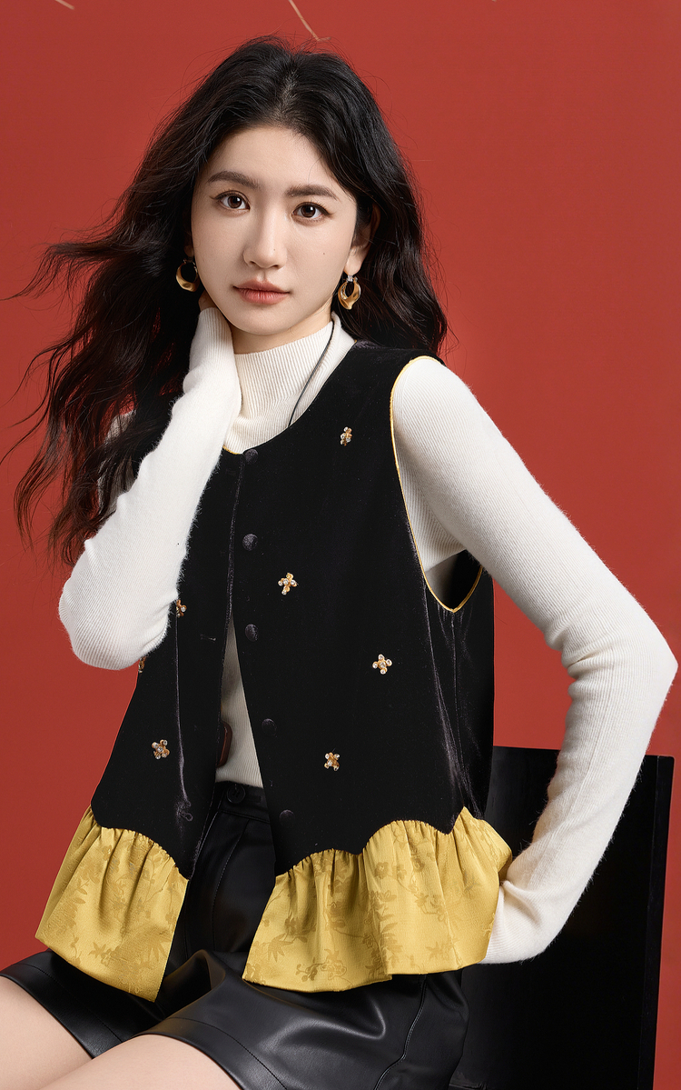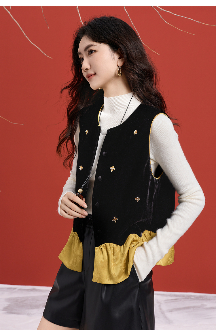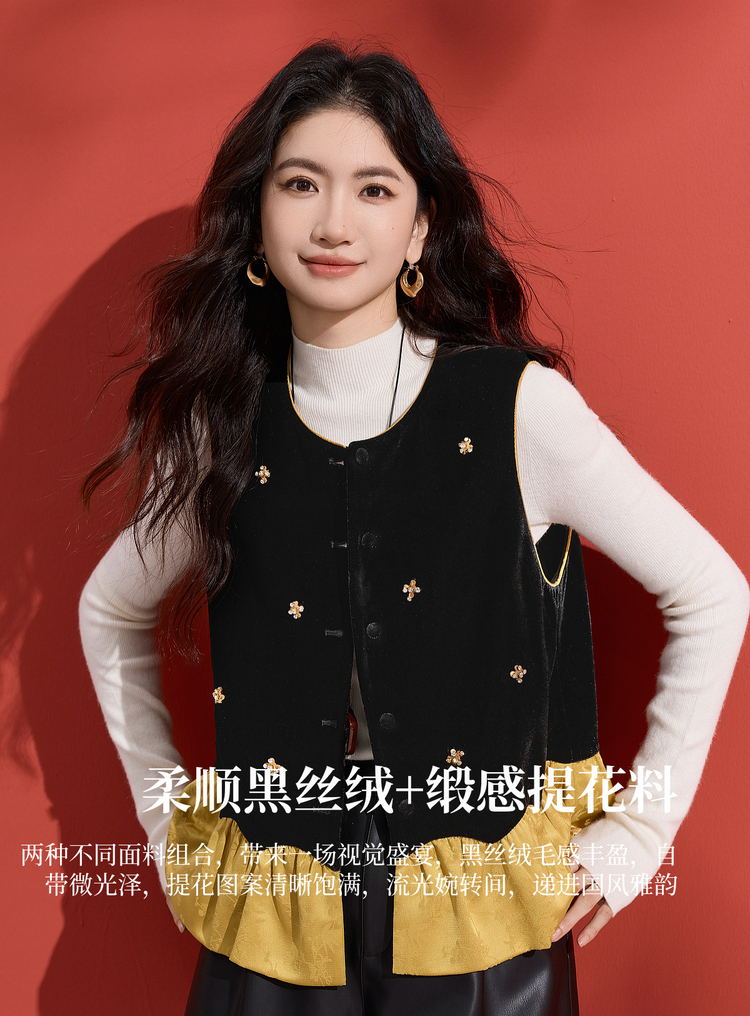 【12/10新品6折】熙世界新中式提花拼接花苞金丝绒马甲女秋冬国风叠穿坎肩背心上衣