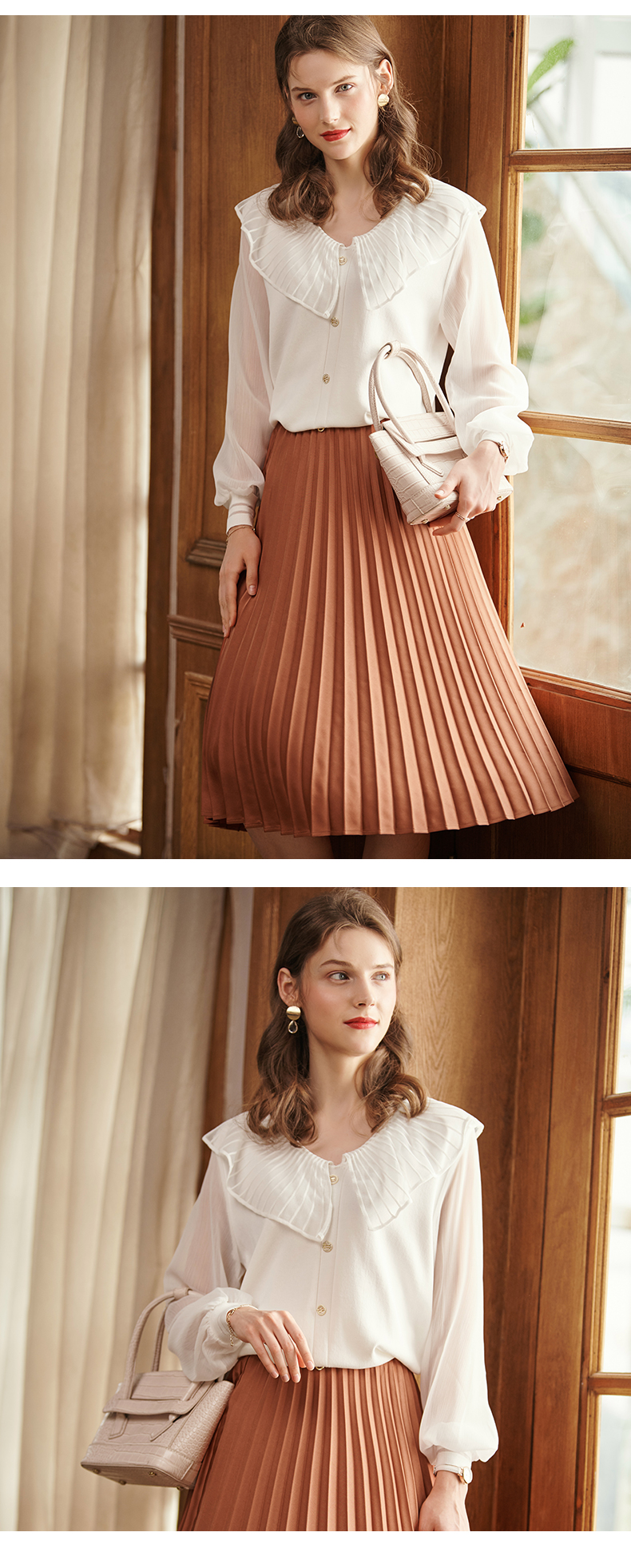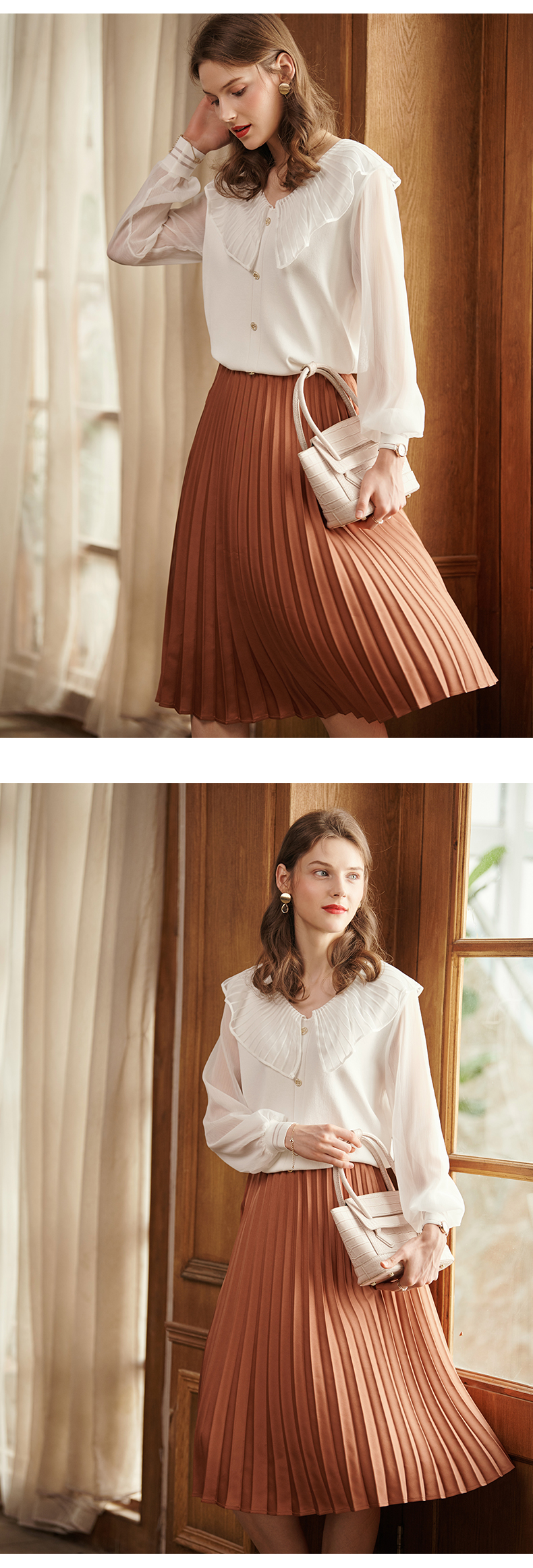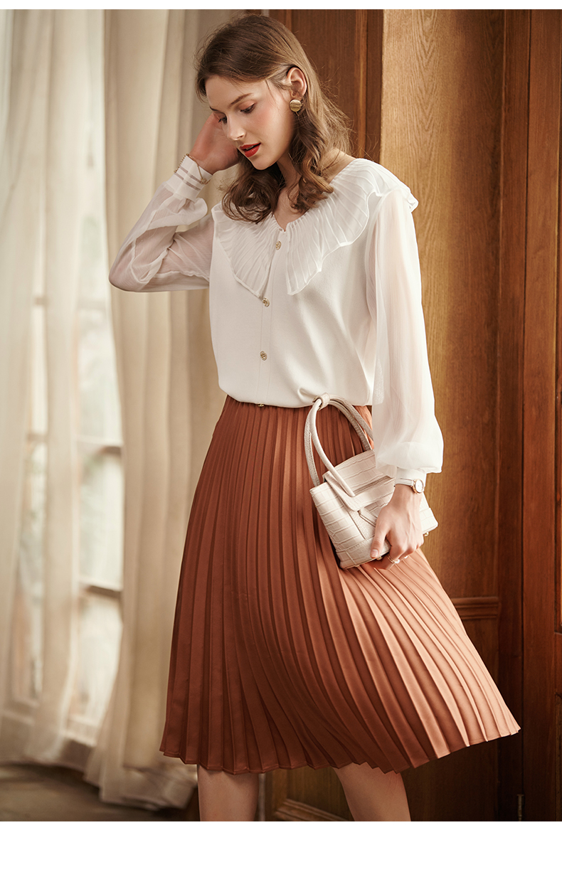 满满秋冬气息的焦糖色百褶半裙,